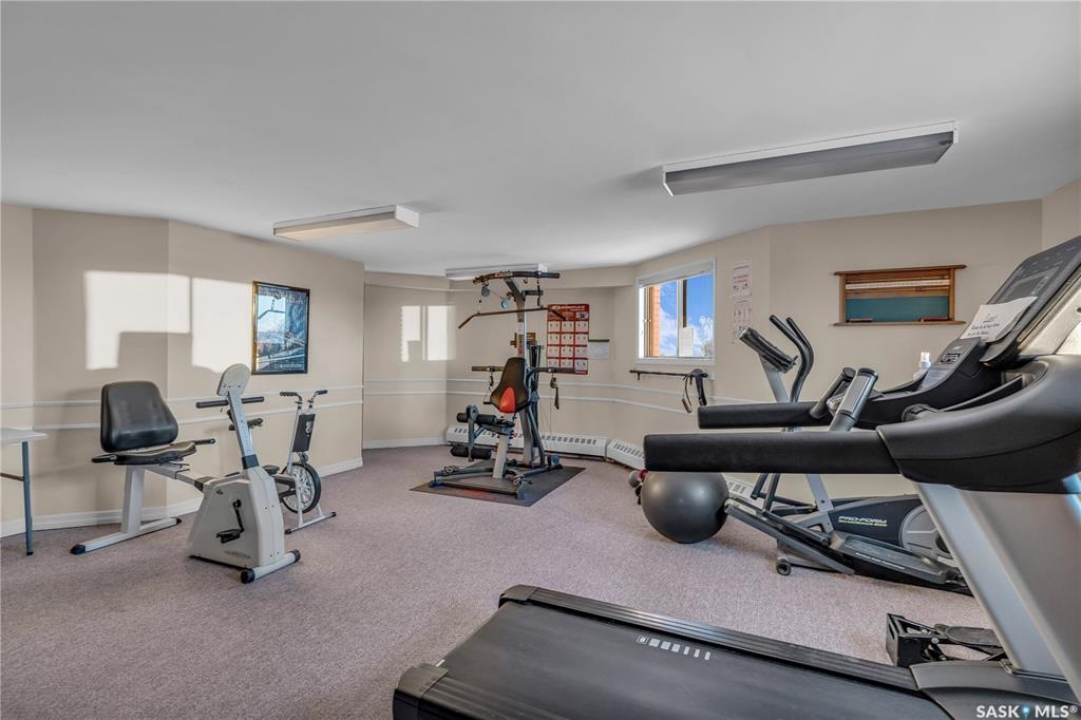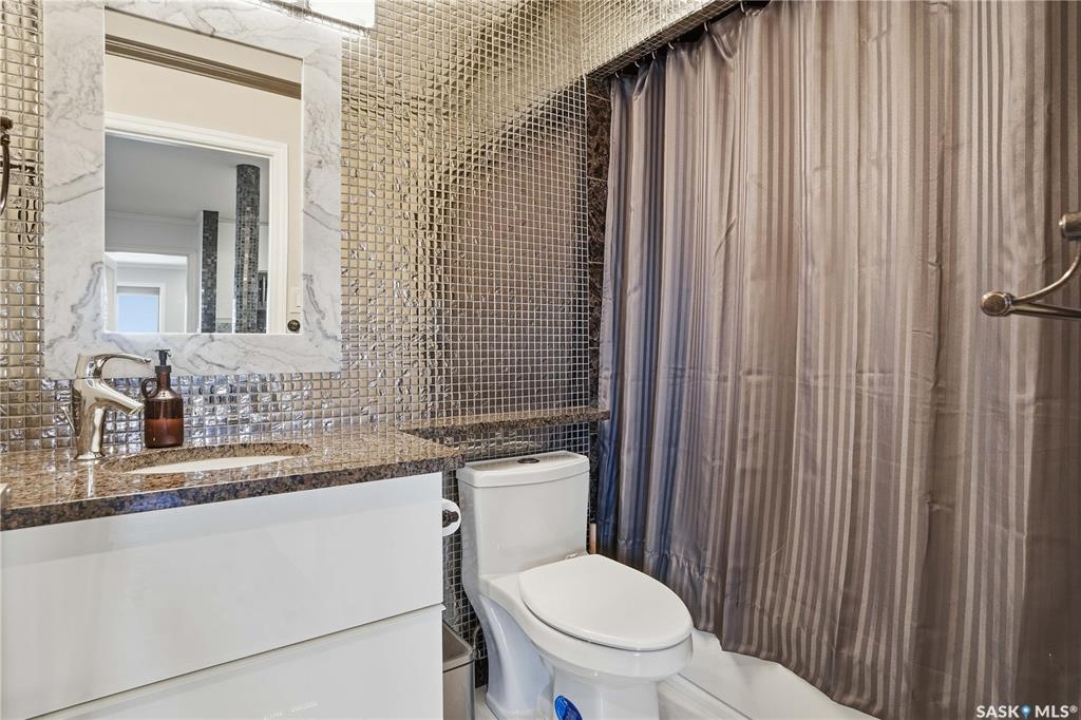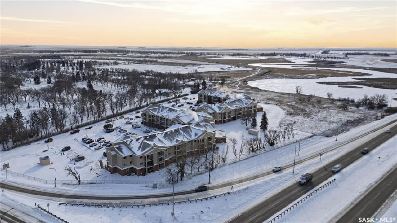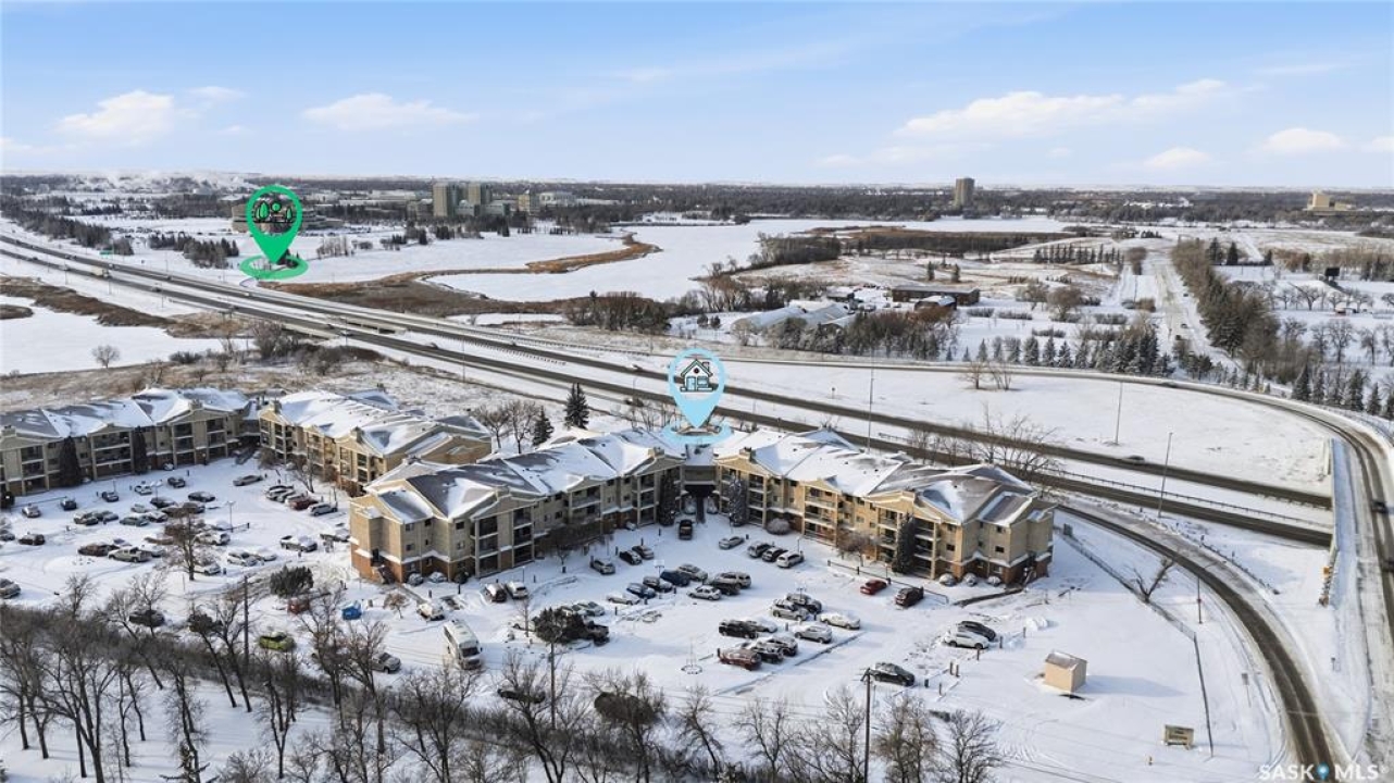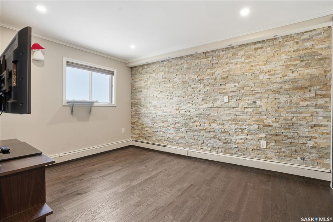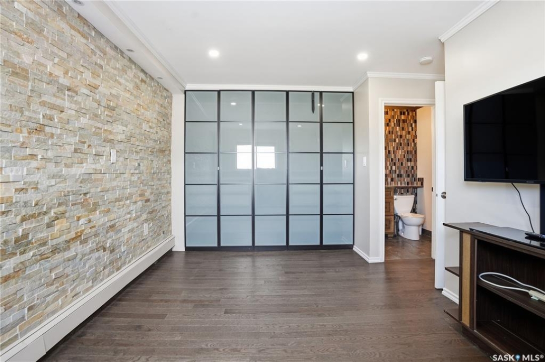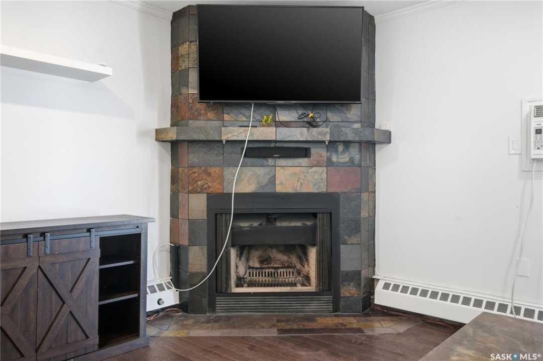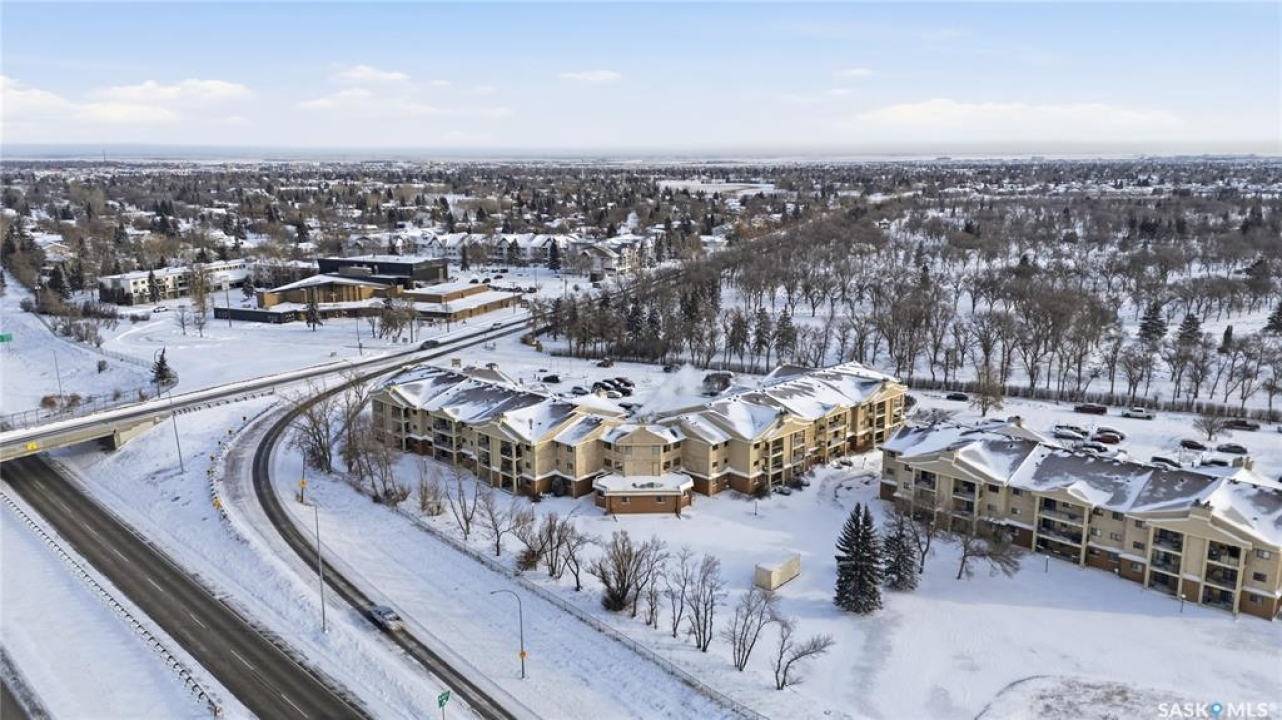 Welcome to a truly rare opportunity in The Gardens. This stunning, completely renovated top-floor corner unit offers 1,066 sqft of sophisticated living space, unlike anything else on the market at this price point. Step inside to find gleaming white ceramic tile flowing through the entry, laundry, and dining areas. The heart of the home is the showpiece kitchen, fully remodeled with high-gloss white cabinetry, granite countertops, a sprawling eat-up island, and sleek black stainless steel appliances. Enhanced by custom Lutron lighting, this space opens to a spacious dining area perfect for hosting, and a cozy den tucked just off the kitchen. The living room is designed for relaxation, featuring rich hardwood floors, a corner wood-burning fireplace framed by custom stone tiling, and patio doors leading to a covered deck with serene views of Wascana Lake. The unit offers two generous bedrooms, including a master suite with a custom closet organizer and a convenient 2-piece ensuite. Both bathrooms have been meticulously updated, with the main 4-piece bath showcasing a custom shower and impressive tile work. Practicality meets luxury with a massive laundry room offering freezer space, plus an additional in-suite storage closet. Located just steps from the walking paths of Wascana Park, the U of R, and Sask Polytechnic, this condo is perfectly positioned for an active lifestyle. Note: An additional parking stall may be available for rent if required.