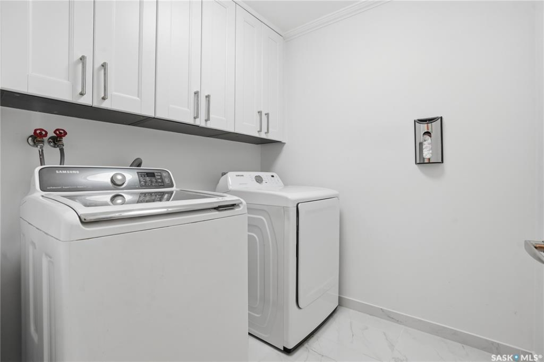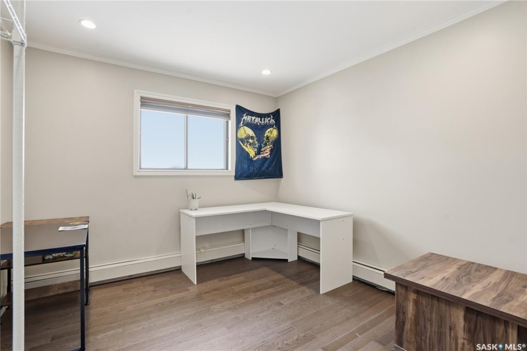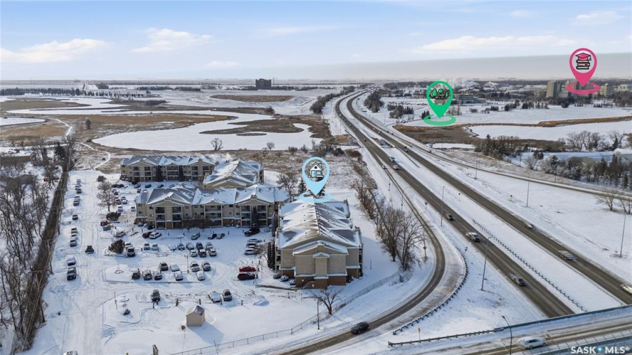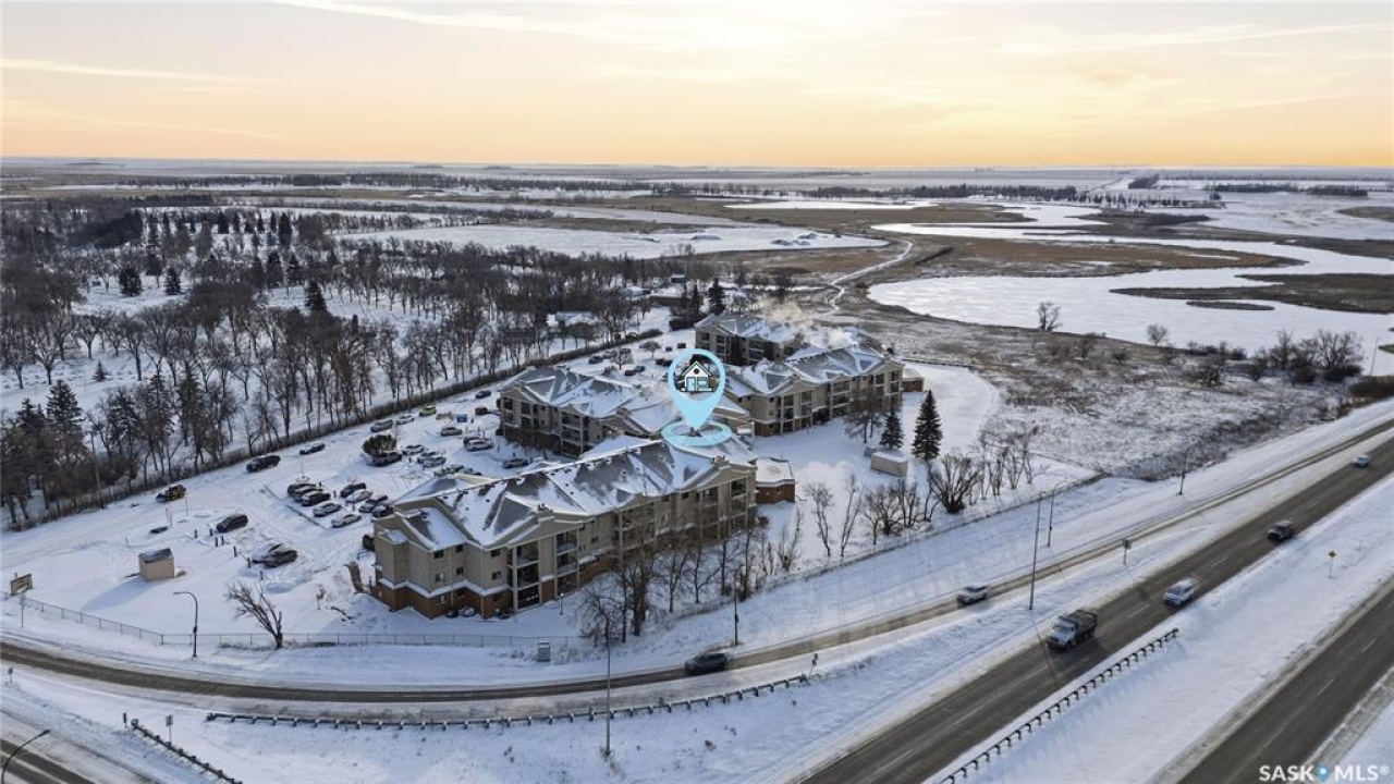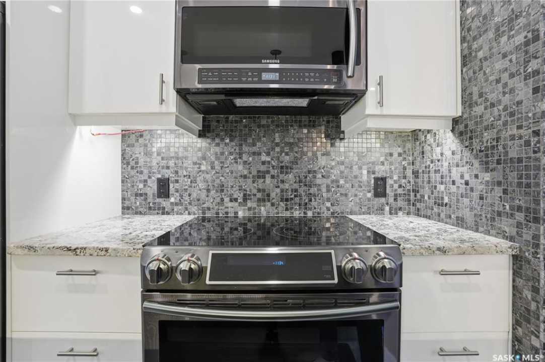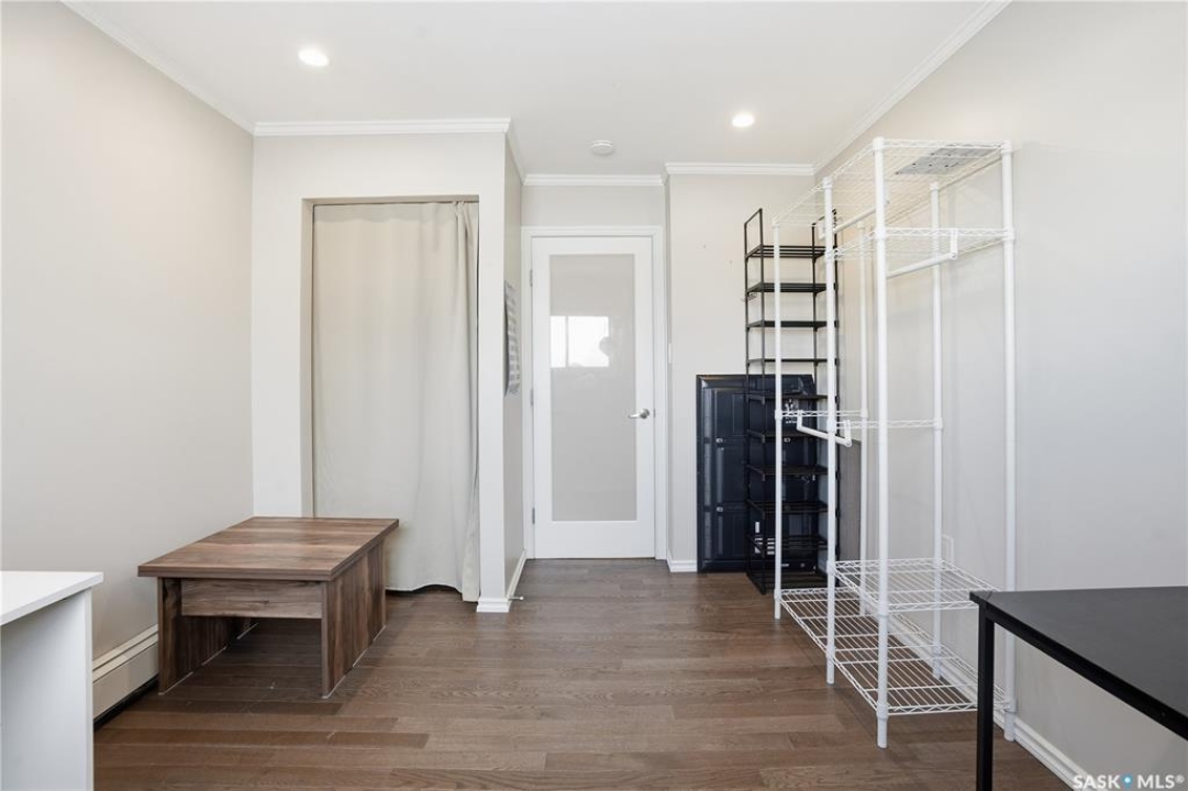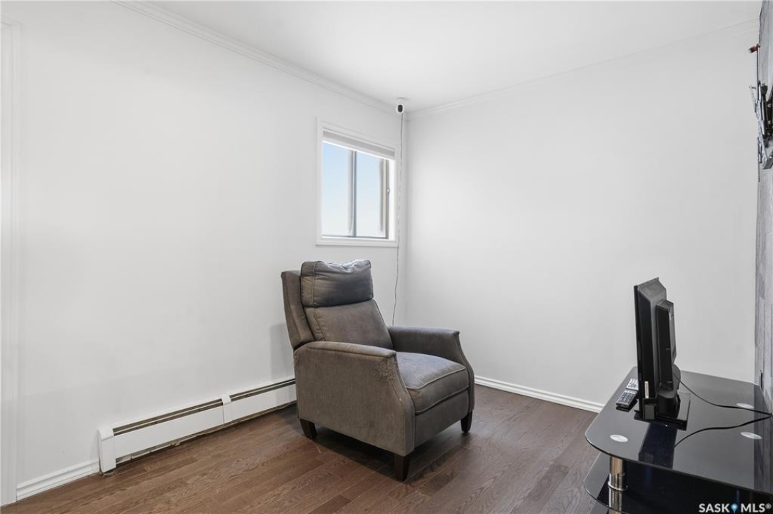 Welcome to a truly rare opportunity in The Gardens. This stunning, completely renovated top-floor corner unit offers 1,066 sqft of sophisticated living space, unlike anything else on the market at this price point. Step inside to find gleaming white ceramic tile flowing through the entry, laundry, and dining areas. The heart of the home is the showpiece kitchen, fully remodeled with high-gloss white cabinetry, granite countertops, a sprawling eat-up island, and sleek black stainless steel appliances. Enhanced by custom Lutron lighting, this space opens to a spacious dining area perfect for hosting, and a cozy den tucked just off the kitchen. The living room is designed for relaxation, featuring rich hardwood floors, a corner wood-burning fireplace framed by custom stone tiling, and patio doors leading to a covered deck with serene views of Wascana Lake. The unit offers two generous bedrooms, including a master suite with a custom closet organizer and a convenient 2-piece ensuite. Both bathrooms have been meticulously updated, with the main 4-piece bath showcasing a custom shower and impressive tile work. Practicality meets luxury with a massive laundry room offering freezer space, plus an additional in-suite storage closet. Located just steps from the walking paths of Wascana Park, the U of R, and Sask Polytechnic, this condo is perfectly positioned for an active lifestyle. Note: An additional parking stall may be available for rent if required.