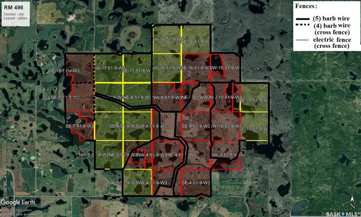 Exceptional Mixed Farm & Ranch Package – Highly Productive & Well Improved Rare opportunity to acquire a large, contiguous mixed farm and ranch offering an excellent balance of cultivated land, productive pasture, abundant water, and extensive infrastructure. The deeded land totals approximately 3,704 acres (27 parcels) with 561 cultivated acres and a strong soil rating (49.7 weighted average), complemented by 2,072 leased acres (13 parcels) primarily in native pasture. The property features 31+ miles of fencing, 10 well-designed paddocks for rotational grazing, numerous dugouts, lakes, and sloughs, and miles of internal trails with RM road access. Approximately 422 acres of tame grass plus extensive native pasture provide outstanding forage. Proven crop performance includes canola up to 60 bu/ac, wheat up to 100 bu/ac, and oats exceeding 150 bu/ac. Grazing capacity supports approximately 500 cow-calf pairs or 1,000+ yearlings in most years. Improvements include a 40' x 80' heated shop, a 60' x 150' cold storage building (2024) suitable for large equipment or potential calving barn, and a drive-over scale capable of weighing cattle and grain. Optional grain and fertilizer storage may be available (relocation required). Additional highlights include scenic rolling terrain, strong water supply, gravel potential, and possible future oil and gas development. A highly efficient, turnkey agricultural operation with long-term value.