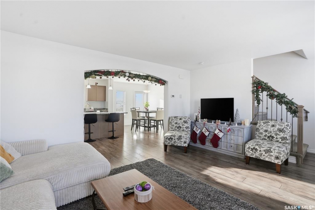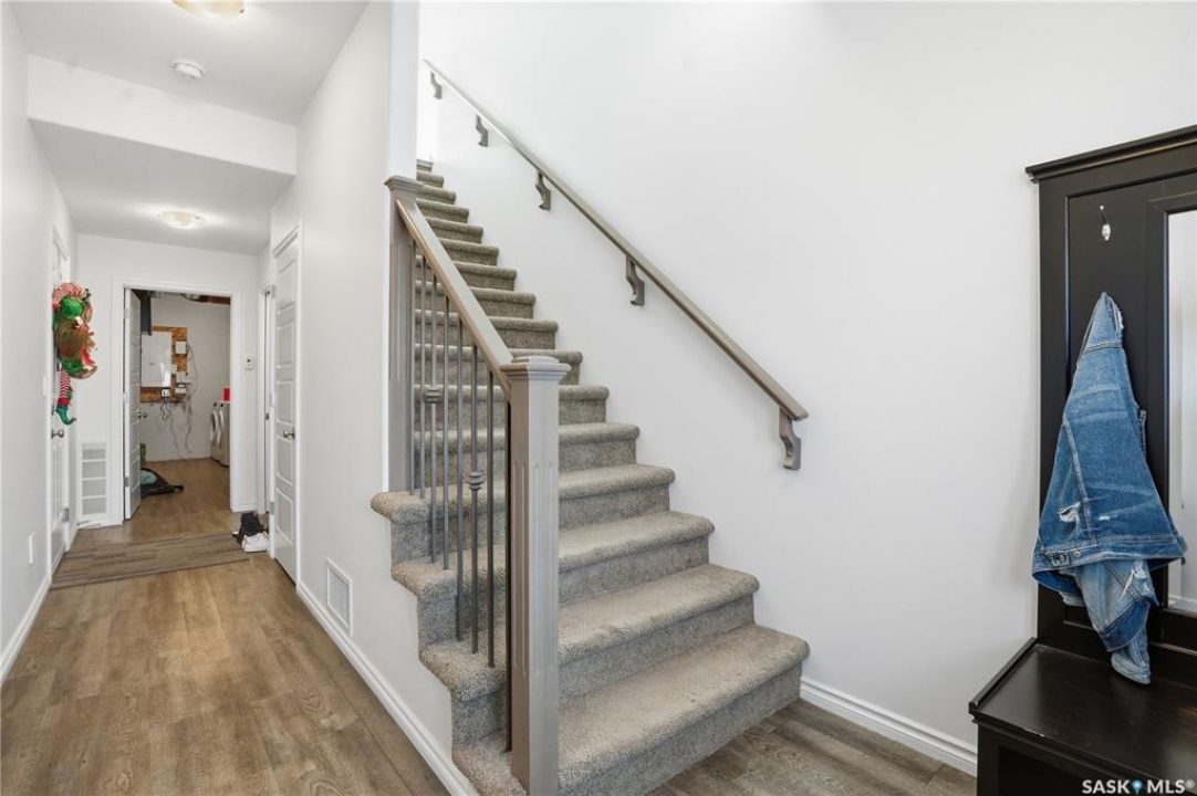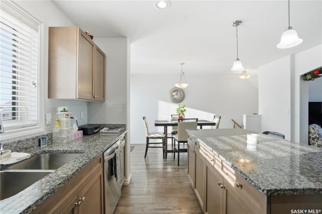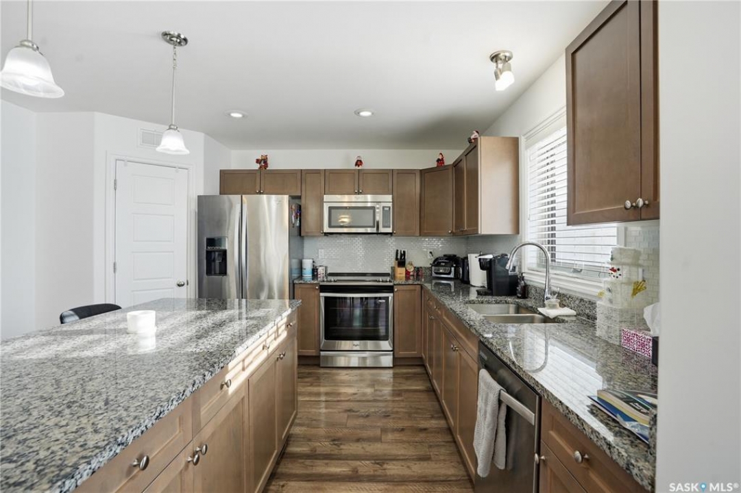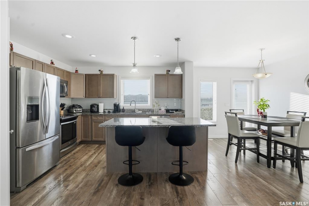 Beautifully maintained 3-bedroom, 3-bath townhouse located in the desirable neighborhood of Kensington. Thoughtfully cared for and move-in ready, this home is an excellent choice for buyer's seeking both functionality and style. Upon entry, you're welcomed by a spacious foyer with direct access to the oversized single attached garage. Measuring an impressive 29'x13', the garage offers exceptional versatility—ideal not only for parking but also as a home gym or additional storage space. There is room to expand the length of the garage if necessary to over 40ft long. The heart of the home is the large kitchen, designed to impress and perfect for cooking and entertaining. It flows seamlessly into a generous living room and the patio doors off the dining area open to a large, south-facing balcony—a wonderful space for outdoor dining, relaxing, or soaking in the sun. Upstairs, you'll find three well-appointed bedrooms and two full bathrooms. The spacious primary bedroom has a walk-in closet and 4 piece bathroom. Located just minutes from shopping centers, grocery stores, restaurants, gas stations, and hardware stores, this home offers unmatched convenience. Schools, parks, and other everyday amenities are also nearby, making this an exceptional opportunity to enjoy comfortable living in one of Saskatoon's newest neighborhoods..