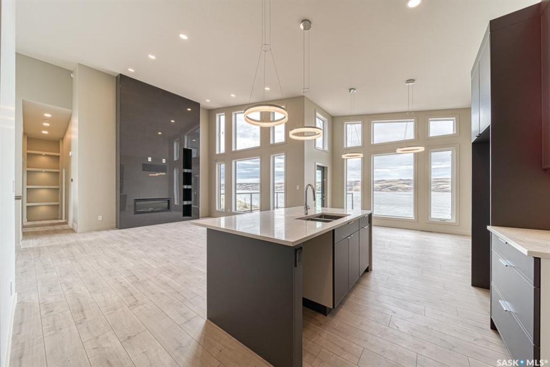 Words fail to describe this exceptional lakefront home! 12 Sunset Boulevard in the Resort Village of North Grove defines a legacy lifestyle property on Buffalo Pound Lake! Stunning contemporary design begins with a 4-car attached garage ushering you into the fabulous bungalow-style home (2037 sq/ft on main level), with, of course, a walkout lower level specifically designed to surround you with panoramic lake views! Open concept design with vaulted ceilings, perfect kitchen design with central island, separate pantry room, dining area that steps onto a spacious deck overlooking the lake, and of course, the gas fireplace provides a wonderful family-centric home! The main floor flows from the entry area to a full bath, a bedroom or office space, and then to the amazing primary suite with a lovely bath, dual sinks, soaking tub, walk-in shower, leading to an amazing dressing room! When you enter from the garage (45'X28'), you find a perfect space that has outdoor access for a games room, fitness centre, home office, studio,... amazing! Yes, there is also a mudroom space before entering! The lower level steps into a fantastic family room with a wet bar area, Opti-mist fireplace, plus access to the covered, & screened patio,....WOW!! Of course, there is a media room, 2 bedrooms, a full bath, laundry room, and a utility/storage area! Now, step outside to relax with nature that has trees, access to the lake, retaining walls, a firepit area,... views that you will never tire of! This newly constructed and never-lived-in home is a one-of-a-kind opportunity! If desired, the lot #13, west of the property can be purchased separately, MLS# SK010137! Be sure not to miss this amazing place at the lake to call home! Drone shots + 3D scan of the interiors with 360s of the outdoor spaces are available for you!