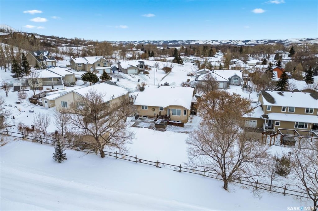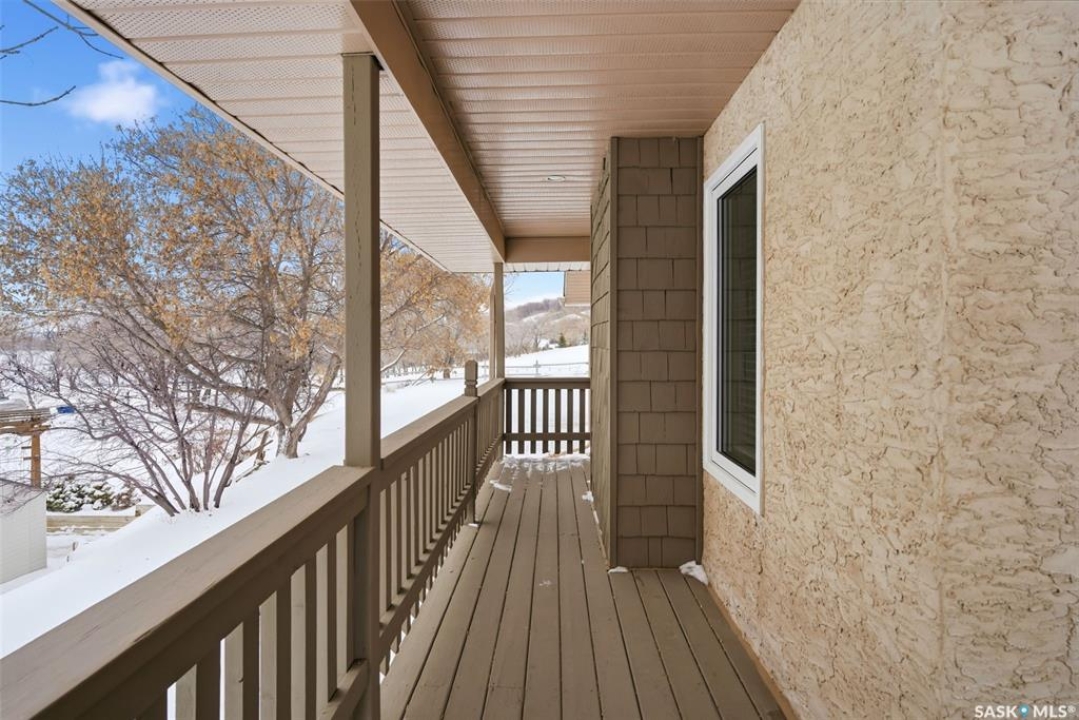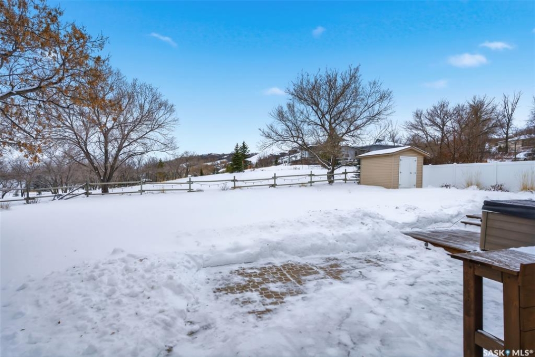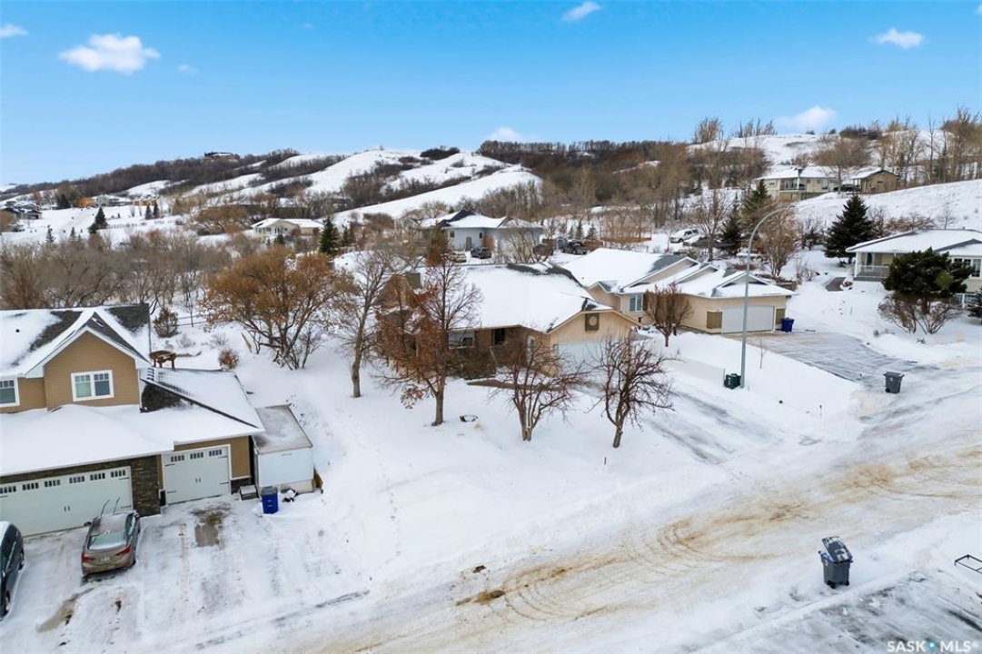 Welcome to a home where pride of ownership is immediately felt and where every detail has been thoughtfully curated for comfort. Perfectly positioned on a large, beautifully landscaped lot in a quiet bay in Lumsden, this 1,427 sq ft custom-built bungalow offers a rare combination of privacy and quality construction. With no rear neighbours, this is the kind of setting that you simply can't get in the city. Step inside and you're greeted by soaring vaulted ceilings that elevate the living room and kitchen, creating a bright, open atmosphere that feels both welcoming and refined. Updated PVC windows flood the home with natural light while enhancing energy efficiency and comfort year-round. The heart of the home, the kitchen and dining area is designed for entertaining, anchored by a large window that frames peaceful views of the deck and backyard. Updated quartz countertops with S/S appliances, and a central island make this space as functional as it is beautiful, perfect for hosting. The main floor features three generous bedrooms, including a private primary retreat with a recently updated custom tile shower. The main bathroom offers a deep soaker tub, perfect for unwinding at the end of the day. Updated vinyl plank flooring ties the space together with a modern, durable finish that's as practical as it is stylish. Downstairs, the fully developed walk-out basement offers a spacious recreation room, exercise area, two large bedrooms, a 4-pc bathroom and a laundry room. Built on a raised wood floor with a crawl space beneath, and supported by concrete piles, this lower level offers warmth, durability, and quality construction you can feel. The west-facing, two-tiered deck, invites you to soak in uninterrupted valley views, glowing sunsets, and the rare luxury of total backyard privacy. The double attached garage is insulated and heated and shingles/eavestrough were updated in 2025.
