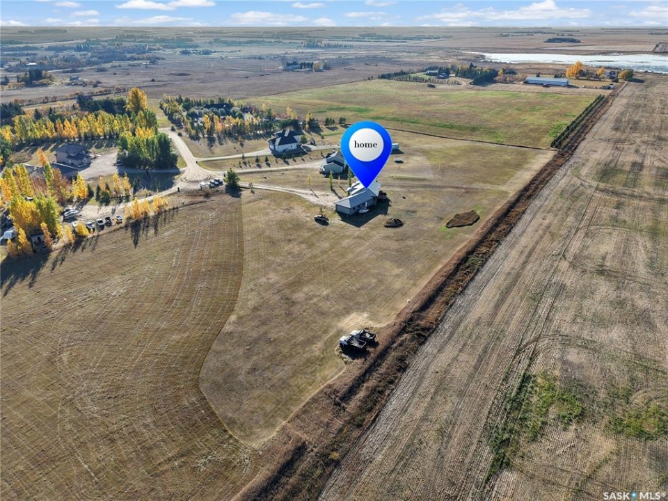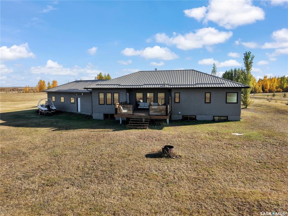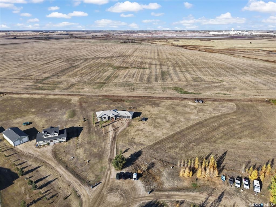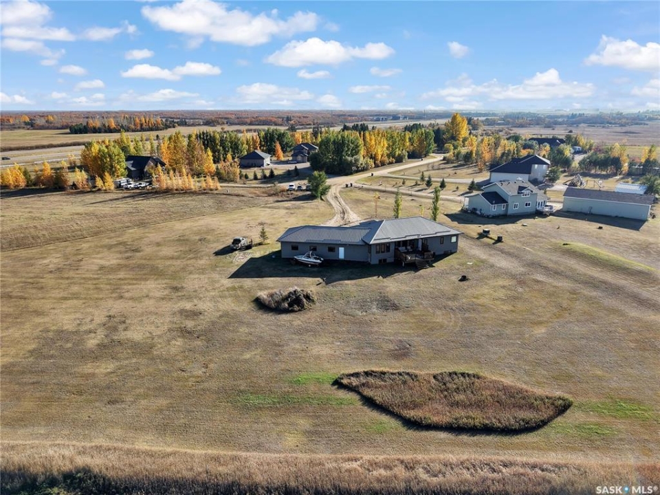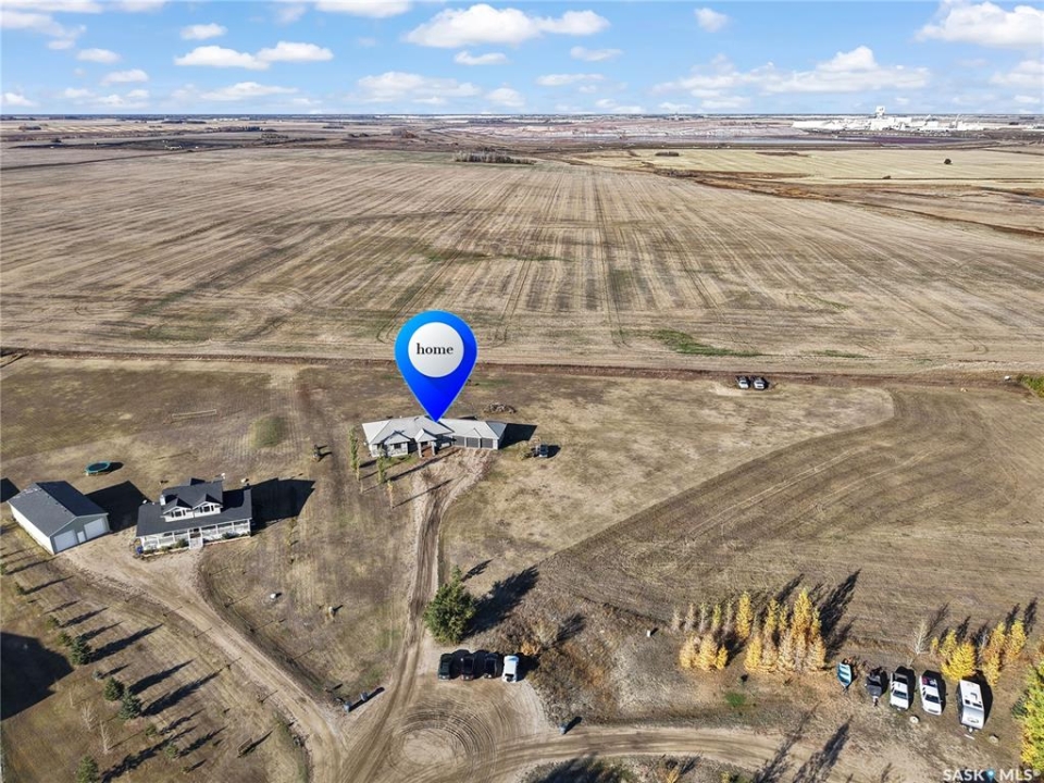 Sitina Estates is a hidden gem just minutes from Saskatoon, accessible via a double-lane highway. This 1880 sq ft bungalow is impeccably finished, featuring six bedrooms and three bathrooms. Located at the back of a cul-de-sac, the property offers exceptional curb appeal with a stucco and stone exterior and staggered garage doors on the triple-attached garage. The front door opens into a spacious tiled foyer with a striking two-sided gas fireplace, shared with the large living room, which is part of the open-concept main floor. The custom kitchen showcases quartz countertops with an island that includes bar seating, gloss-finish white cabinets, a built-in oven and microwave, a hood fan, and a gas range. A walk-through pantry provides easy access to the laundry/mudroom, which connects directly to the attached garage. The dining room is designed with large windows to maximize the natural views and provides access to a generously sized rear deck. Down the hallway, you'll find a four-piece bath and three bedrooms, including the primary suite, which boasts a walk-in closet and an ensuite with dual sinks, high-end fixtures, a Bain Ultra air tub, and a shower space awaiting your tile selection. The basement is nearly complete, with three additional bedrooms and a fully finished four-piece bath. The family room and den have exterior walls and electrical work already in place, leaving an opportunity for a handy buyer to add finishing touches. This quiet development, located just minutes from Saskatoon and the Vanscoy mine, offers the perfect balance of accessibility and the tranquility of acreage living with 2.6 acres to call your own. Call today for a private showing.