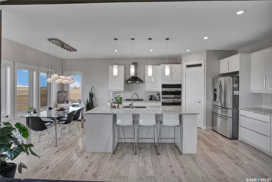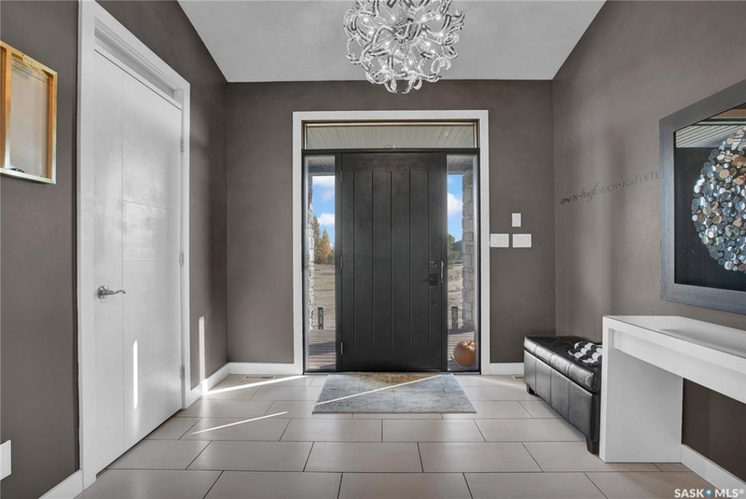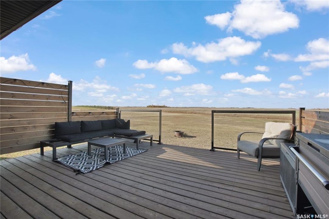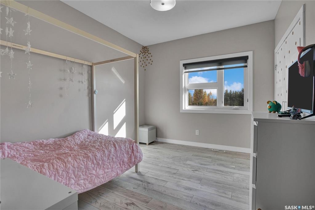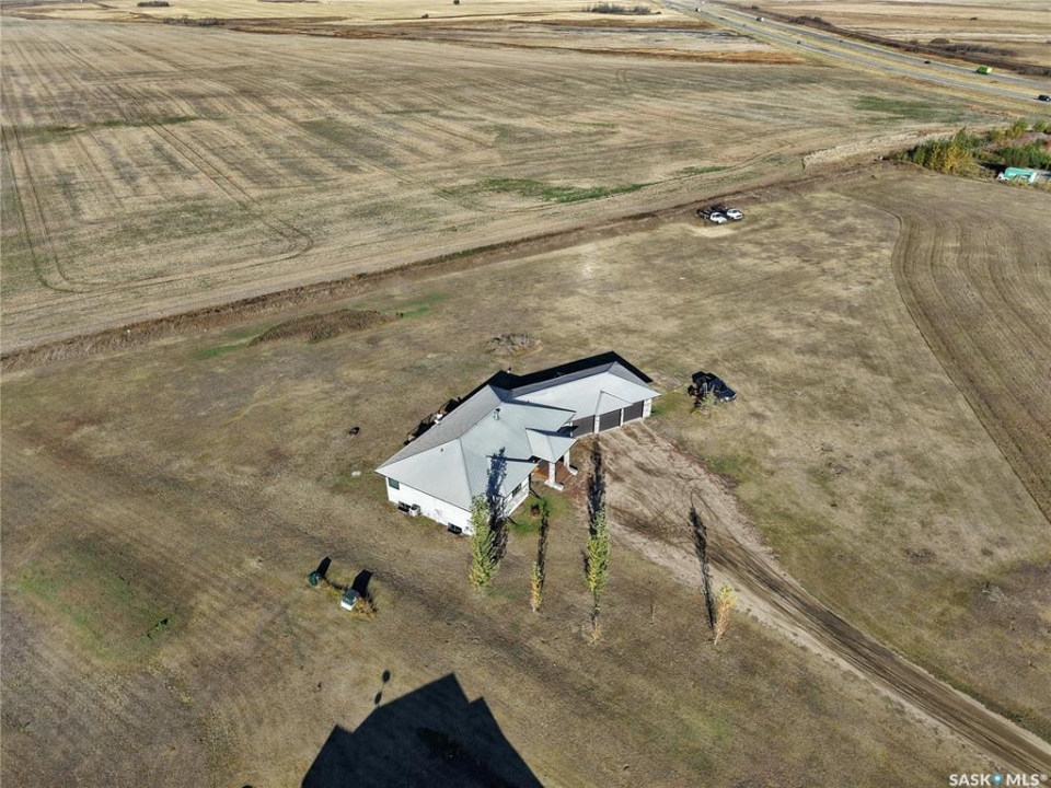 Sitina Estates is a hidden gem just minutes from Saskatoon, accessible via a double-lane highway. This 1880 sq ft bungalow is impeccably finished, featuring six bedrooms and three bathrooms. Located at the back of a cul-de-sac, the property offers exceptional curb appeal with a stucco and stone exterior and staggered garage doors on the triple-attached garage. The front door opens into a spacious tiled foyer with a striking two-sided gas fireplace, shared with the large living room, which is part of the open-concept main floor. The custom kitchen showcases quartz countertops with an island that includes bar seating, gloss-finish white cabinets, a built-in oven and microwave, a hood fan, and a gas range. A walk-through pantry provides easy access to the laundry/mudroom, which connects directly to the attached garage. The dining room is designed with large windows to maximize the natural views and provides access to a generously sized rear deck. Down the hallway, you'll find a four-piece bath and three bedrooms, including the primary suite, which boasts a walk-in closet and an ensuite with dual sinks, high-end fixtures, a Bain Ultra air tub, and a shower space awaiting your tile selection. The basement is nearly complete, with three additional bedrooms and a fully finished four-piece bath. The family room and den have exterior walls and electrical work already in place, leaving an opportunity for a handy buyer to add finishing touches. This quiet development, located just minutes from Saskatoon and the Vanscoy mine, offers the perfect balance of accessibility and the tranquility of acreage living with 2.6 acres to call your own. Call today for a private showing.