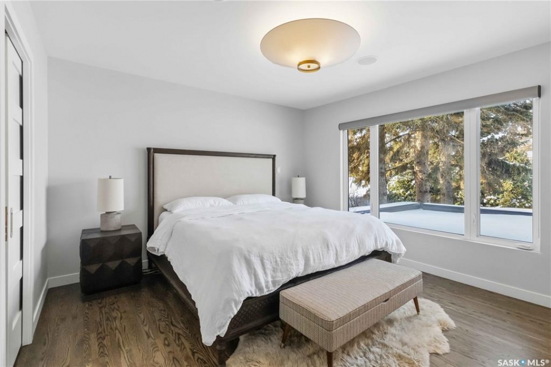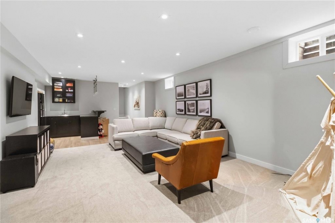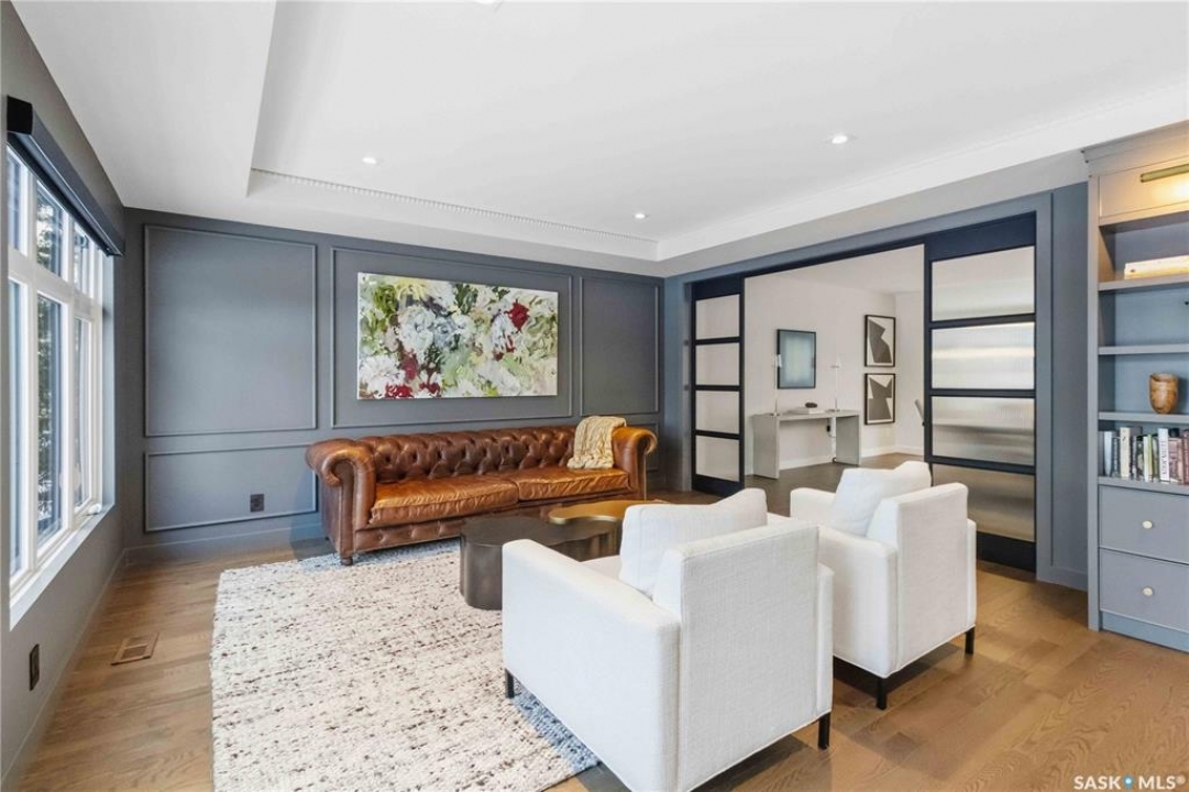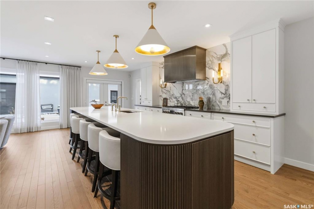 Welcome to 1134 Spadina Crescent E, an impeccably reimagined luxury residence where refined design meets exceptional craftsmanship. This two storey home offers 4 bedrooms and 4 bathrooms and was transformed through a professional, year long renovation by Atmosphere Interior Design from 2021 to 2022, showcasing uncompromising attention to detail throughout. The main floor features engineered oak flooring, custom ceiling and wall moulding, and a front executive office framed by steel doors and scenic river views. The showpiece kitchen is anchored by custom cabinetry with Restoration Hardware handles, a full slab marble backsplash, custom brass hood, sculptural brass lighting, and premium JennAir appliances. A statement oak island with fluted detailing, two garburators, artisan tile pantry backsplash, and refined finishes complete the space. The living area is warmed by a marble clad Town and Country gas fireplace and enhanced with motorized blinds, smart lighting, and built in speakers. Designer lighting by Kelly Wearstler, Restoration Hardware, and Arteriors creates a timeless, layered aesthetic throughout. New interior doors with Emtek hardware elevate both function and form. The primary suite is a spa inspired retreat featuring two walk in closets, heated tile floors, steam shower, Restoration Hardware mirrors, and Kelly Wearstler lighting. Secondary bedrooms are thoughtfully curated with designer wallpapers along with custom drapery. Additional highlights include a spacious mudroom, updated staircase with new spindles, and a timeless exterior finished in metal siding and stucco. Outdoor living is enhanced by a new composite deck completed last summer. The heated triple garage offers a drive through bay, slat wall storage, sub panel, and 240 volt plug. Other upgrades include new weeping tile with a sump pit. A rare and refined offering, blending elevated design, modern technology, and timeless elegance for an exceptional lifestyle opportunity.