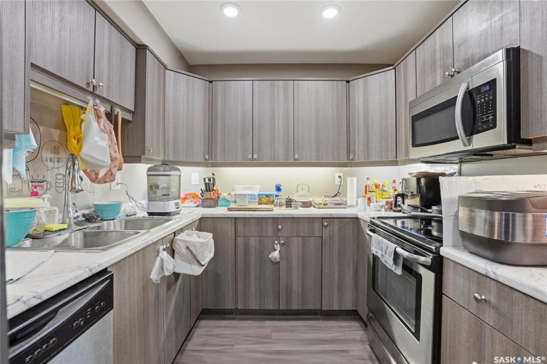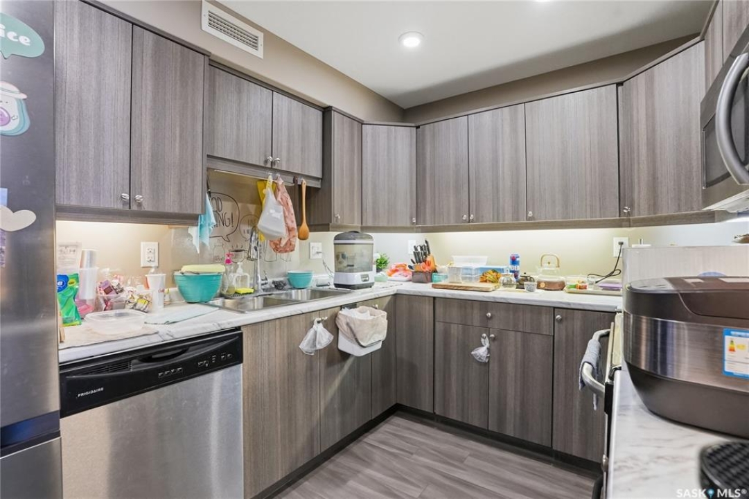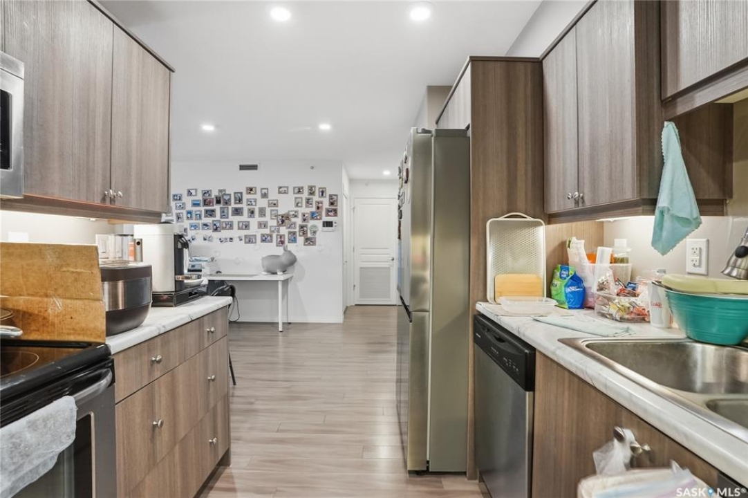 Top-floor living at Serenity Pointe in Stonebridge! Welcome to Unit 1313 at 102 Willis Crescent. This pristine 876 sq. ft. condo offers the peace and quiet of having no neighbours above you. The unit features a spacious 2-bedroom, 2-bathroom layout with high-quality laminate flooring throughout—no carpet to maintain. Enjoy year-round comfort with radiant in-floor heating and central air conditioning. The modern kitchen comes fully equipped with all appliances and flows seamlessly into the living area, leading out to a generous balcony. Additional perks include convenient in-suite laundry and one heated underground parking stall. Ideally located near parks, bus routes, and the Stonebridge shopping centre. This unit shows like new and is ready for its next owner. Don't miss out!