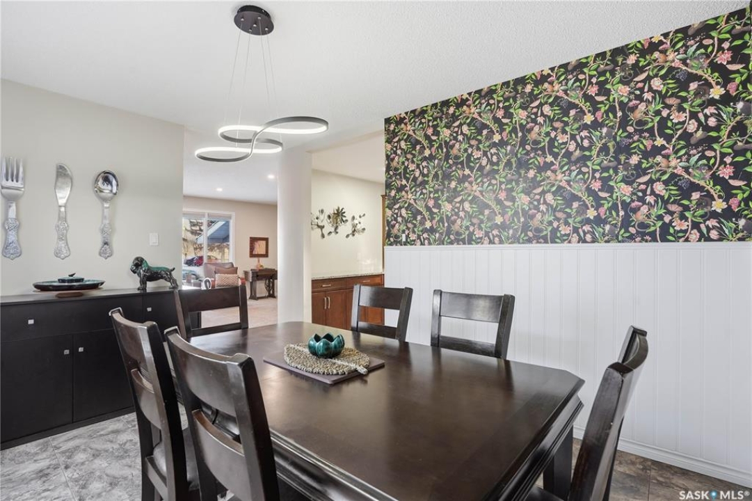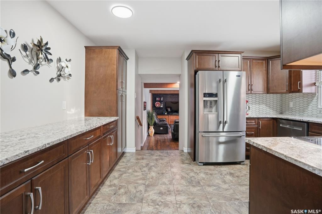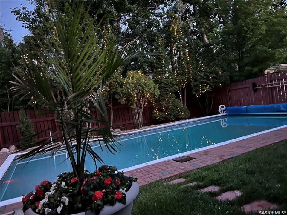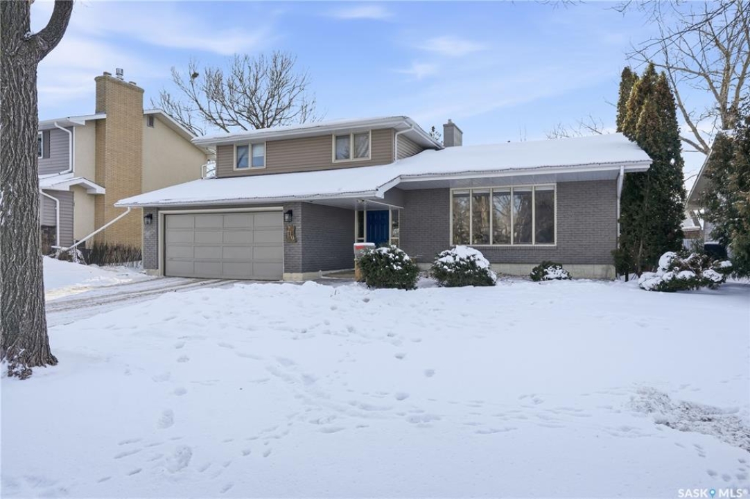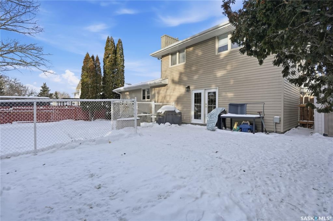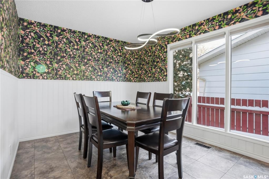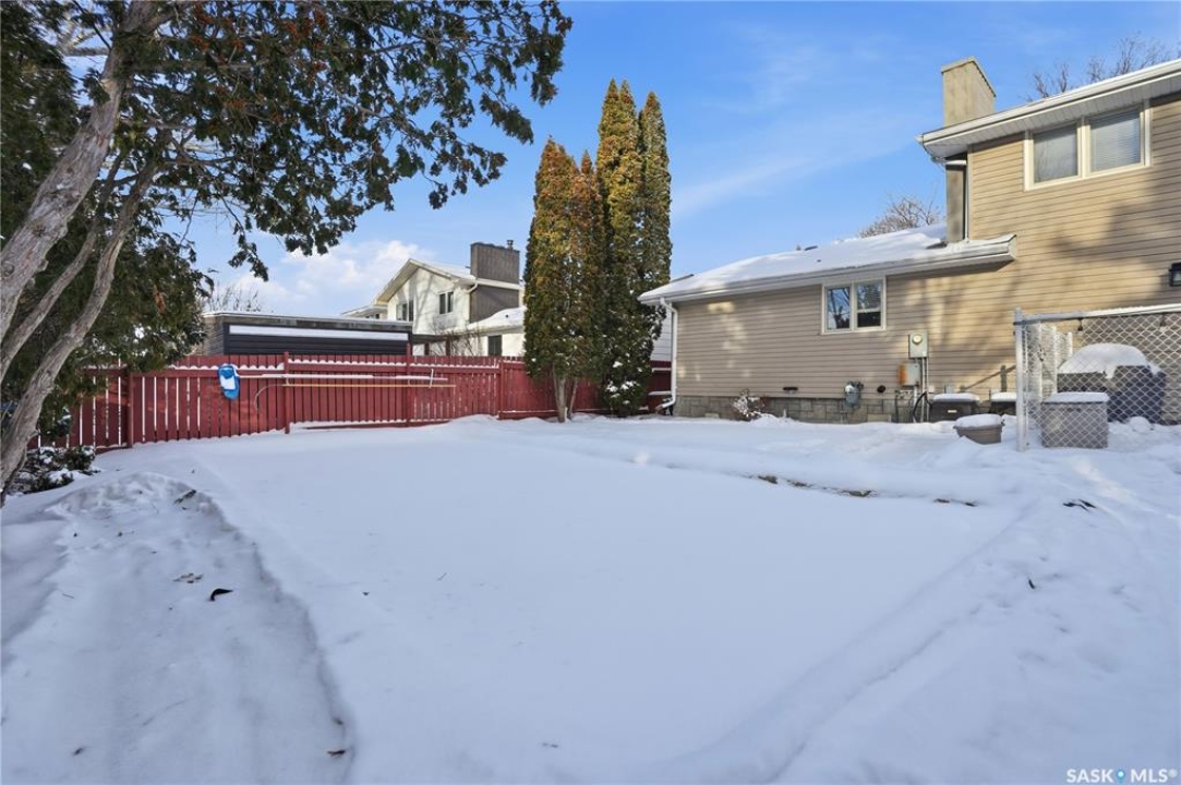 Perfectly located in Regina's sought-after Albert Park neighbourhood, this exceptional family home is within walking distance to elementary schools and directly across the street from the South Leisure Centre, spray park, and Optimist skating rink—a dream location for active families. This 1,913 sq. ft. two-storey split offers 4 bedrooms, 3 bathrooms, and a double attached garage, with all four bedrooms conveniently located on the second level. The inviting main floor features a spacious entryway and a large formal living room highlighted by a stunning feature wall. The beautifully renovated kitchen showcases new cabinetry, granite countertops, and a tiled backsplash, with a window overlooking the backyard and outdoor pool. Adjacent to the kitchen, the dining room stands out with elegant wainscoting, playful wallpaper, and a striking light fixture—perfect for entertaining. The cozy family room includes a built-in entertainment centre and patio doors leading to the backyard oasis. Completing the main floor are a 2-piece bathroom, laundry area, and direct access to the garage. A striking curved staircase leads upstairs to four generously sized bedrooms and a 4-piece bathroom. The primary bedroom offers a walk-in closet and private 2-piece ensuite. The basement provides additional living space with a recreation room and den, currently used as a home gym. Notable upgrades include two high-efficiency furnaces, on-demand water heater, underground sprinklers, and a new boiler system for the heated outdoor pool. The fully fenced backyard is designed for summer enjoyment, featuring an additional pool fence, patio area, and bar—your own private retreat. This is the perfect place to call home for families looking for space, comfort, and an unbeatable location.