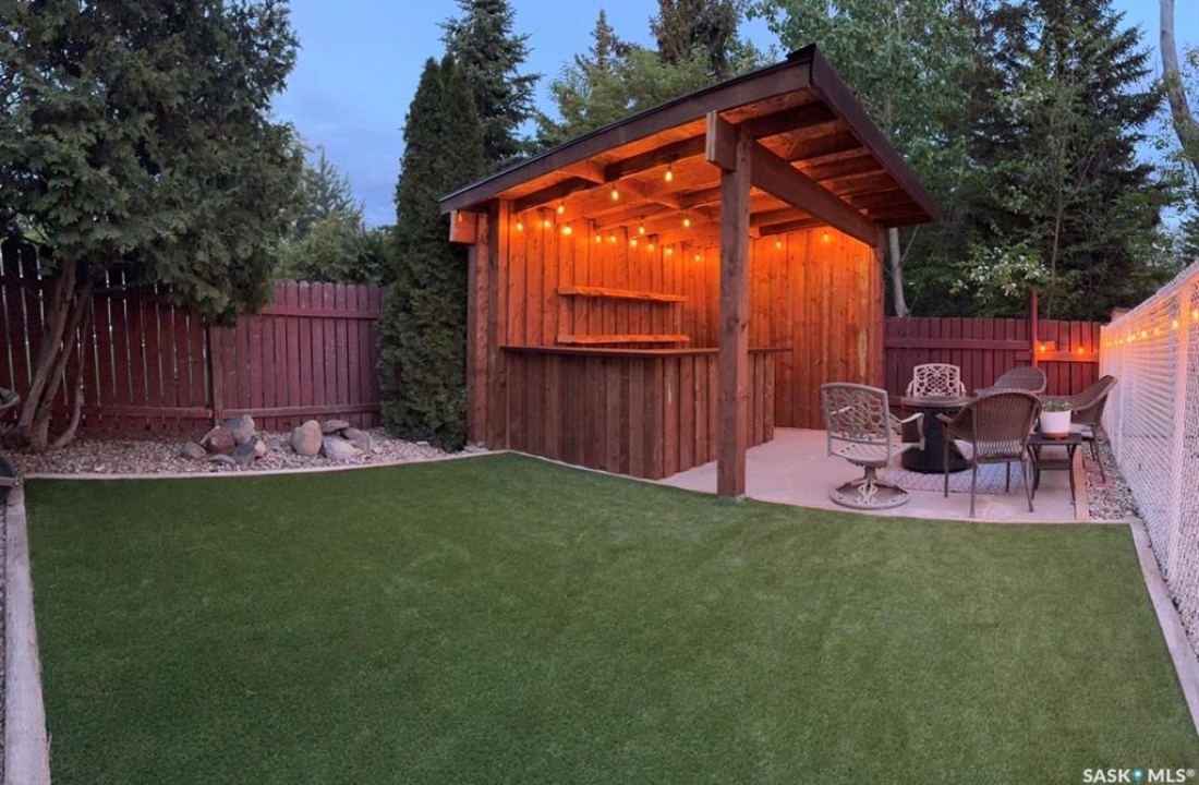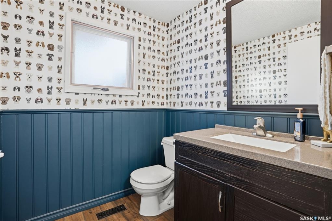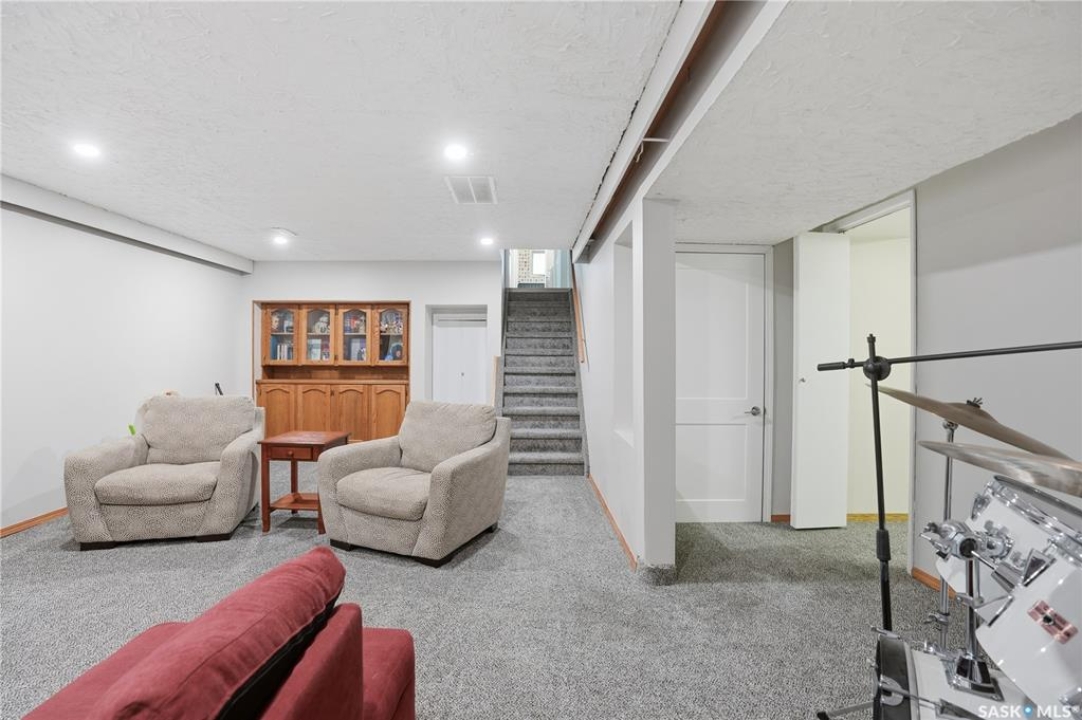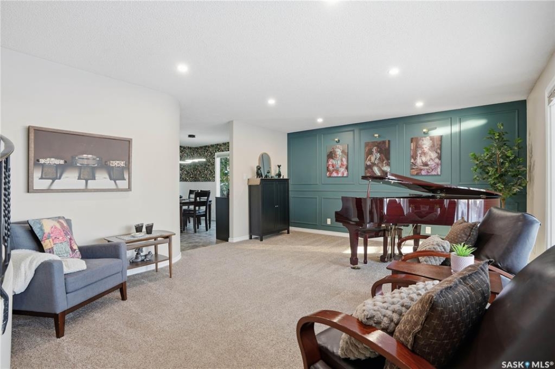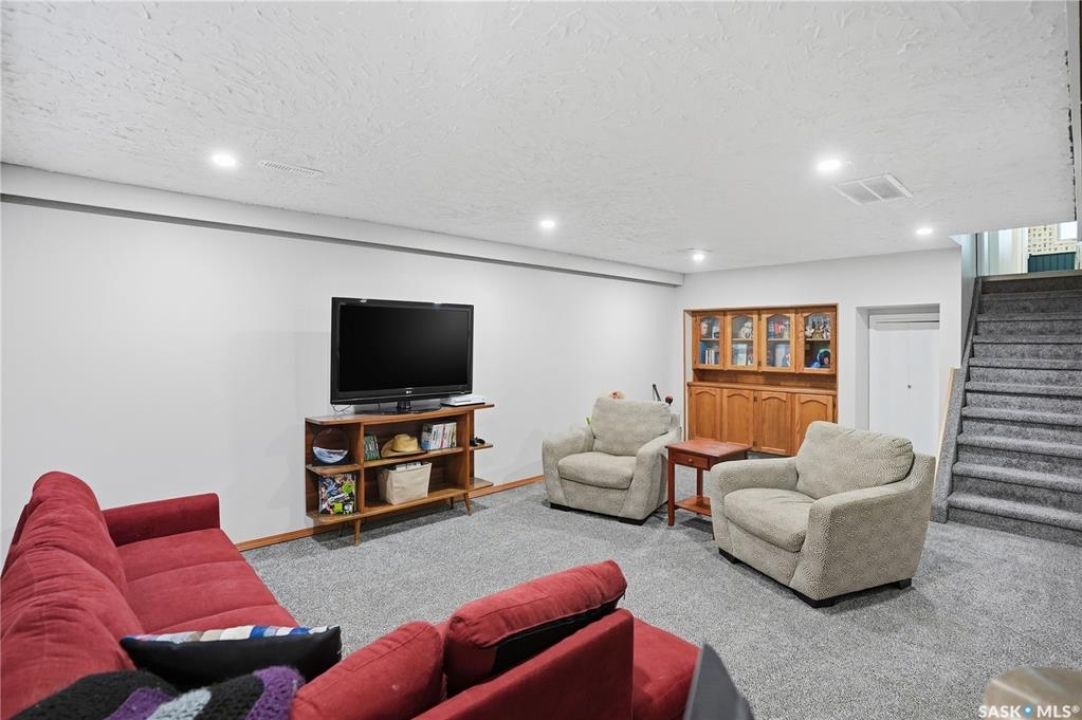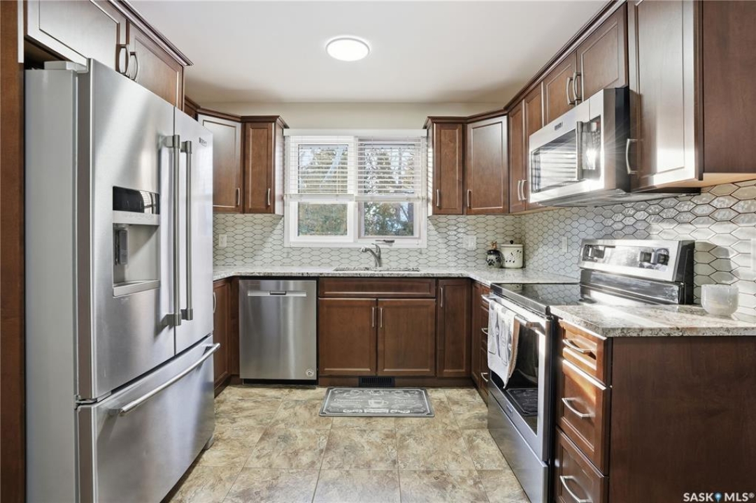 Perfectly located in Regina's sought-after Albert Park neighbourhood, this exceptional family home is within walking distance to elementary schools and directly across the street from the South Leisure Centre, spray park, and Optimist skating rink—a dream location for active families. This 1,913 sq. ft. two-storey split offers 4 bedrooms, 3 bathrooms, and a double attached garage, with all four bedrooms conveniently located on the second level. The inviting main floor features a spacious entryway and a large formal living room highlighted by a stunning feature wall. The beautifully renovated kitchen showcases new cabinetry, granite countertops, and a tiled backsplash, with a window overlooking the backyard and outdoor pool. Adjacent to the kitchen, the dining room stands out with elegant wainscoting, playful wallpaper, and a striking light fixture—perfect for entertaining. The cozy family room includes a built-in entertainment centre and patio doors leading to the backyard oasis. Completing the main floor are a 2-piece bathroom, laundry area, and direct access to the garage. A striking curved staircase leads upstairs to four generously sized bedrooms and a 4-piece bathroom. The primary bedroom offers a walk-in closet and private 2-piece ensuite. The basement provides additional living space with a recreation room and den, currently used as a home gym. Notable upgrades include two high-efficiency furnaces, on-demand water heater, underground sprinklers, and a new boiler system for the heated outdoor pool. The fully fenced backyard is designed for summer enjoyment, featuring an additional pool fence, patio area, and bar—your own private retreat. This is the perfect place to call home for families looking for space, comfort, and an unbeatable location.