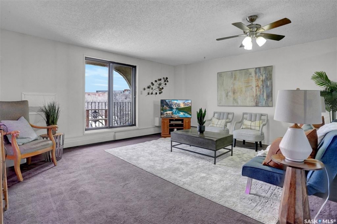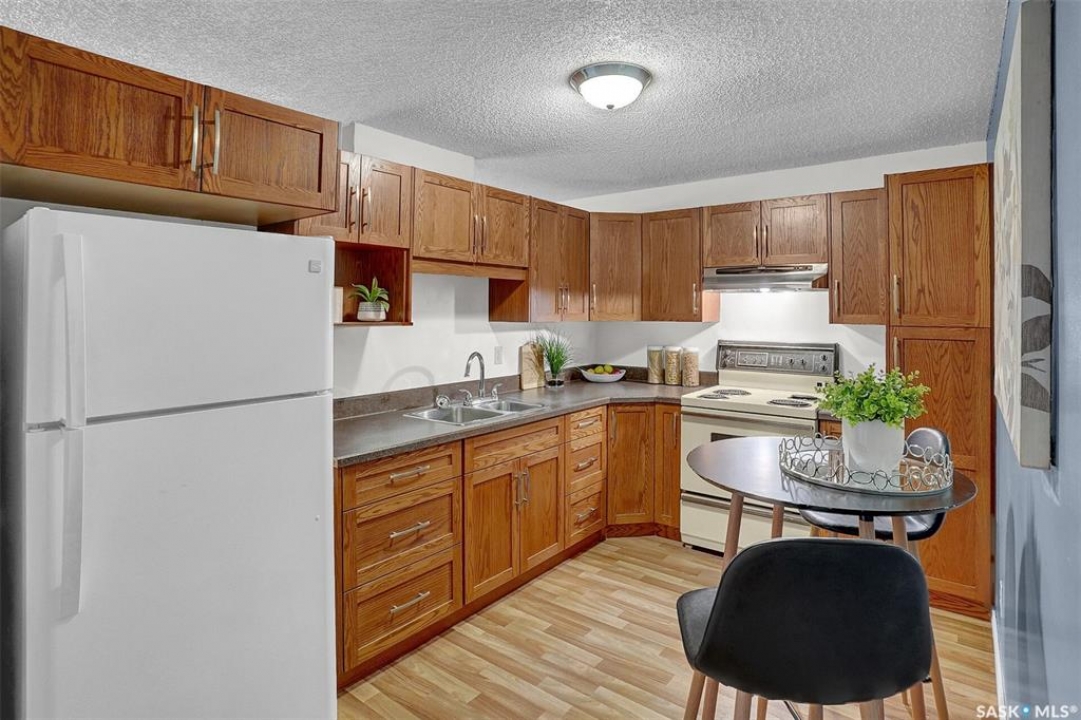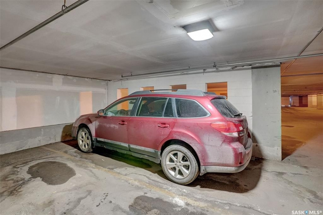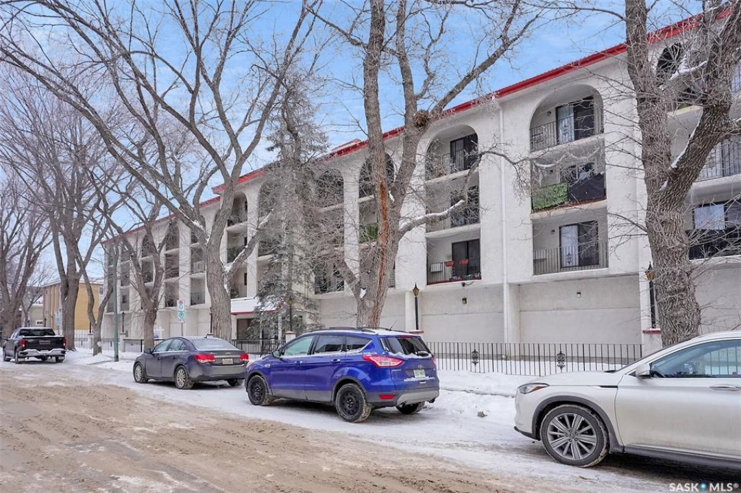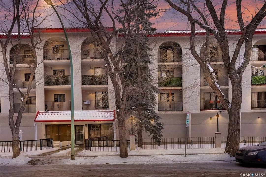 Welcome to this well-maintained 926 sq. ft. condo offering a comfortable and convenient lifestyle in a location with close proximity to downtown, the hospital, and Wascana Park. This bright and inviting unit features 1 spacious bedroom and 1 updated 4-piece bathroom, along with the added convenience of covered parking with additional storage. Bright white walls throughout most of the unit enhance the natural light and create a clean, welcoming atmosphere. The oak kitchen has been refreshed with updated hardware, blending classic warmth with a modern touch. The large living room extends to a private balcony, perfect for enjoying fresh air or relaxing at the end of the day. Heat and water are included in the condo fees, adding excellent value and peace of mind. The generous bedroom includes a walk-in closet, while the updated bathroom offers both style and functionality. This is a great option for first time buyers, those that want to be close to the hospital and downtown or investors.
