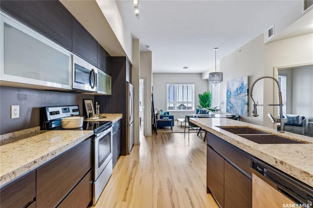 Have your own piece of Sequioa Square! Built by Meridian, you can step into this bright and beautifully finished 910 sq ft top-floor unit, where modern design meets everyday comfort. With 9 ft ceilings, large windows, and an open-concept layout, the space feels airy, warm, and inviting from the moment you walk in. The kitchen is designed to impress with sleek cabinetry, stone countertops, stainless steel appliances, and a functional island that flows seamlessly into the dining and living areas—perfect for entertaining or relaxing at home. Heated floors throughout the entire unit add an extra level of comfort you'll appreciate year-round. This 2-bedroom, 2-bathroom layout offers excellent separation and privacy. The primary suite features a spacious walk-through closet and a spa-inspired ensuite with his-and-hers sinks and a walk-in shower. The second bedroom is ideal for guests, a home office, or additional living space. Enjoy the convenience of in-suite laundry, modern lighting, and a covered balcony—perfect for morning coffee or unwinding at the end of the day. The unit also comes with two parking stalls, including one underground, offering both comfort and practicality. Located in the sought-after Evergreen neighbourhood, you're surrounded by walking trails, parks, bus routes, gyms, and everyday amenities—making this an ideal home for professionals, first-time buyers, or downsizers alike. Call your realtor and book a showing today!
