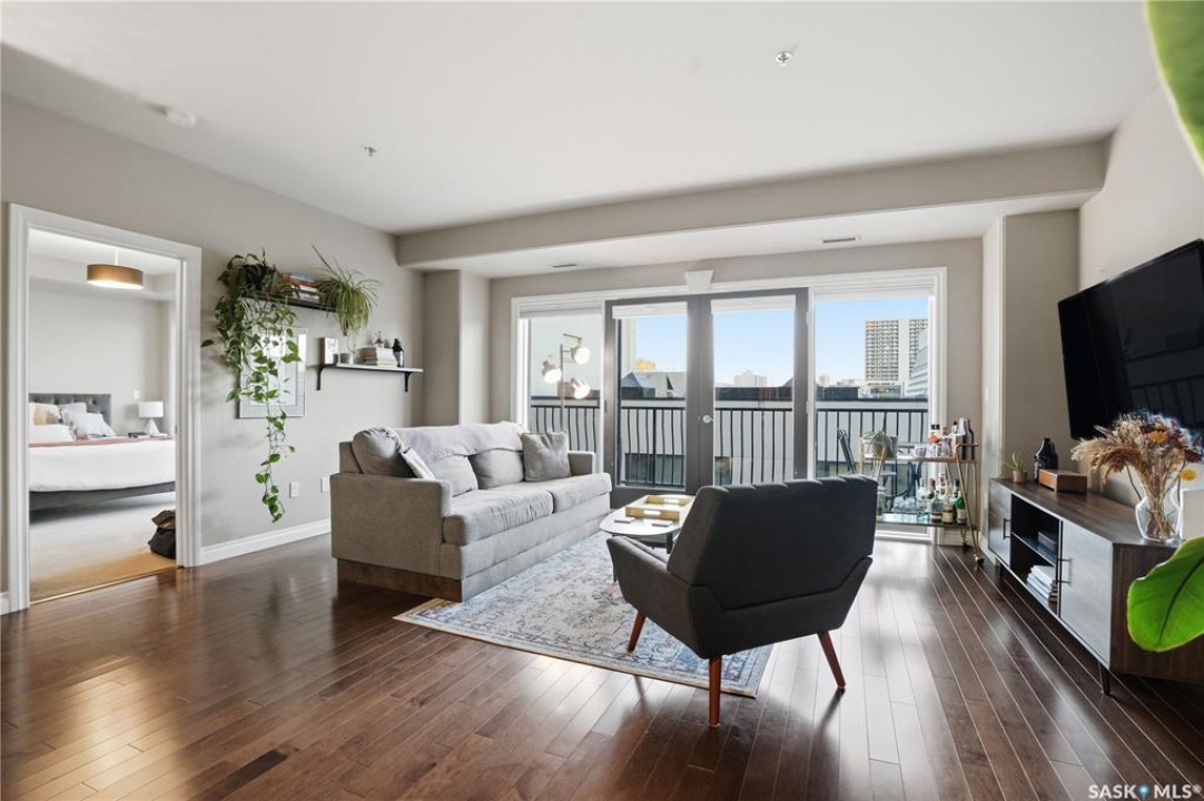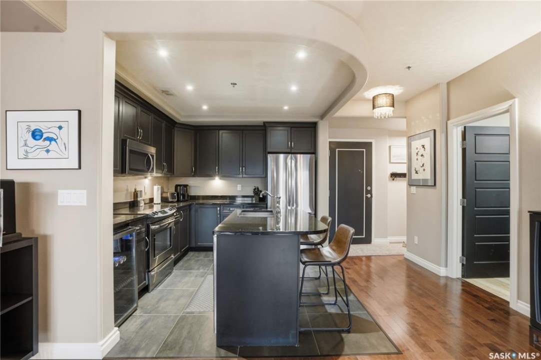 Enjoy luxury living in one of Saskatoon's most prestigious and icon developments; The Residences at the King George. Experience city living at its finest in this 1216 sq ft., 2 bedroom, 2 bathroom condo. The spacious open concept floor plan features executive level finishes designed for both elegant entertaining and everyday comfort. The fully equipped kitchen comes with stainless steel appliances, granite countertops and ample cabinetry throughout. Garden doors off the living room lead to a balcony to enjoy the downtown surroundings. The primary bedroom includes a walk-in closet and a 3-piece ensuite. The spacious second bedroom overlooks the terrace below and would also make for a great home office. Floor to ceiling windows flood the unit with natural light and offer beautiful cityscape views, both day and night. A rooftop patio is available for the residence; complete with a built in BBQ and outdoor kitchen. This unit also features 2 heated underground tandem parking spots, heated storage and a secured entry system. This exceptional home offers the perfect blend of modern urban living and historic charm and is an ideal opportunity to own a piece of Saskatoon history in the heart of the city.