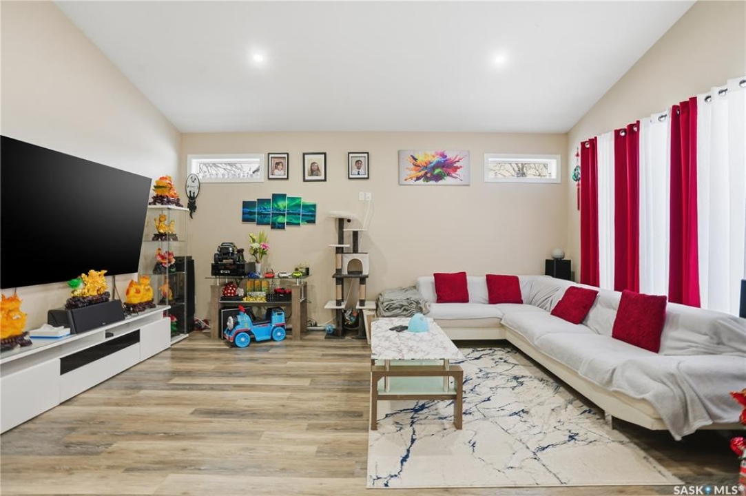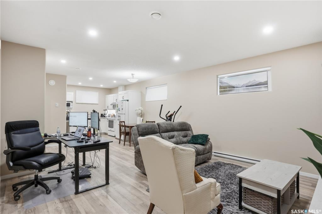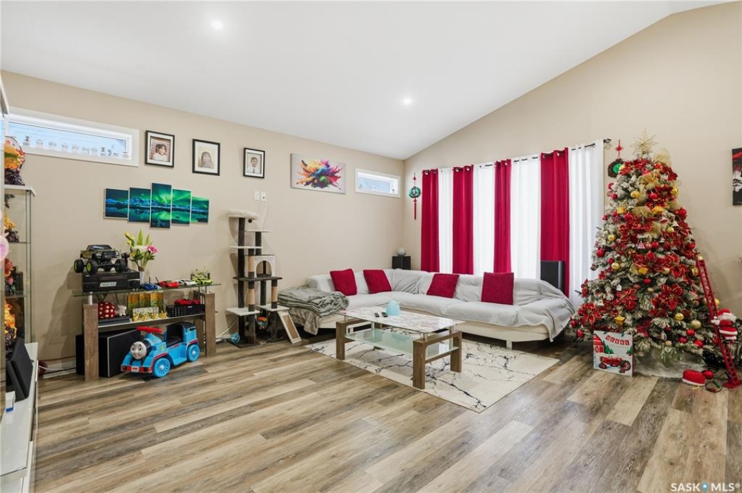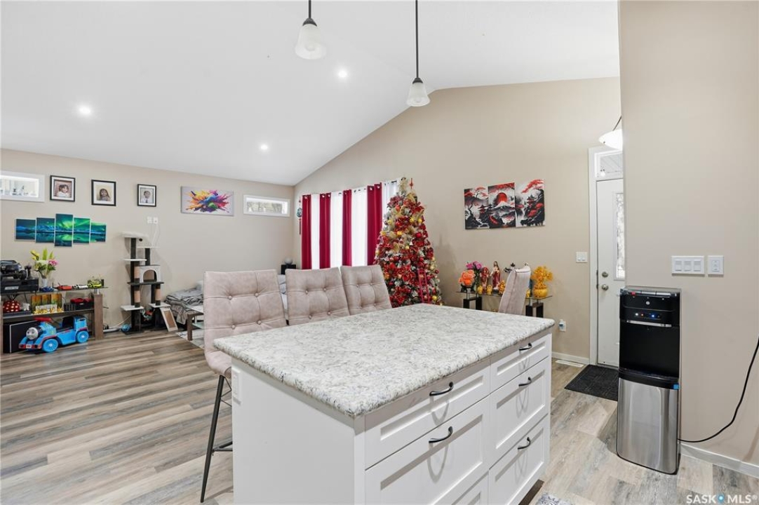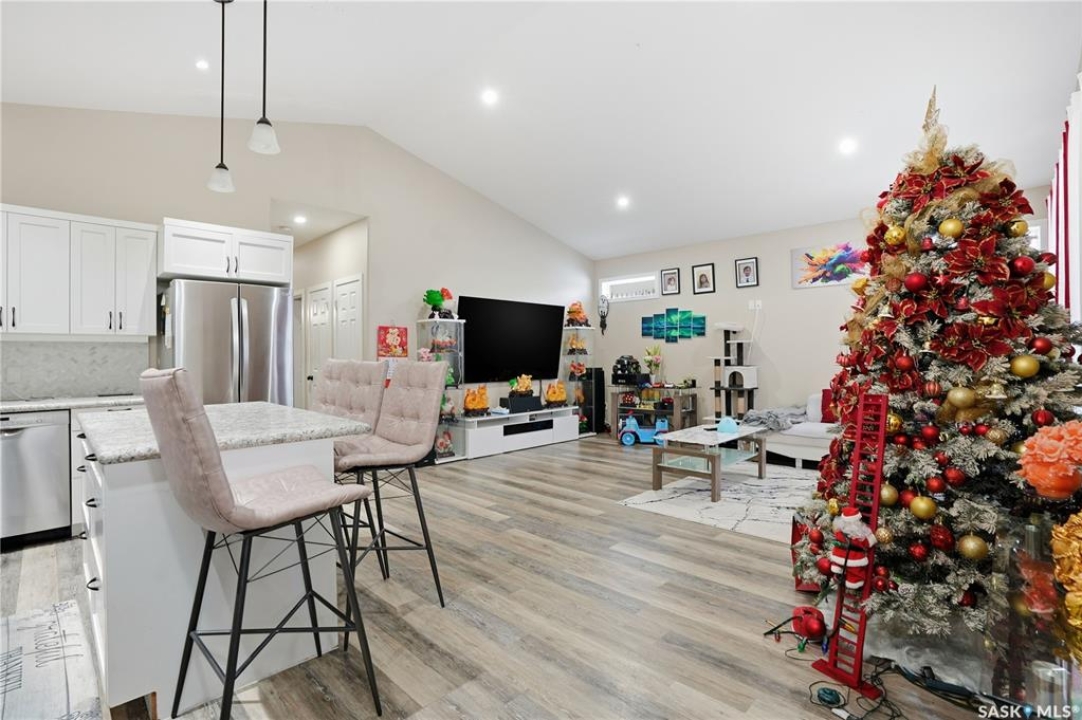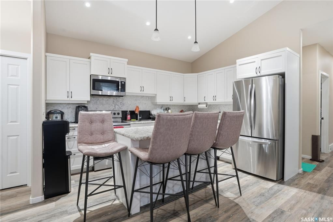 Prime investment opportunity in Eastview! Built by INS Homes in 2019, this modern bungalow offers the perfect setup to live in one suite and rent out the other. The main floor features 1,242 sq ft of bright, open-concept living with vaulted ceilings, recessed lighting, and large windows that flood the space with natural light. The contemporary kitchen is finished with white cabinetry, a large eat-in island, upgraded patterned backsplash, under-cabinet lighting, and stainless steel appliances. A main-floor laundry room adds convenience, while the primary bedroom includes a walk-in closet and three-piece ensuite. Two additional bedrooms and a full bathroom complete this level, which is heated by a natural gas forced-air furnace. A private side entrance leads to the fully developed basement suite, offering a spacious layout with a bright kitchen, dining, and living area. The basement kitchen includes white cabinetry, matching appliances, stainless dishwasher, hood fan, and pantry. The suite features two bedrooms, one with a walk-in closet, a full bathroom, separate laundry, and a utility room. The yard is partially fenced with ample rear parking and back lane access. Located on a quiet Eastview street, this home is close to parks, green spaces, and the Eastview Community Centre.
