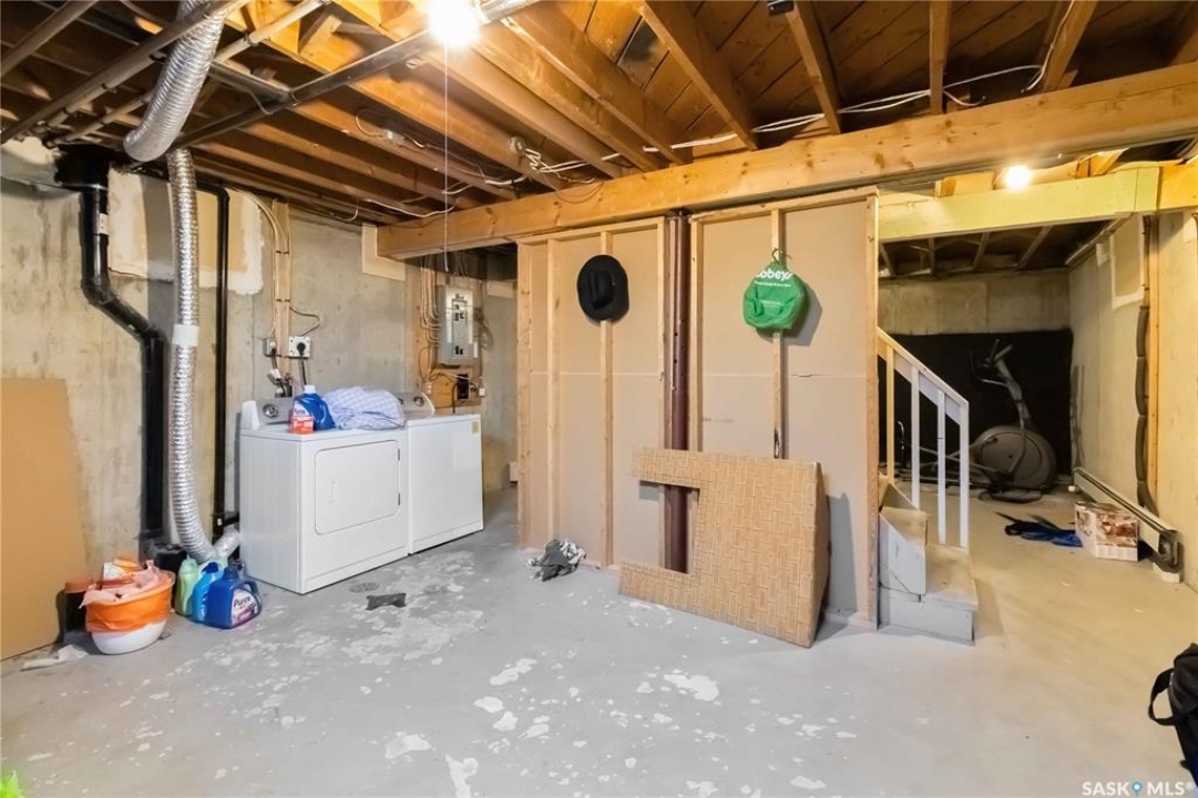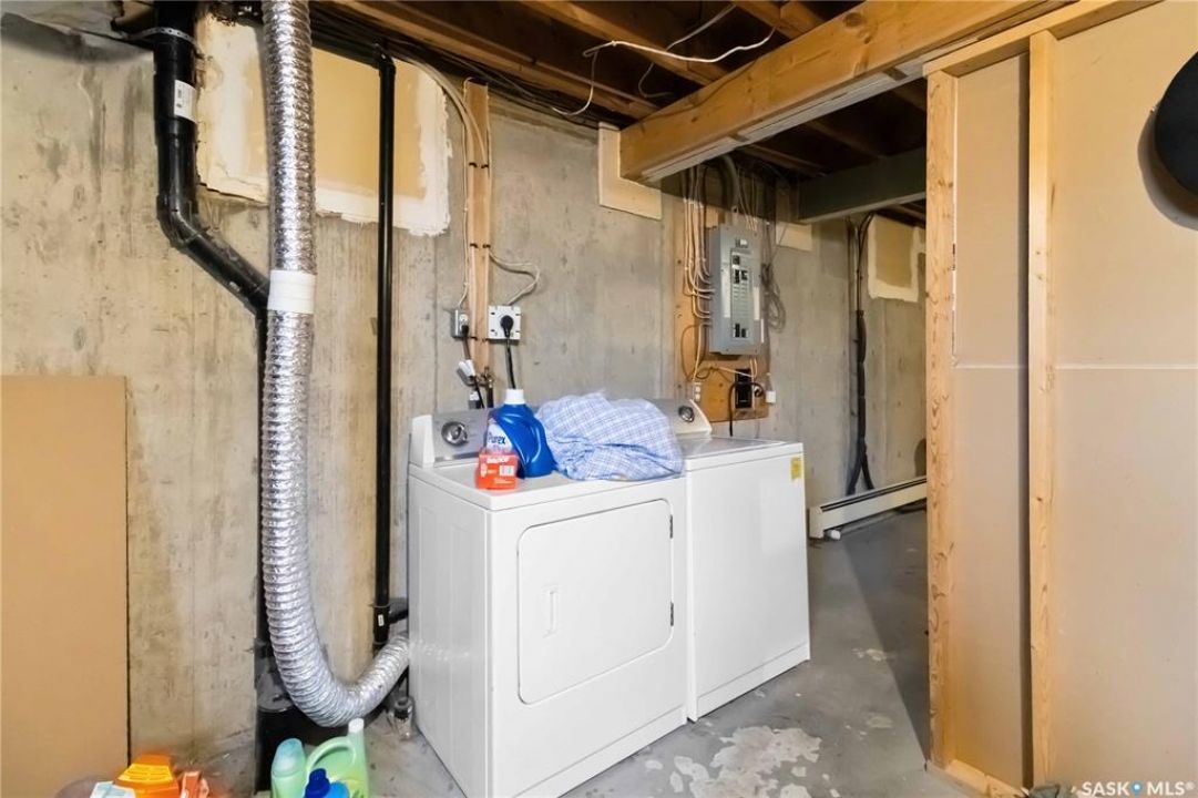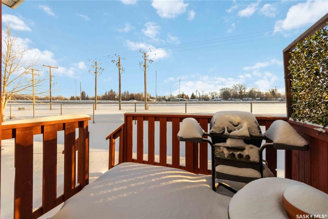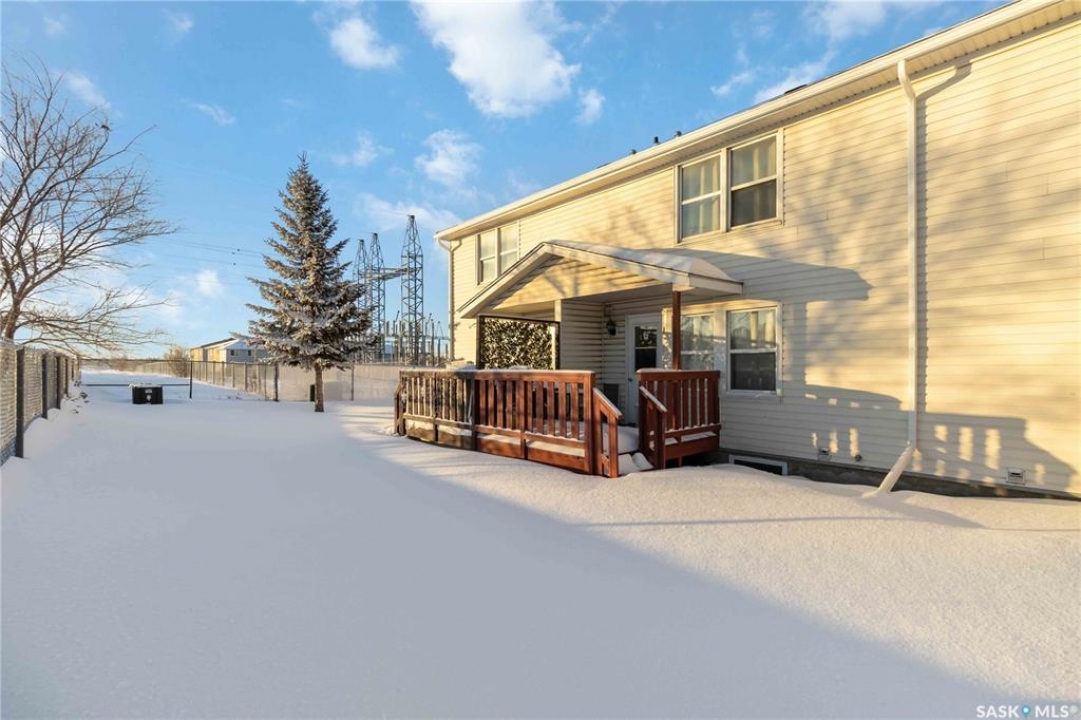 Welcome to 209 Camponi Place! This bright and affordable two-story townhouse offers the perfect blend of comfort and convenience. As you arrive, you'll appreciate the visitor parking and your own exclusive electrified stall. A charming covered front step protects you from the elements as you enter a spacious living room bathed in natural light from large windows. The open-concept kitchen and dining area features a functional pantry and garden door access to a private, east-facing deck—ideal for morning coffee or hosting summer gatherings. Upstairs, a classic wide staircase leads to a massive primary bedroom, a generous second bedroom, and a clean 4-piece bathroom, all featuring beautiful wood flooring. The unfinished basement is a blank canvas, roughed-in for a second bathroom and large enough for two additional bedrooms. One of the best perks? The condo fees cover almost everything, including heat, water, sewer, and even the power for your parking stall. With no furnace or water heater to maintain and a pet-friendly policy, this is worry-free living at its finest!