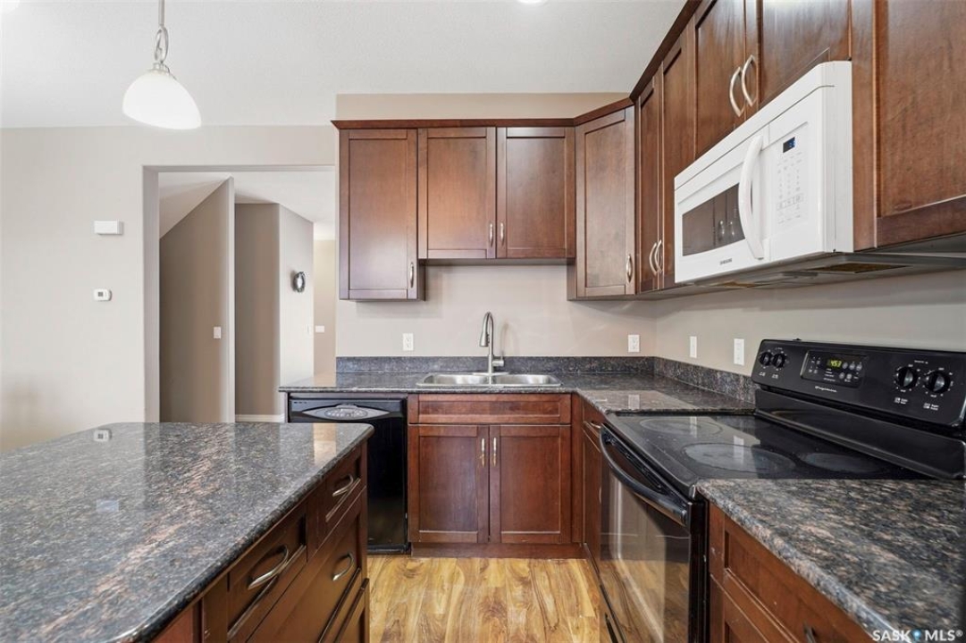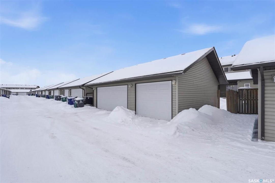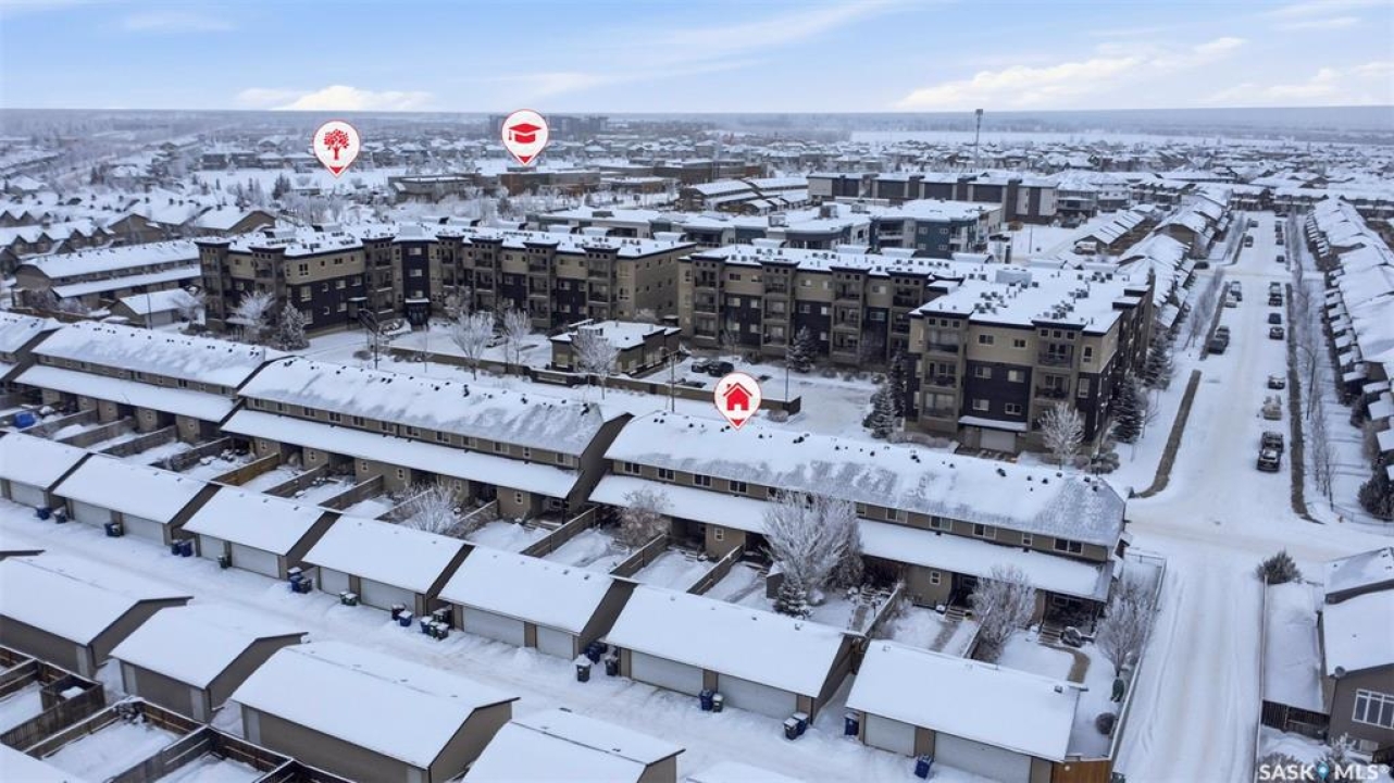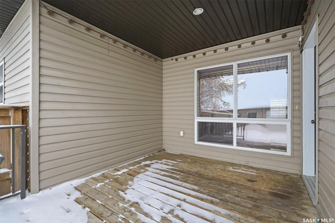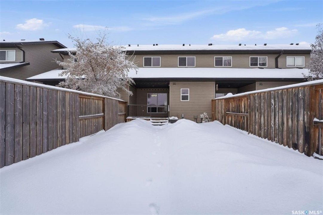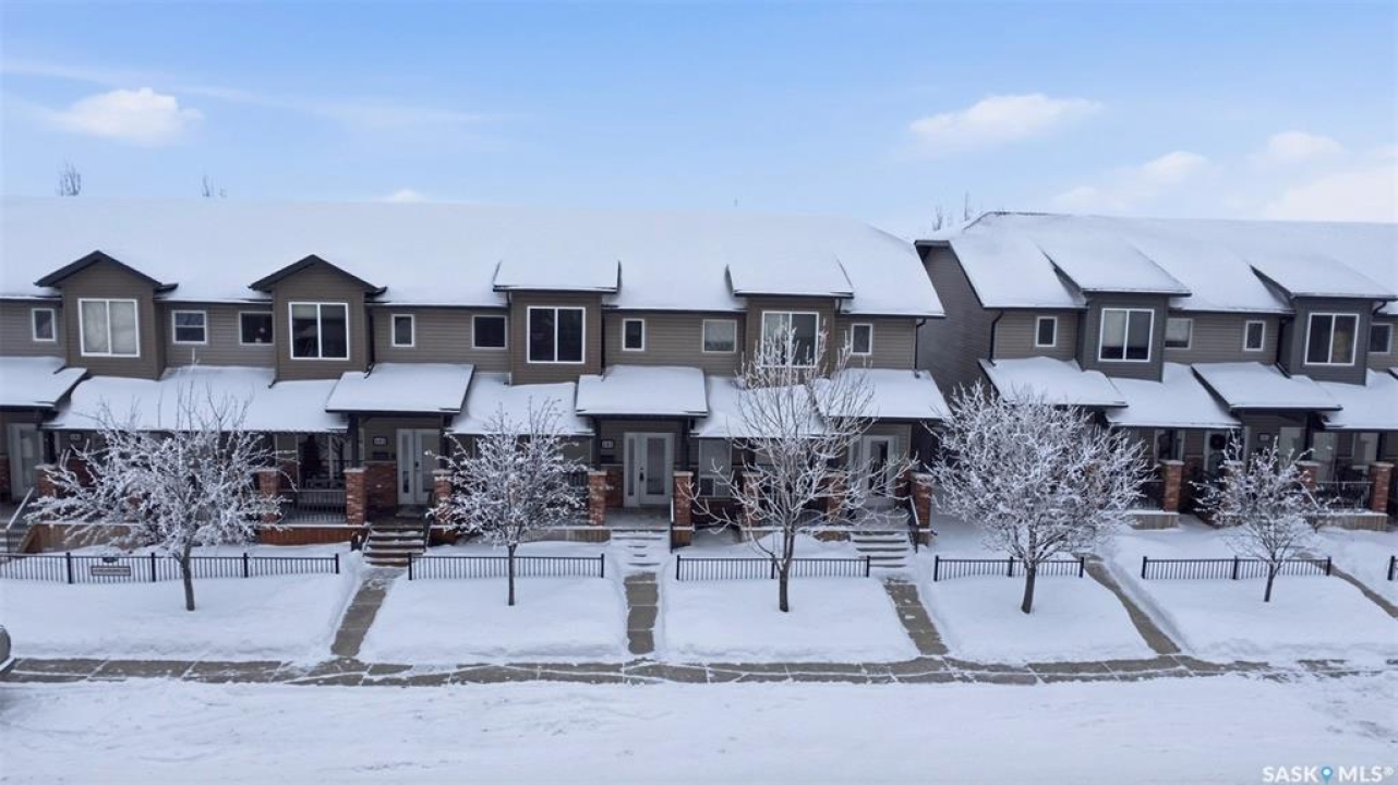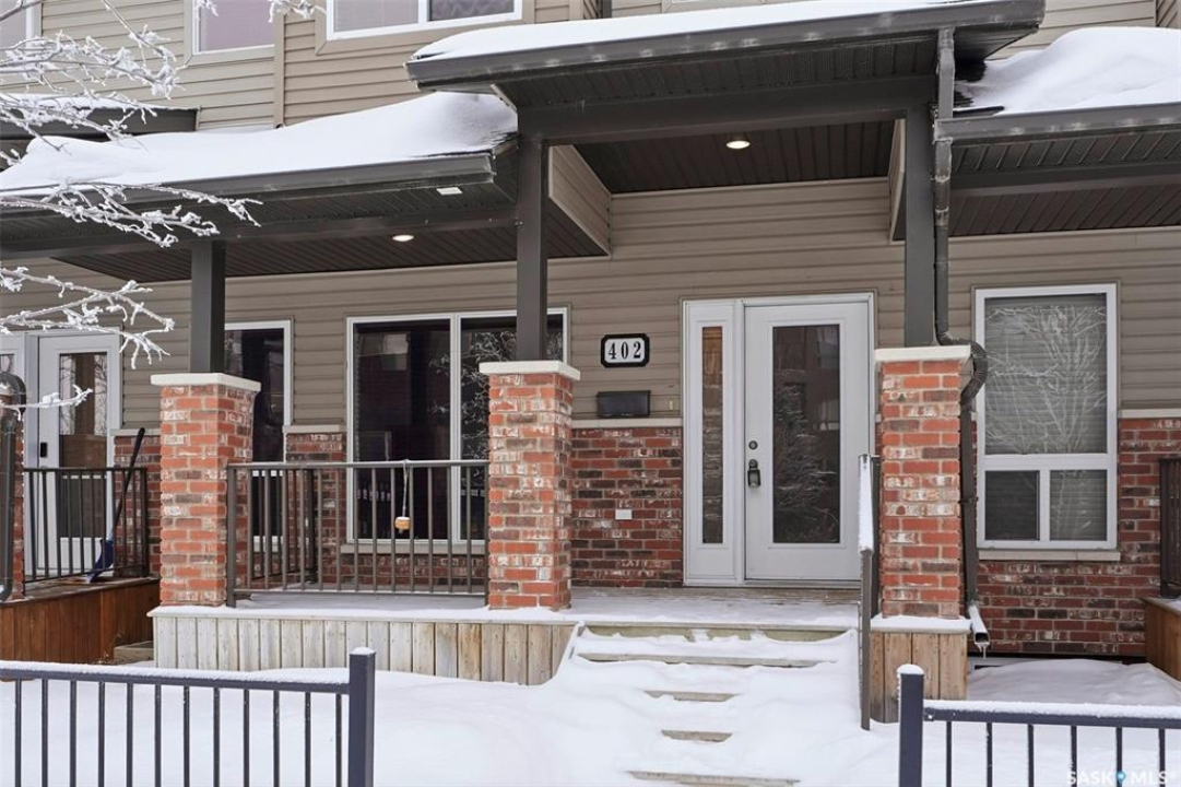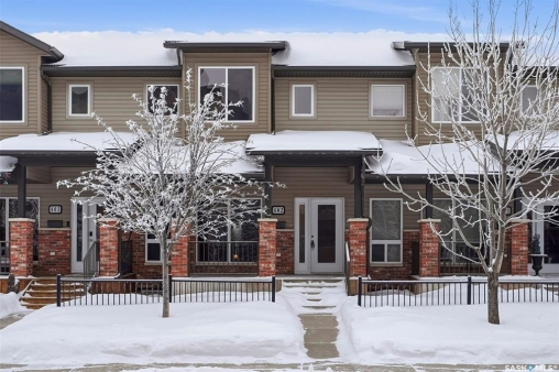 Welcome to 110 Willowgrove Crescent # 402—a beautifully crafted 3-bedroom, 3-bath townhouse built by Riverbend Developments, offering the perfect blend of quality and luxury. Ideally located just one block from Willowgrove Square and two elementary schools, with close proximity to St. Joseph and Centennial high schools, University Heights shopping, and all essential amenities. The home features an attractive exterior with stone and vinyl siding, a charming front veranda, and a private fenced backyard with a spacious covered deck. Inside, you'll find 9-foot ceilings and oversized windows that fill the main floor with natural light. The open-concept living, kitchen, and dining areas showcase deluxe laminate flooring, maple cabinetry with soft-close doors, granite countertops, a large island with seating, and a generous walk-in pantry. Upstairs offers three well-appointed bedrooms and two bathrooms, including a primary suite with granite countertops and a private ensuite. The basement is open for further development. Additional highlights include central AC, detached garage, and a rear single-car driveway. This home shows well—schedule your private showing today!