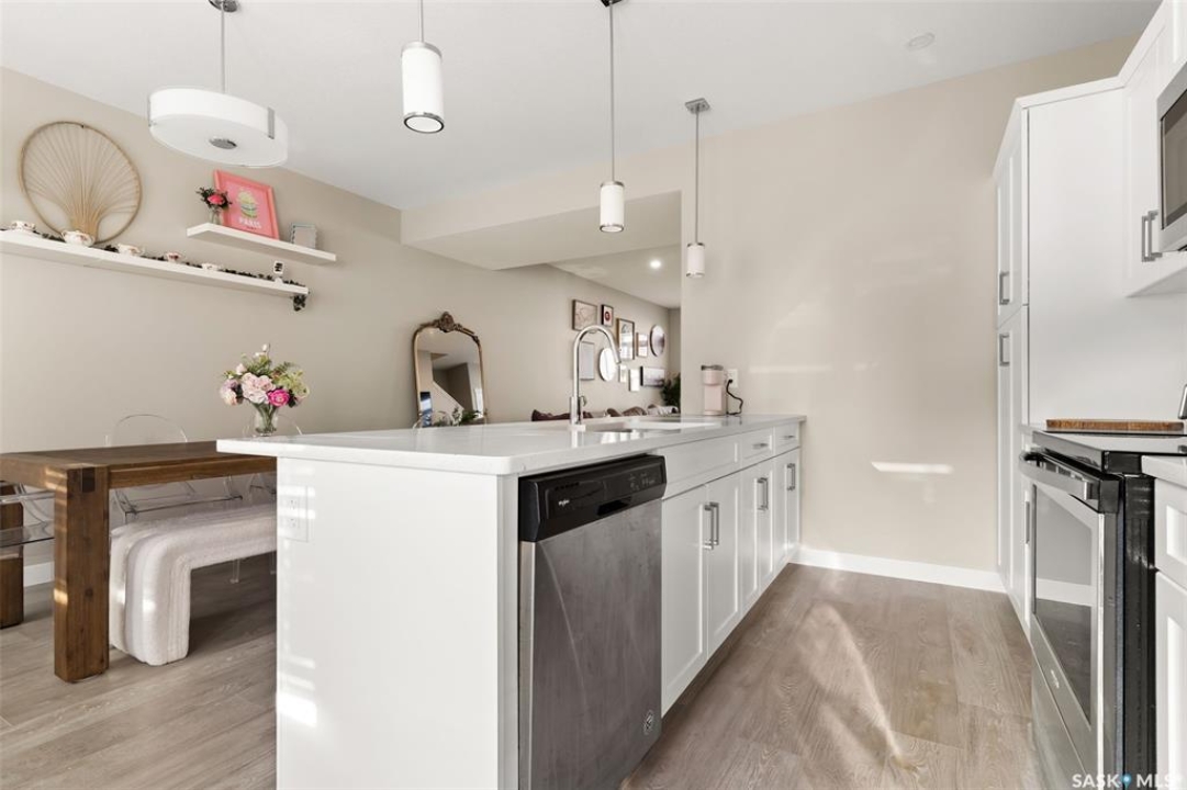 Welcome to 4233 E Keller Avenue, a beautifully designed freehold townhome with no condo fees located in The Towns. This property offers incredible value, modern finishes, and the ease of move-in-ready living. The exterior features contemporary curb appeal with low-maintenance siding and eye-catching stone accents. Step inside to a spacious front foyer with a double closet for convenient storage. The main floor boasts an airy, open-concept layout finished with 9 ft ceilings and luxury vinyl plank flooring. A large picture window brightens the living room, which flows seamlessly into the dining area overlooking the fully fenced backyard. The stylish kitchen is equipped with crisp white cabinetry, a generous sit-up island, quartz countertops, a double sink, accent lighting, and a full stainless steel appliance package. A 2-piece powder room, mudroom and access to the backyard complete the main level. Upstairs, plush carpet leads you to a cozy loft—perfect for a home office or reading nook. The primary bedroom offers plenty of space, complete with a walk-in closet and a 4-piece ensuite featuring a deep soaker tub and quartz-topped vanity. Two additional bedrooms, a second 4-piece bath, and convenient second-floor laundry complete this floor. The basement is framed and insulated along exterior walls, includes a rough-in for a future bathroom, and offers excellent storage or development potential. Outside, the fully fenced PVC yard includes a gate leading to the double parking pad with laneway access—making a future garage a great option. Added features include central air, owned water softener (2019) and new rented water heater (2025). Move in and enjoy!
