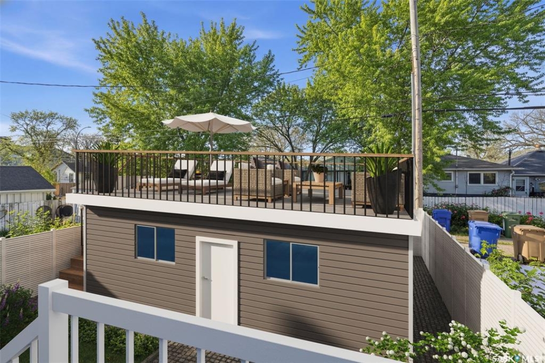 Welcome to this thoughtfully designed 2017 Alair Homes infill, ideally located on a quiet, tree-lined street in the heart of Cathedral, one of Regina's most vibrant and walkable neighbourhoods. Enjoy close proximity to Wascana Park, schools, shops, cafés, and restaurants. This two-storey home offers 3 bedrooms, 3 bathrooms, and a functional layout suited to modern living. The main floor features 9-foot ceilings, a dedicated office, a convenient 2-piece bathroom, and a bright open-concept design. The kitchen is both stylish and practical with beautiful cabinetry, quartz countertops, a peninsula island, corner pantry, and stainless steel appliances, flowing seamlessly into the dining and living areas. The living room is anchored by a cozy gas fireplace, perfect for relaxing or entertaining. Upstairs, you'll find three spacious bedrooms, including a generous primary suite with a large walk-in closet and a well-appointed ensuite featuring a separate shower and soaker tub. A second full bathroom and upstairs laundry add everyday convenience, with 9-foot ceilings continuing throughout the second level. The basement is insulated and ready for development, featuring high ceilings, large windows, and a truss floor system with no bulkheads to limit future design. A separate back entrance provides excellent potential for a future basement or secondary suite, subject to buyer verification of zoning and permits. A government grant may be available for secondary suites, including basement or laneway suites, subject to approval. Outside, the backyard features a poured double garage pad with alley access. Buyers may consider a future garage (image is AI generated) with a rooftop patio to create a private outdoor oasis, or a smaller garage to maximize yard space. Additional highlights include triple-pane windows, a high-efficiency furnace, central air conditioning, and low-maintenance landscaping with artificial turf and established rhubarb, raspberry, and strawberry plants.