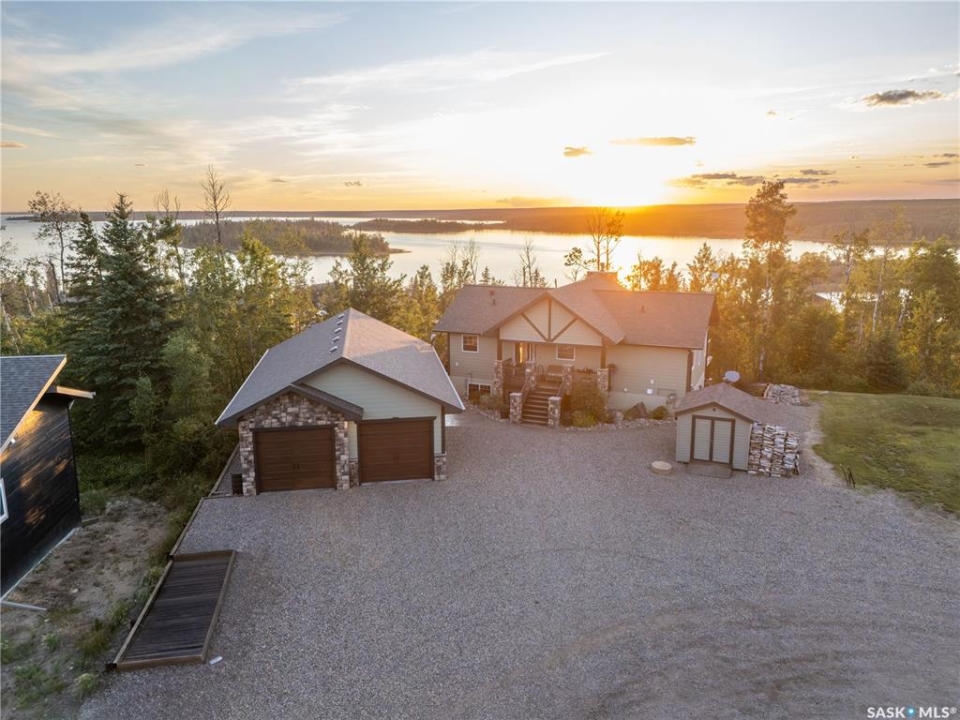 Luxurious 2,200 sq. ft. year-round home in Laumans Landing at Lac des Îles Lake, offering panoramic lake views and a bright open-concept layout. This exquisite 4-bedroom, 3-bathroom residence features vaulted ceilings, vinyl plank flooring throughout, a gourmet kitchen with a spacious butler's pantry, and a natural gas fireplace. The main-level primary suite includes a spa-like ensuite, while the fully developed walkout basement offers a private entrance, three additional bedrooms, a full bathroom, a comfortable family room, heated floors throughout, and ample storage. Year-round comfort is ensured with hot water on demand (supplied by the subdivision's reverse osmosis system), air conditioning, and a 15 kW auto-transfer Generac generator. Outdoor living shines with a 12' x 24' screened-in area with electrical and water, overlooking a seating area with a built-in rock fireplace, plus over 500 sq. ft. of Duradek decking. Built to last with Hardie Board siding and 50-year Malarkey shingles, the property also includes a 24' x 30' detached garage and storage shed, with the adjacent lot available for added privacy. Enjoy easy access to the boat launch and community playground, just 5 minutes from Northern Meadows 18-hole Golf Course, all within Meadow Lake Provincial Park—ideal for fishing Northern Pike, Walleye, Yellow Perch, and Whitefish. Conveniently located approximately 2 hours north of Lloydminster, 4 hours north of Saskatoon, and 3 hours and 45 minutes northeast of Edmonton.