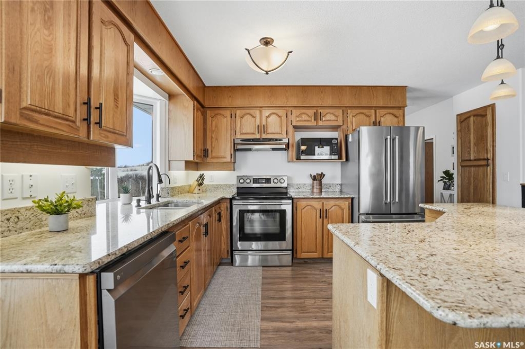 Beautiful 1,524 square-foot bungalow set on 24 scenic acres of valley hillside, offering stunning views of the Lumsden Valley. The home features a large kitchen with spacious eating area, an abundance of cabinetry with built-in dishwasher, granite countertops and backsplash, a center island , stainless steel appliances, and a reverse osmosis system. The fridge was updated in 2023 and the dishwasher in 2021. The main floor offers three generous bedrooms, including a primary bedroom with walk-in closet and three-piece ensuite. New flooring and paint were completed in 2020. The living room boasts a vaulted ceiling, new blinds installed in 2021, and updated windows and living room door completed in 2023. A huge laundry, storage area, and foyer is conveniently located on the main floor with direct entry to the heated garage. The basement features a massive family room, two additional bedrooms, a bathroom, dedicated storage area, and one large unfinished space. New basement windows have also been added. Additional upgrades include a furnace and air conditioning system installed in 2019, new garage door, and garage heater. The front of the property has been enhanced with new concrete and fencing, and the nicely landscaped yard complements the well-treed acreage. Steel roof, The land offers a blend of private open spaces and excellent potential building sites for future outbuildings. A truly impressive acreage property—call the seller's agent today for your own private viewing.