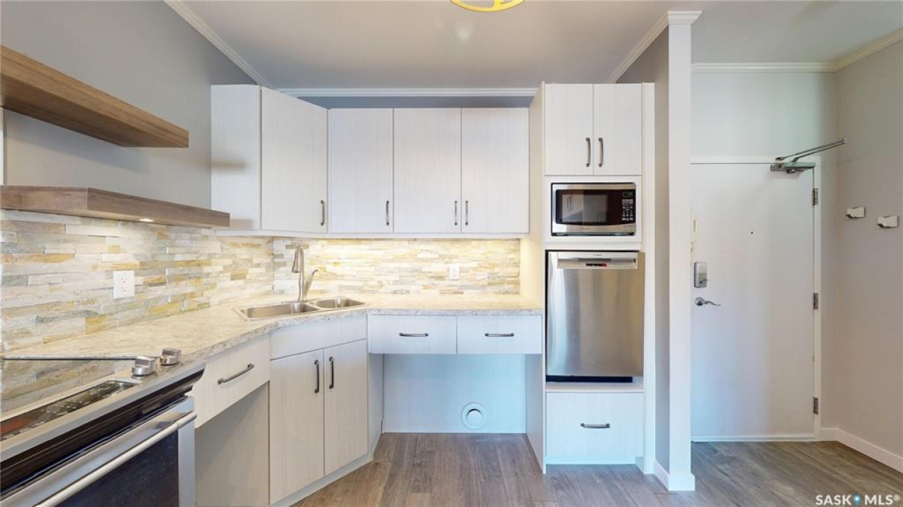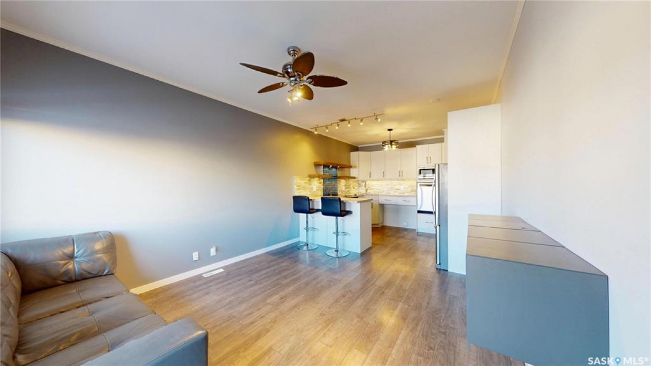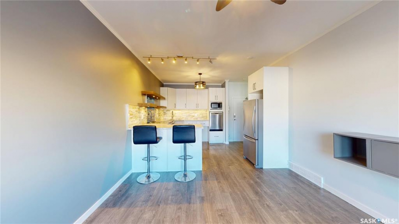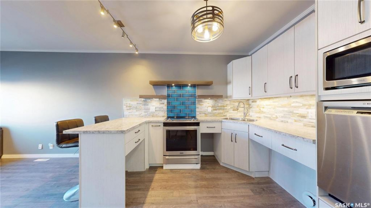 Awesome pet-friendly condo with 2 bedrooms, 2 full bathrooms, and 2 parking spaces ready for immediate possession! Please view the Matterport 3D virtual tour in this listing. You'll love the stylish kitchen with floating shelves, stone wall tile, and sleek stainless steel appliances. The open-concept kitchen, dining area, and living room have an airy feel with nine-foot ceilings, a ceiling fan, and durable laminate flooring. A garden door leads to the balcony with a glass railing, where you can relax with your morning coffee and enjoy the fresh air. In-suite laundry, forced air heating, and central air conditioning are more desirable amenities. The primary bedroom has a 3pc ensuite with a shower and a walk-in closet. This ground-floor unit is located right next to a building exit hallway, leaving you with one less adjacent neighbour, and the surface parking stall is right outside the door for added convenience. The heated underground parking stall will keep your car warm through the winter, and additional storage is located in front of the underground stall. The kitchen and the main bathroom feature universal design and accessibility enhancements, offering comfortable functionality for all users. A professional home inspection report and a Property Condition Disclosure Statement (PCDS) are available for review, giving buyers the opportunity to make a more informed offer. Call now for your own private viewing.