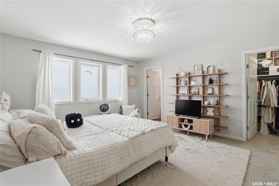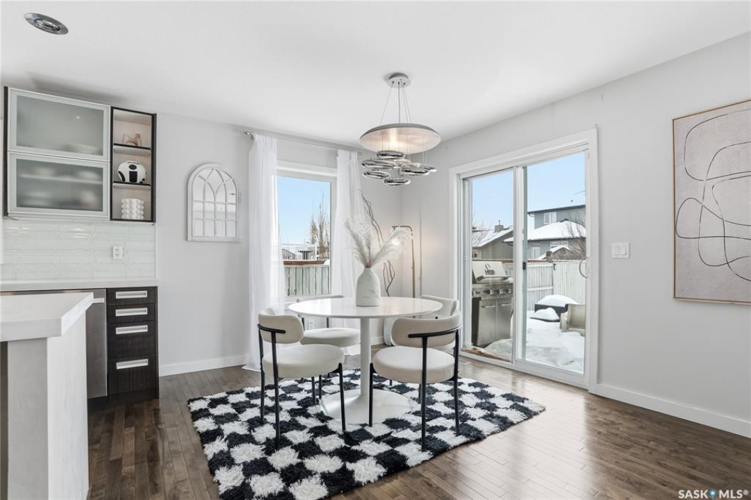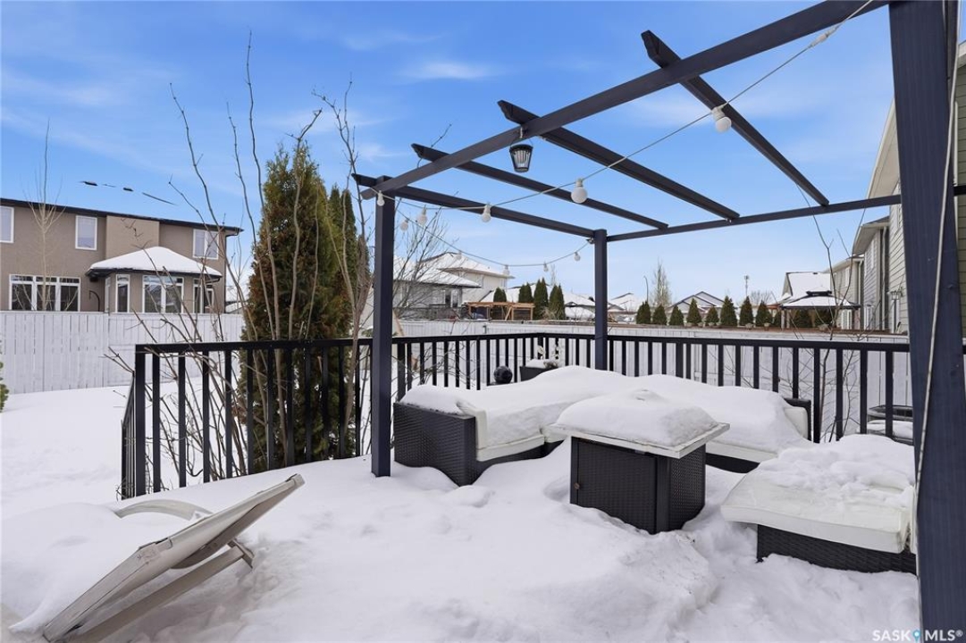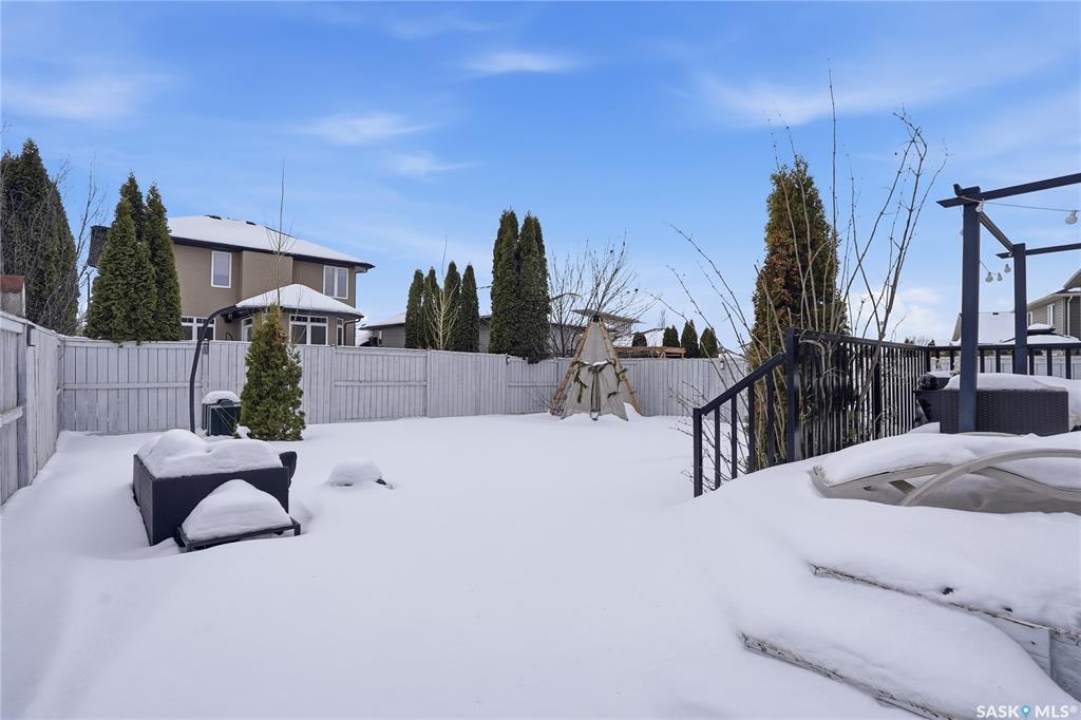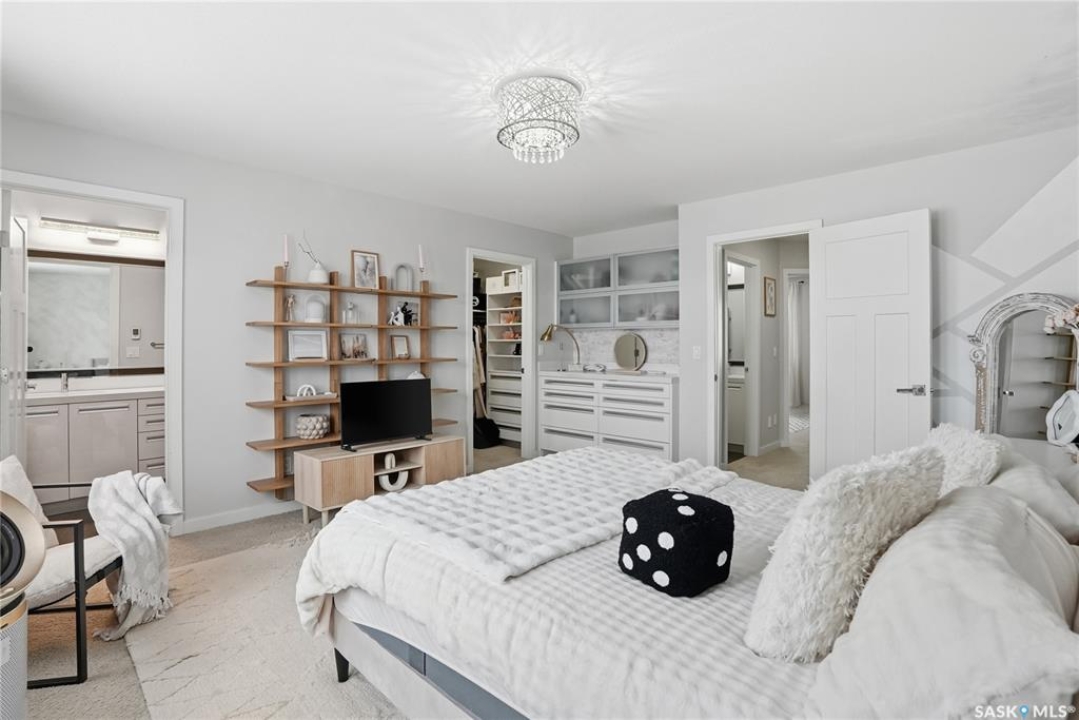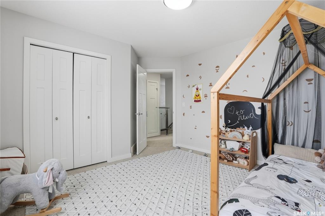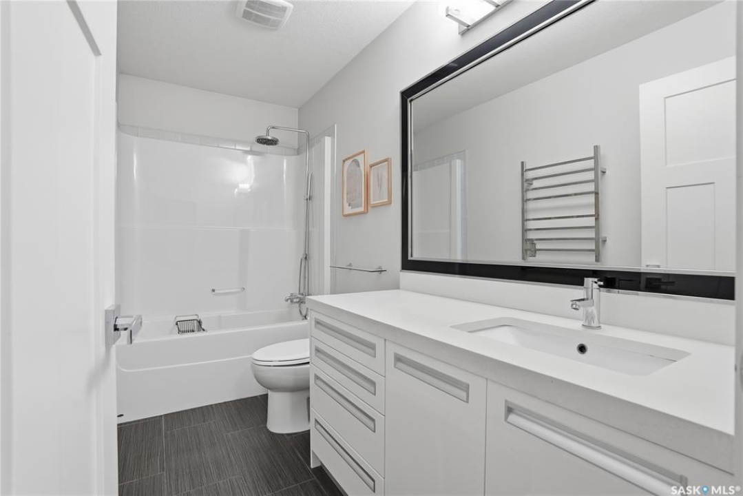 Great family home in the heart of Hampton Village with quick access to shopping, restaurants or Circle Drive to get you to the rest of the city quickly. You'll be impressed the minute you walk thru the ornate front door, greeted by gleaming hardwood floors in the front entry, there is a double wide coat closet and a wide hall that leads you to the attached garage door, the laundry closet and the 2pce bathroom with heated tile floor. The front entry hardwood flows across the main floor into the kitchen, dining room and living room. The kitchen is gorgeous with dark wood grain cabinets with a couple gull-wing glass doors, glass tile backsplash, quartz countertops and island top, stainless steel appliances and pendant lighting. The dining room is adjacent with double doors to the deck and backyard, and this level is open concept to the spacious living room with a grid paneling design feature wall all finished in contemporary white. Upstairs you find the master bedroom with cozy carpet flooring, a walkin closet that is organized with open shelving, drawers, shoe racks and hanger rods, built into the corner of this bedroom is a makeup center with more storage drawers on the bottom and glass gull-wing door cabinets above. The ensuite has a quartz vanity, ceramic tile heated floor and double wide shower with tiled walls and rain down shower head and a heated towel rack. This level also has 2 more spare bedrooms, linen closet and a 4pce bath also with quartz vanity and heated tiled floor and bathtub. The basement is unfinished but is plumbed for another bathroom, could have 2 more bedrooms, family room. The back yard is completely fenced, has a deck with aluminum rails and pergola frame, lawn, trees and shrubs. The double attached garage is insulated and boarded on the inside and the front driveway is double wide stamped and colored concrete. This house has very durable Hardy concrete board siding, Hi efficient furnace and water heater, a/c. Offers presented Jan 20/26 @5pm.