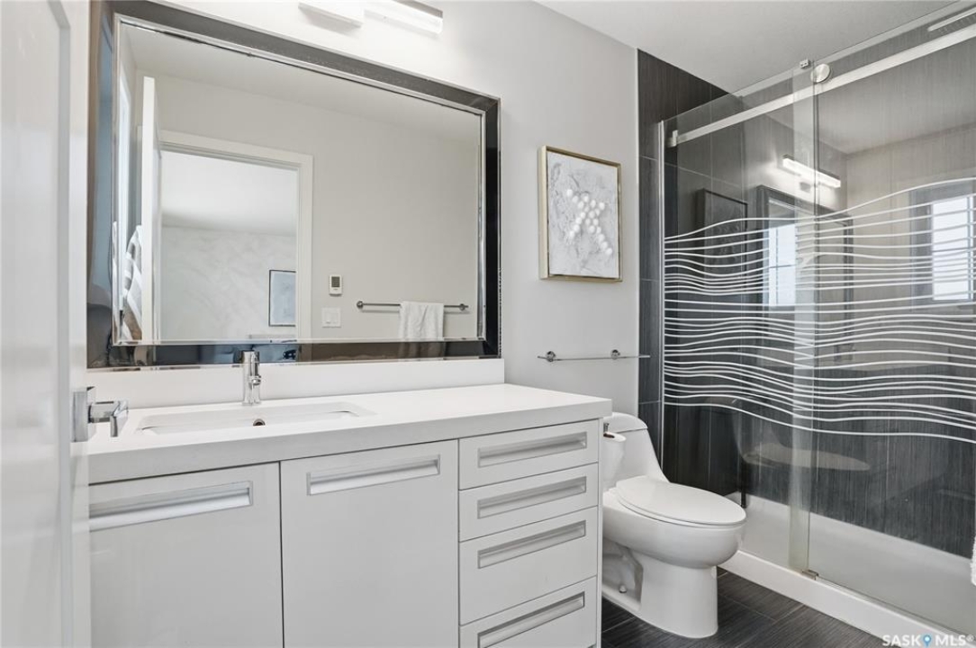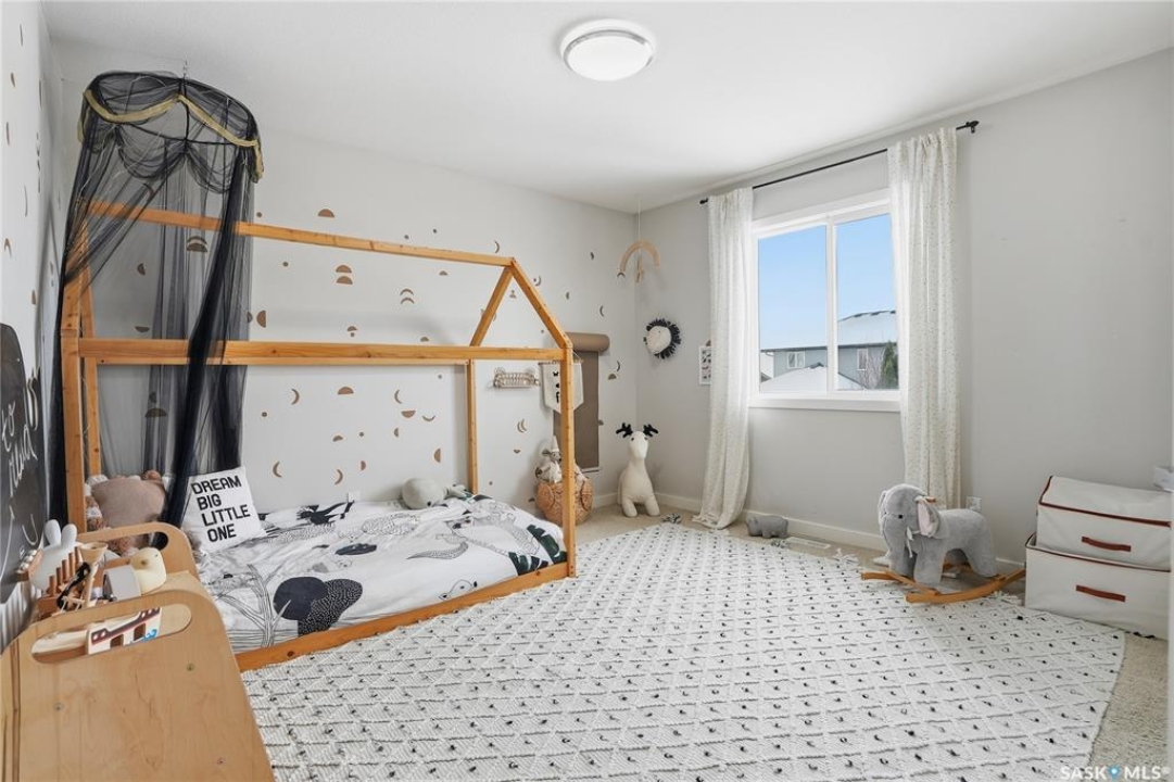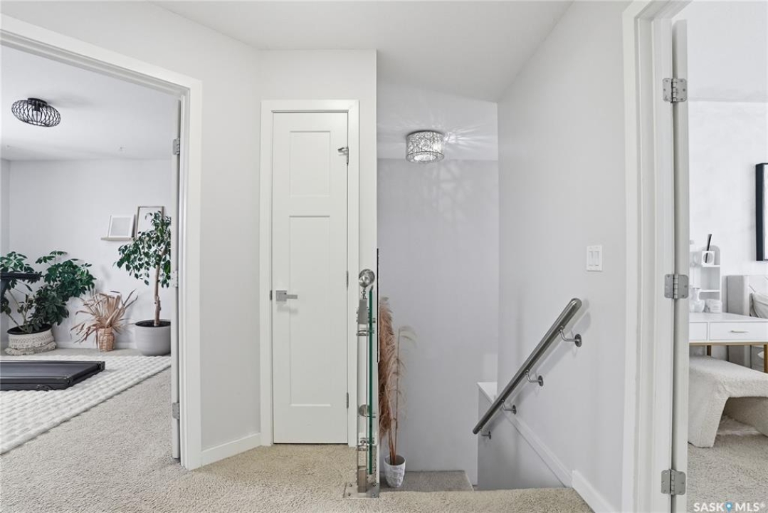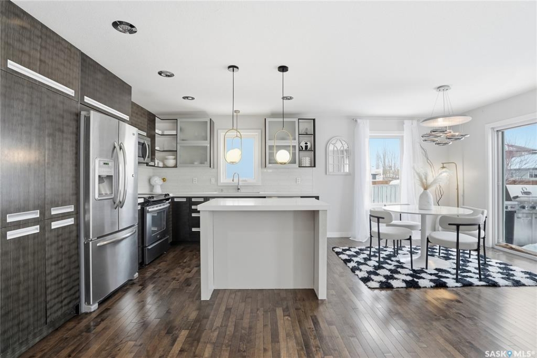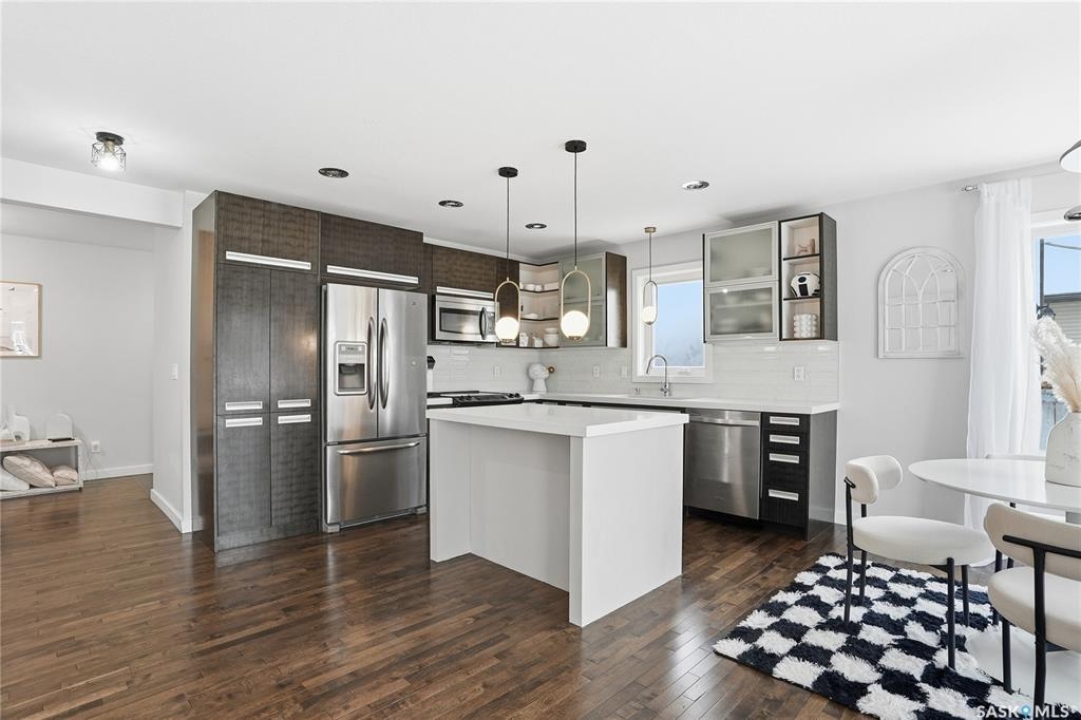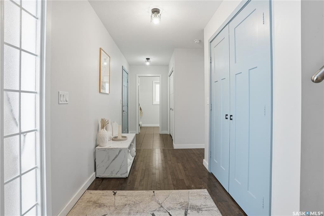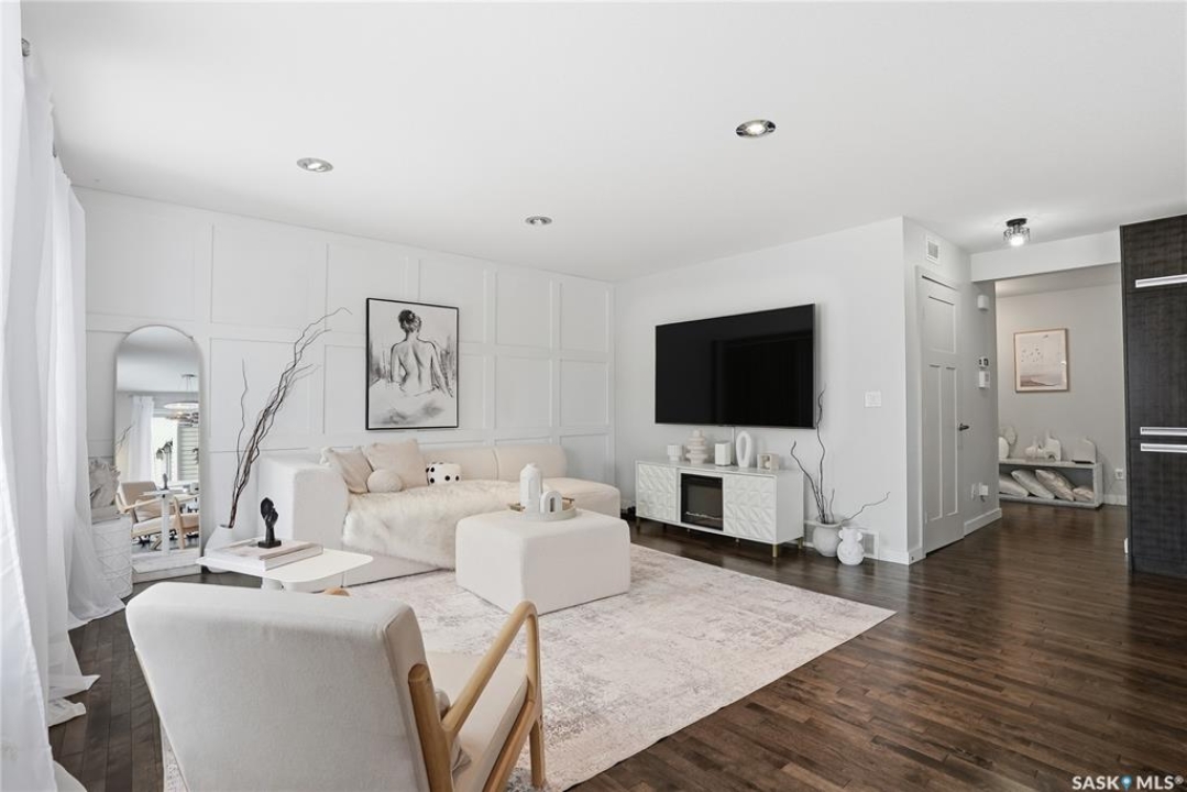 Great family home in the heart of Hampton Village with quick access to shopping, restaurants or Circle Drive to get you to the rest of the city quickly. You'll be impressed the minute you walk thru the ornate front door, greeted by gleaming hardwood floors in the front entry, there is a double wide coat closet and a wide hall that leads you to the attached garage door, the laundry closet and the 2pce bathroom with heated tile floor. The front entry hardwood flows across the main floor into the kitchen, dining room and living room. The kitchen is gorgeous with dark wood grain cabinets with a couple gull-wing glass doors, glass tile backsplash, quartz countertops and island top, stainless steel appliances and pendant lighting. The dining room is adjacent with double doors to the deck and backyard, and this level is open concept to the spacious living room with a grid paneling design feature wall all finished in contemporary white. Upstairs you find the master bedroom with cozy carpet flooring, a walkin closet that is organized with open shelving, drawers, shoe racks and hanger rods, built into the corner of this bedroom is a makeup center with more storage drawers on the bottom and glass gull-wing door cabinets above. The ensuite has a quartz vanity, ceramic tile heated floor and double wide shower with tiled walls and rain down shower head and a heated towel rack. This level also has 2 more spare bedrooms, linen closet and a 4pce bath also with quartz vanity and heated tiled floor and bathtub. The basement is unfinished but is plumbed for another bathroom, could have 2 more bedrooms, family room. The back yard is completely fenced, has a deck with aluminum rails and pergola frame, lawn, trees and shrubs. The double attached garage is insulated and boarded on the inside and the front driveway is double wide stamped and colored concrete. This house has very durable Hardy concrete board siding, Hi efficient furnace and water heater, a/c. Offers presented Jan 20/26 @5pm.