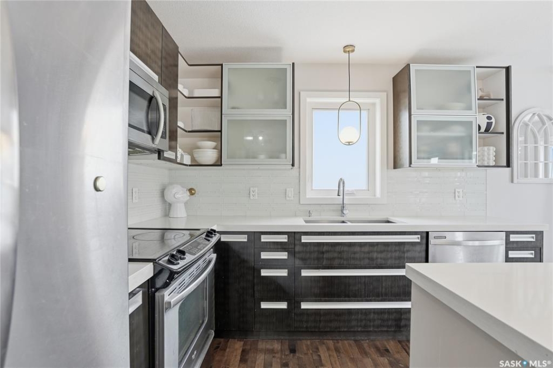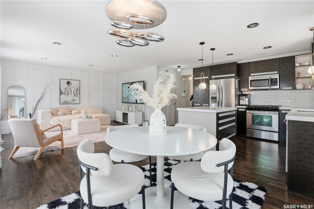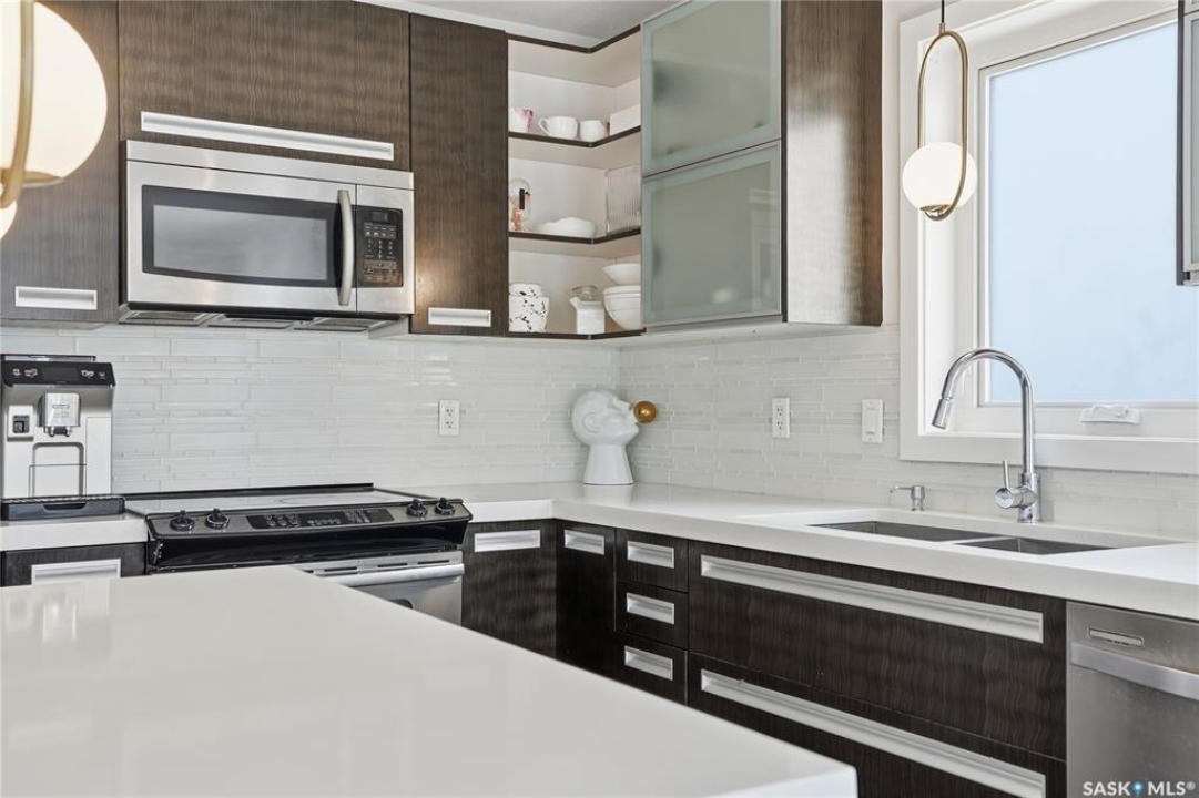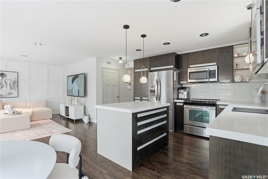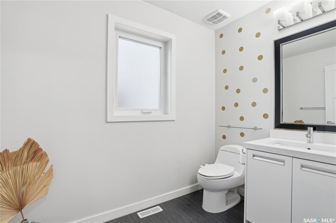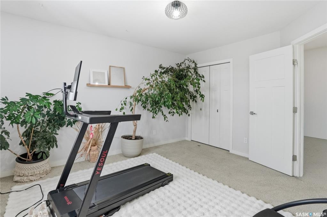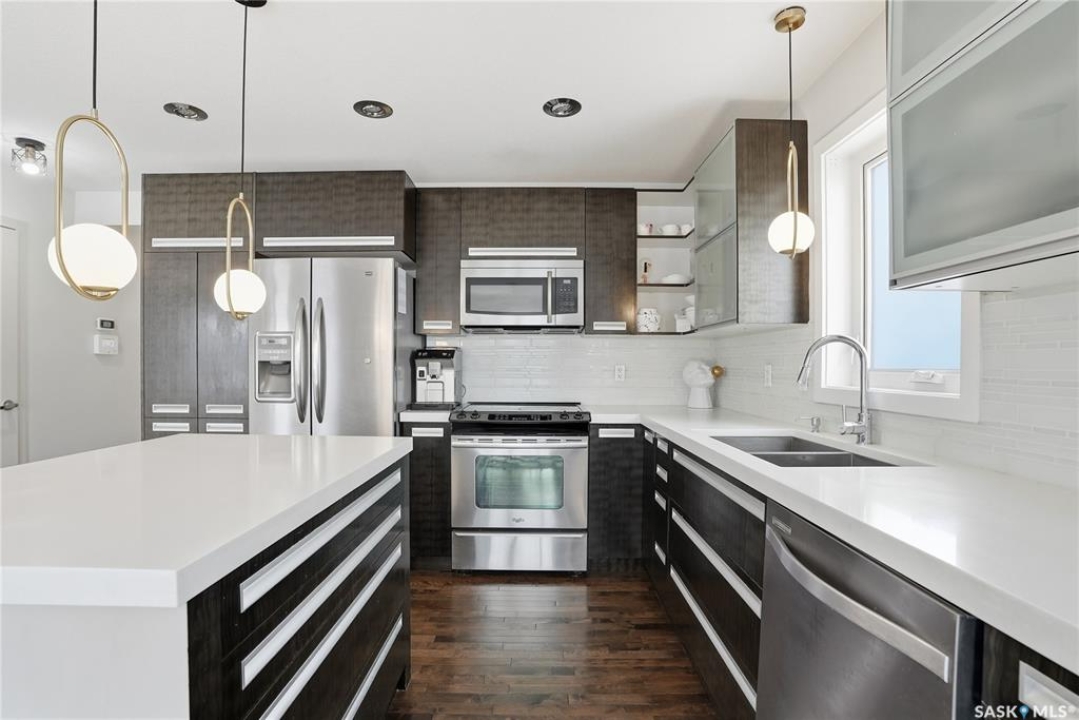 Great family home in the heart of Hampton Village with quick access to shopping, restaurants or Circle Drive to get you to the rest of the city quickly. You'll be impressed the minute you walk thru the ornate front door, greeted by gleaming hardwood floors in the front entry, there is a double wide coat closet and a wide hall that leads you to the attached garage door, the laundry closet and the 2pce bathroom with heated tile floor. The front entry hardwood flows across the main floor into the kitchen, dining room and living room. The kitchen is gorgeous with dark wood grain cabinets with a couple gull-wing glass doors, glass tile backsplash, quartz countertops and island top, stainless steel appliances and pendant lighting. The dining room is adjacent with double doors to the deck and backyard, and this level is open concept to the spacious living room with a grid paneling design feature wall all finished in contemporary white. Upstairs you find the master bedroom with cozy carpet flooring, a walkin closet that is organized with open shelving, drawers, shoe racks and hanger rods, built into the corner of this bedroom is a makeup center with more storage drawers on the bottom and glass gull-wing door cabinets above. The ensuite has a quartz vanity, ceramic tile heated floor and double wide shower with tiled walls and rain down shower head and a heated towel rack. This level also has 2 more spare bedrooms, linen closet and a 4pce bath also with quartz vanity and heated tiled floor and bathtub. The basement is unfinished but is plumbed for another bathroom, could have 2 more bedrooms, family room. The back yard is completely fenced, has a deck with aluminum rails and pergola frame, lawn, trees and shrubs. The double attached garage is insulated and boarded on the inside and the front driveway is double wide stamped and colored concrete. This house has very durable Hardy concrete board siding, Hi efficient furnace and water heater, a/c. Offers presented Jan 20/26 @5pm.