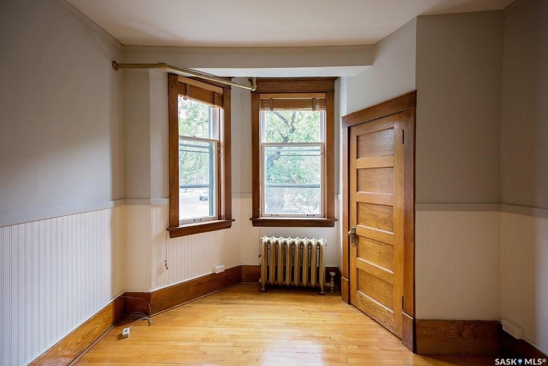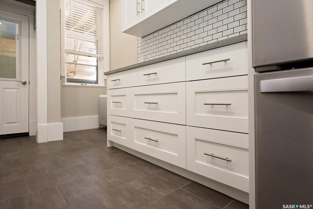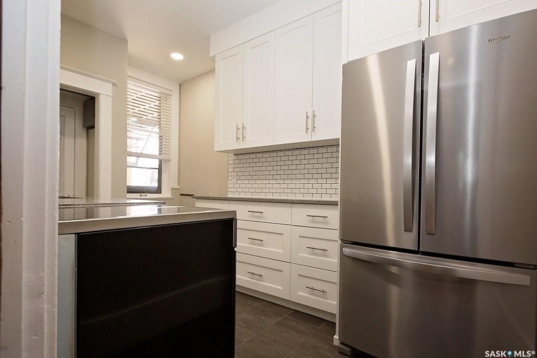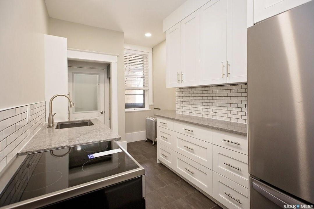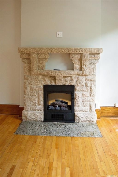 Beautifully upgraded Heritage home with 2 blocks to Wascana Park, downtown and all the amenities of the Transition Area. This home shows extensive original character including wood work including transom windows, hardwood floors, the original stone fireplace restored with a convenient electric insert. The improvements were recently completed including extensive electrical upgrades to the unit, water supply and drain to the main supply of the building. The kitchen was renovated with customized cabinetry providing function, flow and storage and solid stone countertops. The bathroom is luxurious with a deep soaker tub, custom cabinetry and Porcelain tile. Both of the bedrooms are a generous size for the era and also feature custom built ins for extra storage. This home also comes with an additional storage room on site in the lower level of the building.
