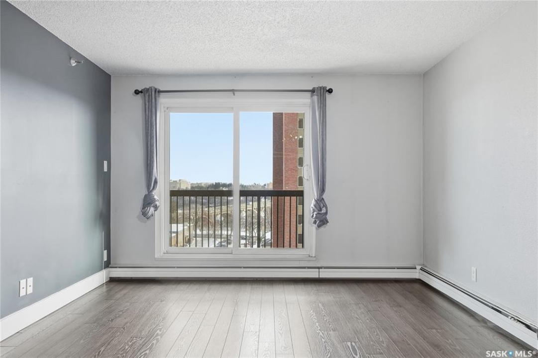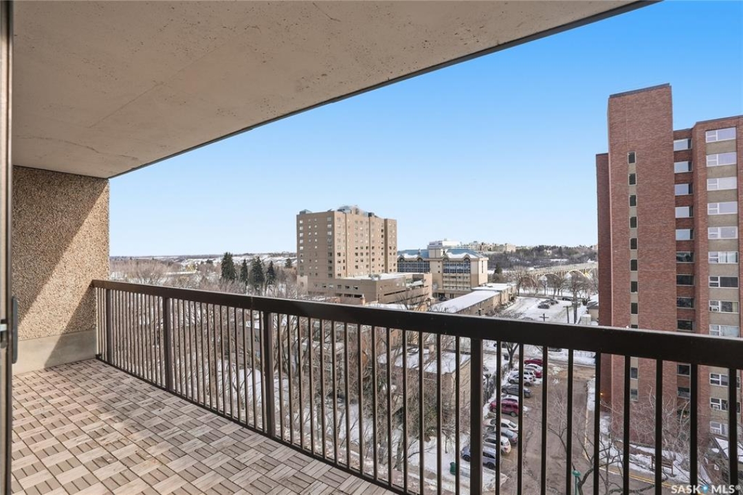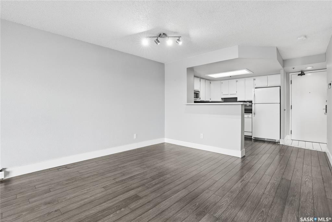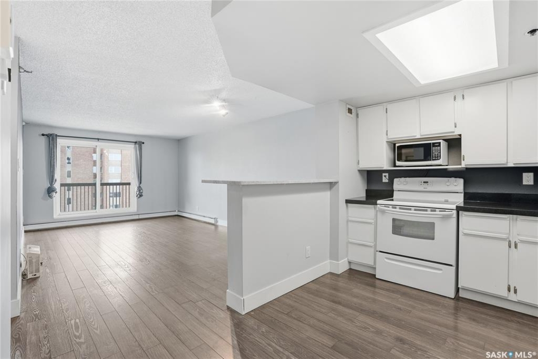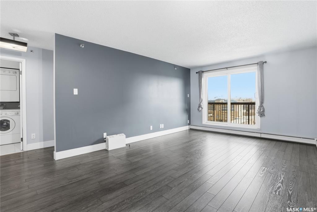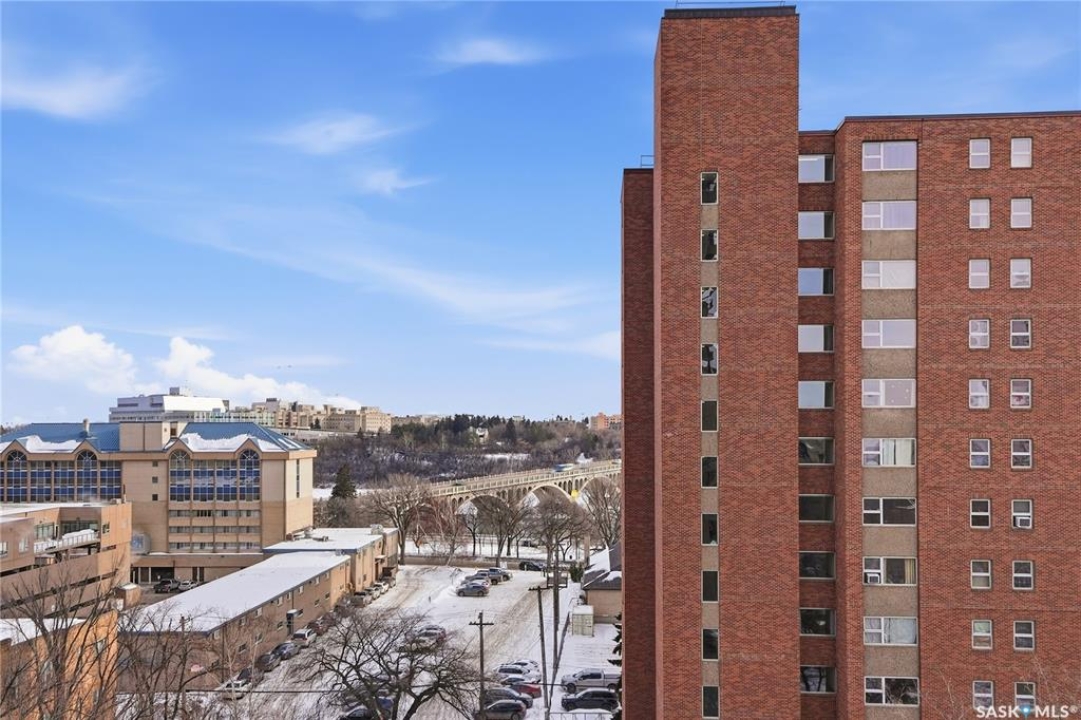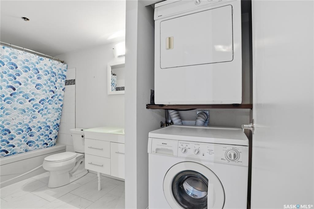 Welcome to unit #905 – 311 6th Avenue North, a 677 sq ft 9th floor condo located in Saskatoon's Central Business District. Coming inside, you are met with a bright, open concept floor plan. Your kitchen features quartz countertops, fridge, stove, microwave and dishwasher, white painted cabinets, and marble breakfast bar great for additional seating. Open to your dinette, and family room. With sliding door access to your East facing balcony, with PVC siding, and beautiful views overlooking Kinsmen Park and the river. Your bedroom provides ample space with a closet with custom organizers and continued laminate flooring. Your 4-pc bath features tile flooring, tile surround tub, modern vanity, and stacking washer/dryer for convenient in-suite laundry. 1 underground parking stall is included. Complex contains a workout room, a sports court, convenience store, hair salon, dry sauna, and much more – making this a highly desired building! Do not miss out on this downtown opportunity!