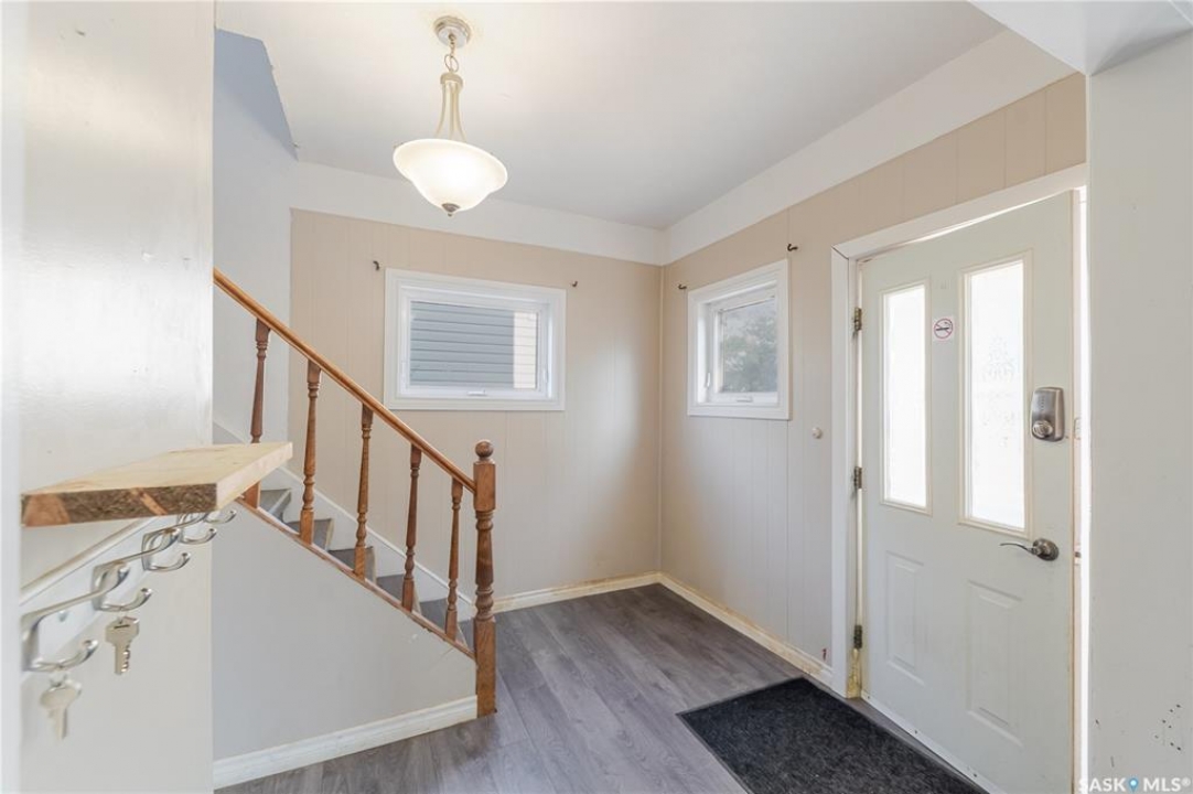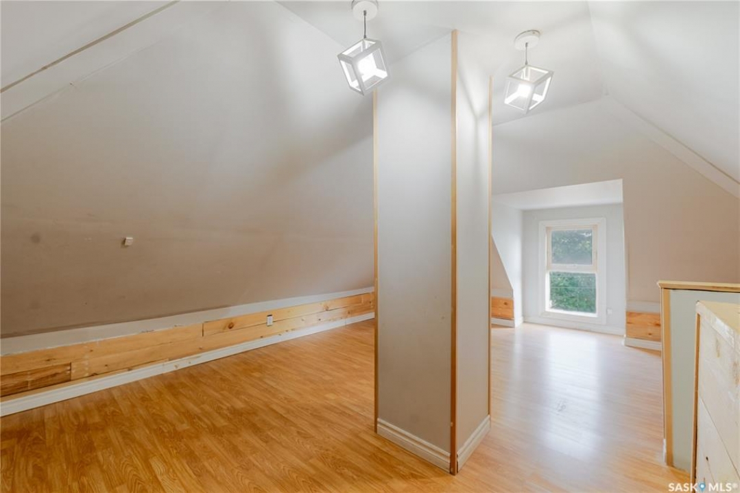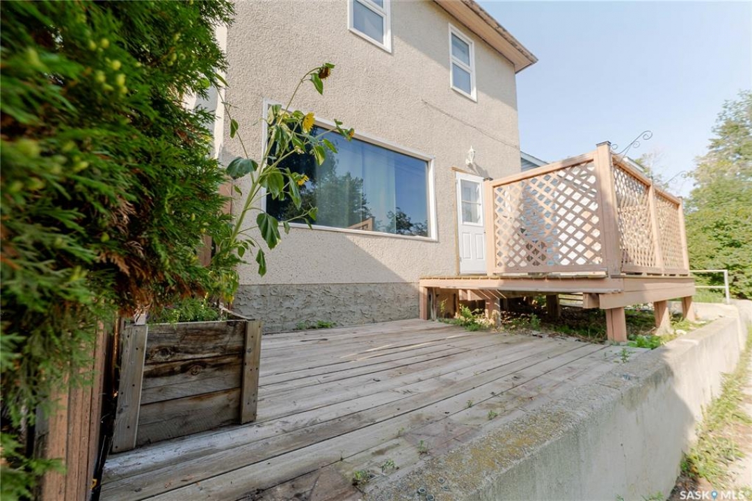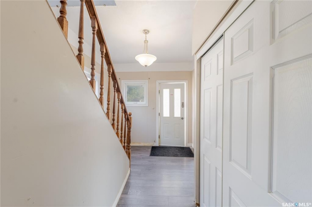 Welcome to this inviting two and a half storey home that blends character, comfort, and affordability. A welcoming front deck with a unique second tier perfect for relaxing, entertaining, or even creating a potted garden sets the tone. Inside, the spacious foyer includes a built-in closet and 9-foot ceilings, creating an open and airy first impression. The open concept living and dining rooms feature laminate flooring and plenty of room for family gatherings or hosting friends. The updated kitchen boasts maple cabinetry, ample counter space, a built-in dishwasher, fridge, stove, and a coffee bar area. From here, a mudroom leads to the patio and fully fenced yard. Upstairs, you will find three generously sized bedrooms and a refreshed four-piece bathroom with extra storage. The top floor loft offers incredible versatility with enough space for a kids' play area, a home office, or a cozy reading nook while enjoying beautiful views. The basement, though unfinished, provides laundry facilities and abundant storage. Recent updates include shingles, some PVC style windows, kitchen and bath upgrades, a high efficiency furnace, water heater, and central air for those warm Saskatchewan summers. Outside, there is a deck and patio area with some mature trees, all inside a fully fenced yard. While the backyard needs some care, this home is still a great choice for first time buyers, growing families, or investors looking for space and potential at an affordable price.