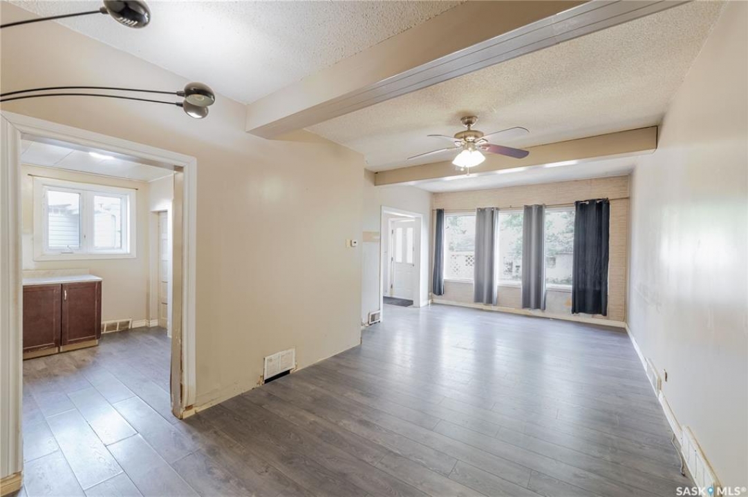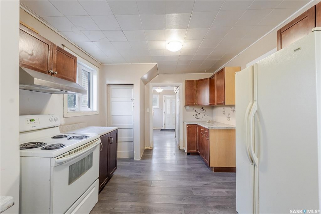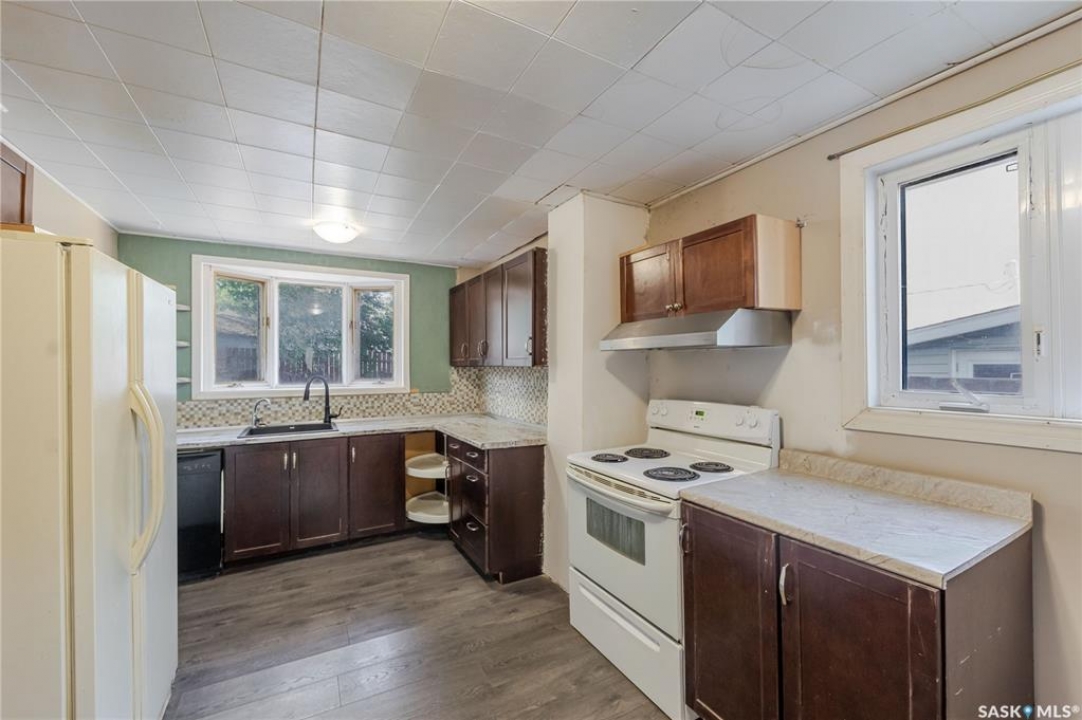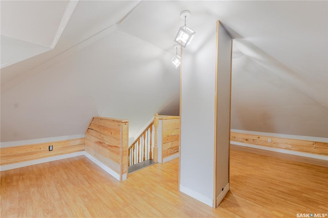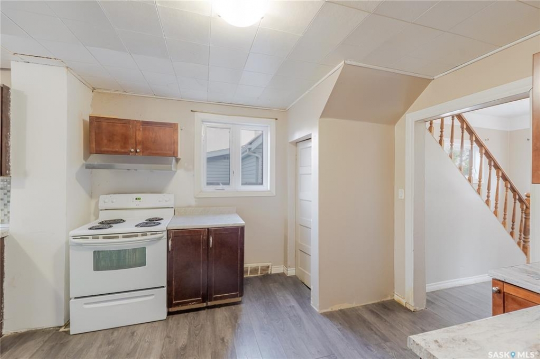 Welcome to this inviting two and a half storey home that blends character, comfort, and affordability. A welcoming front deck with a unique second tier perfect for relaxing, entertaining, or even creating a potted garden sets the tone. Inside, the spacious foyer includes a built-in closet and 9-foot ceilings, creating an open and airy first impression. The open concept living and dining rooms feature laminate flooring and plenty of room for family gatherings or hosting friends. The updated kitchen boasts maple cabinetry, ample counter space, a built-in dishwasher, fridge, stove, and a coffee bar area. From here, a mudroom leads to the patio and fully fenced yard. Upstairs, you will find three generously sized bedrooms and a refreshed four-piece bathroom with extra storage. The top floor loft offers incredible versatility with enough space for a kids' play area, a home office, or a cozy reading nook while enjoying beautiful views. The basement, though unfinished, provides laundry facilities and abundant storage. Recent updates include shingles, some PVC style windows, kitchen and bath upgrades, a high efficiency furnace, water heater, and central air for those warm Saskatchewan summers. Outside, there is a deck and patio area with some mature trees, all inside a fully fenced yard. While the backyard needs some care, this home is still a great choice for first time buyers, growing families, or investors looking for space and potential at an affordable price.