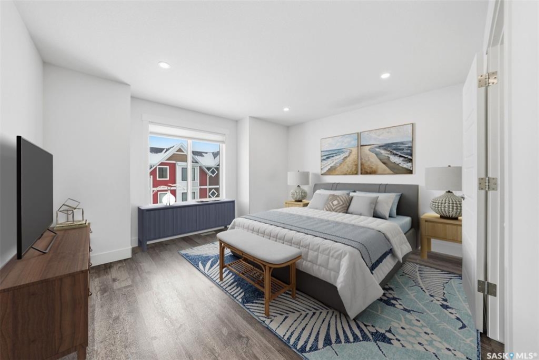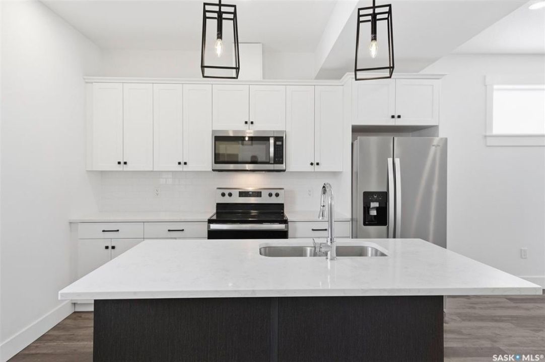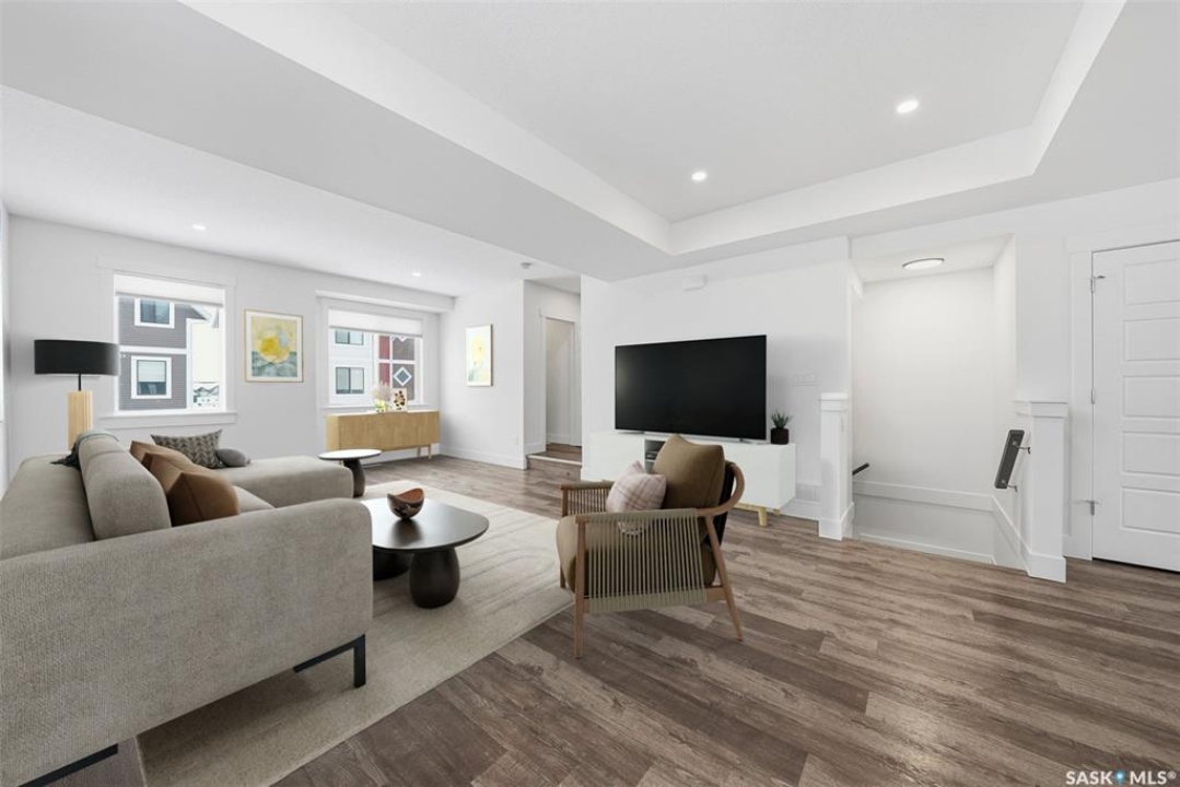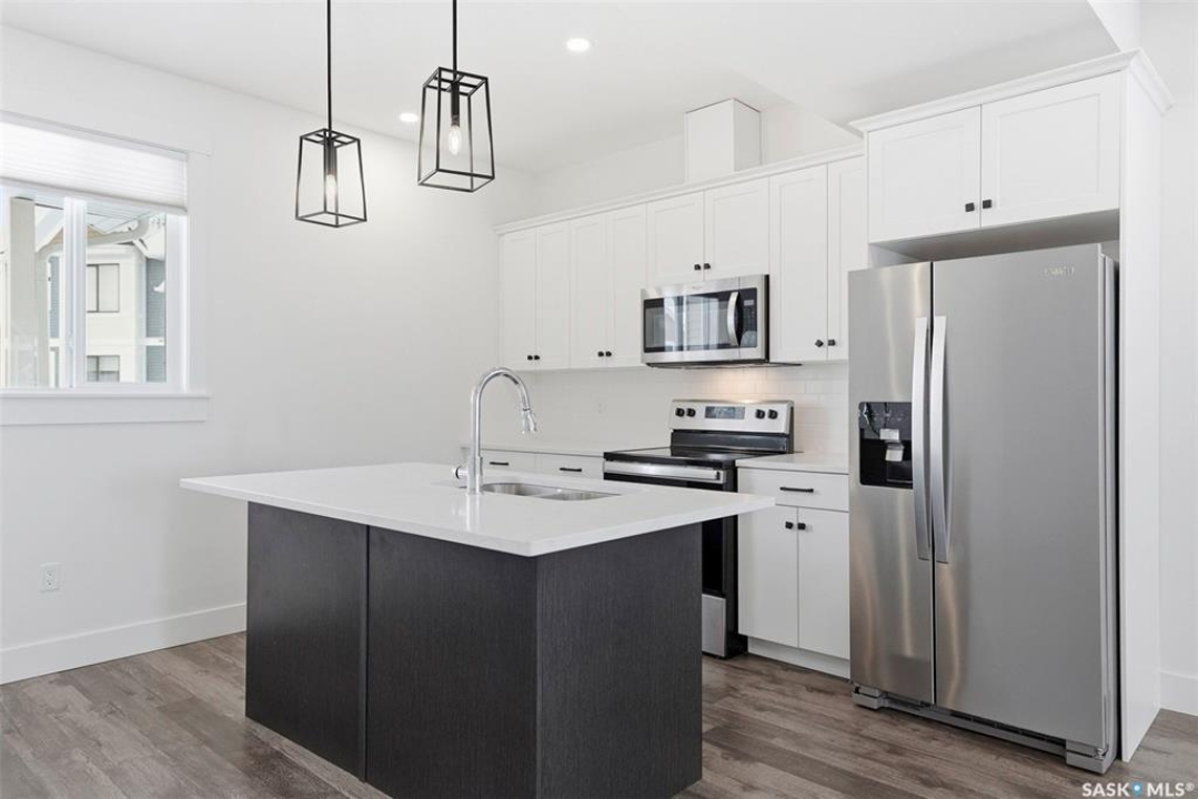 This bright and spacious home features 9-foot ceilings, with the main floor offering an open-concept great room design. The chef-style kitchen includes a walk-in pantry, soft-close cabinetry, quartz countertops, tiled backsplash, and stainless steel appliances. The kitchen flows seamlessly into the inviting living area, creating a perfect space for everyday living and entertaining. A convenient two-piece powder room completes the main level. Upstairs, you'll find three bedrooms and two bathrooms, including a comfortable primary suite with a walk-in closet and relaxing ensuite. Laundry is thoughtfully located on the upper floor for added convenience. The heated tandem garage provides ample space for parking and storage. Outside, enjoy a fenced backyard with patio space and an upper balcony that backs directly onto a beautiful green-space park with walking paths. All appliances are included. Ideally located close to schools, trails, amenities, and the Legends Golf Course, this home offers a perfect blend of comfort, style, and location. This complex is pet friendly and has a fully fenced back yard. Move in ready for your convenience.