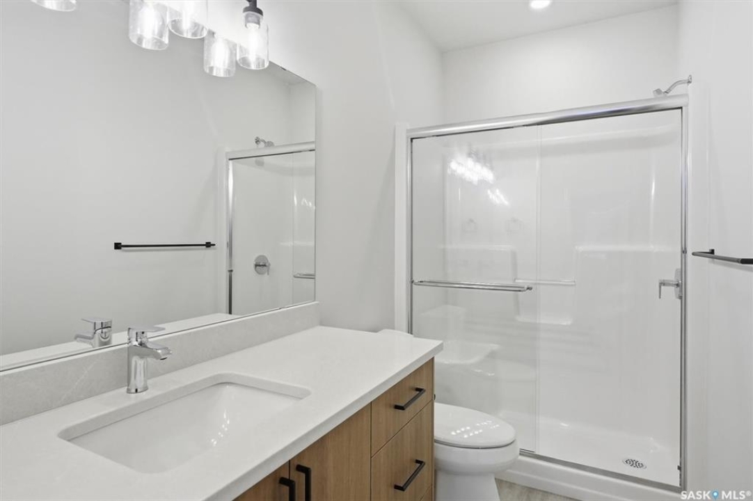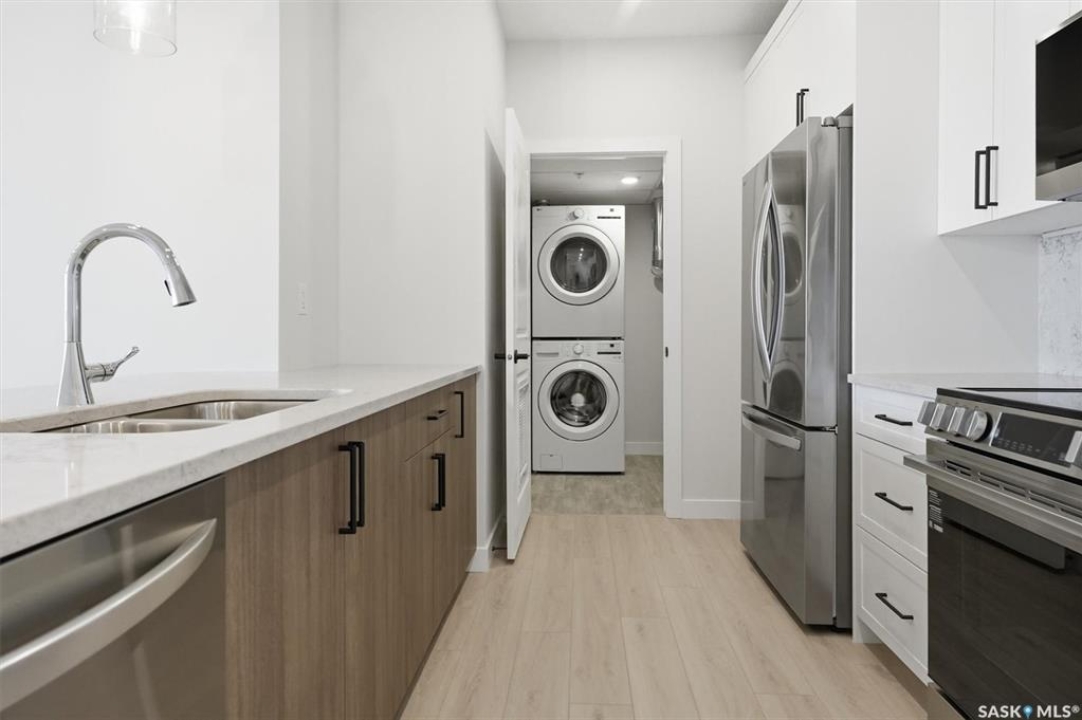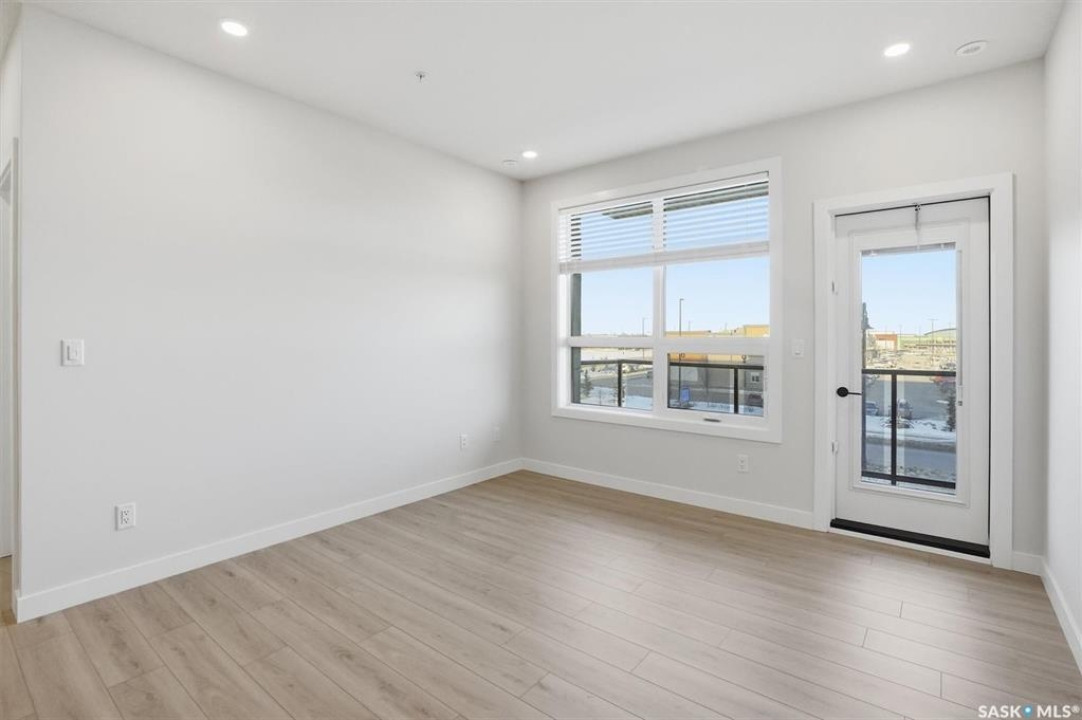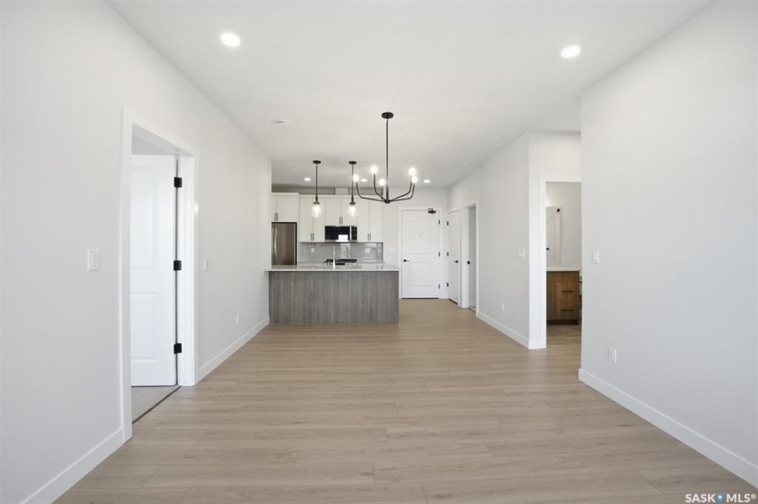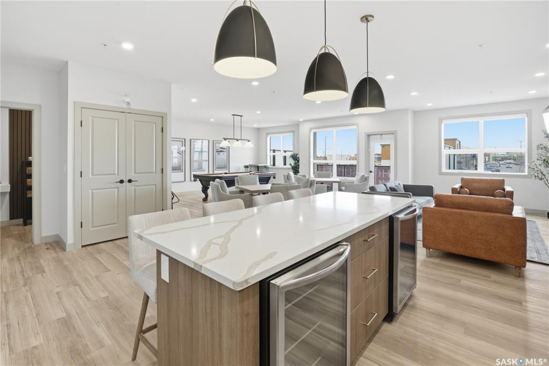 Welcome to ‘RYSE by North Ridge' located in Saskatoon's growing community of Brighton! RYSE is a modernized apartment style condominium complex offering 1 bedroom, 2 bedroom, and 2 bedroom + den options. You will immediately notice the welcoming nature of RYSE the moment you step into the warm and inviting front entrance. Unit 1304 (Skyline II layout) is a north west facing 1024 sq ft condo with 2 bedrooms, 2 bathrooms, a den, separate laundry room, galley style kitchen, and dining/living areas. The interior features high end designer finishes, fixtures, countertops, and flooring, all with quality built craftsmanship. A private partially covered balcony awaits complete with duradeck, glass railing, natural gas bbq outlet, and electrical outlet. Each condo unit comes with a parking stall located in the heated parkade as well as a convenient storage room. Exterior parking stalls may be available to purchase. Each unit also includes a kitchen and laundry appliance package and air conditioning. RYSE has an amenity room for you to visit and relax featuring a bar area, comfortable seating, pool table, bathroom, and an outdoor patio lounge. GST and PST included in purchase price with any rebates to builder. Sask Home Warranty Premium Coverage Plan. This prime location is within a few minute walk to grocery/shopping/restaurants/bus and several other amenities. Show home hours are Mon thru Thurs 5-8PM and Weekends 12-5PM. Call to view!