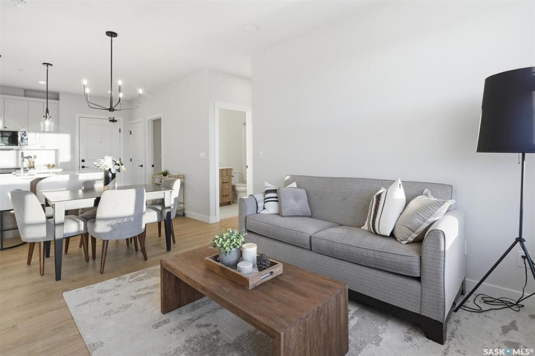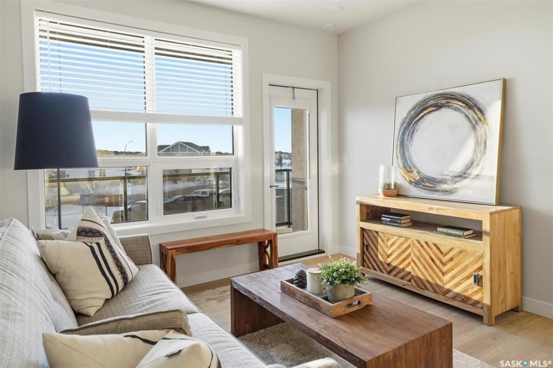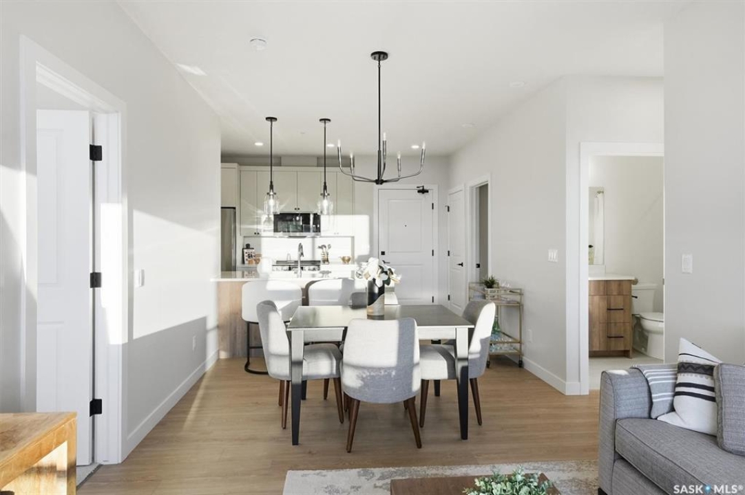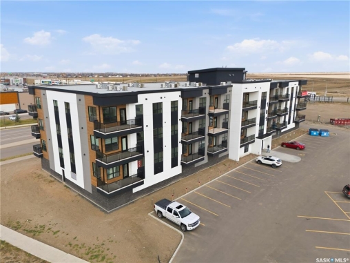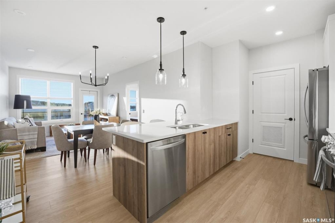 Welcome to ‘RYSE by North Ridge' located in Saskatoon's growing community of Brighton! RYSE is a modernized apartment style condominium complex offering 1 bedroom, 2 bedroom, and 2 bedroom + den options. You will immediately notice the welcoming nature of RYSE the moment you step into the warm and inviting front entrance. Unit 1203 (Skyline layout) is a south east facing 964 sq ft condo with 2 bedrooms, 2 bathrooms, a den, separate laundry room, galley style kitchen, and dining/living areas. The interior features high end designer finishes, fixtures, countertops, and flooring, all with quality built craftsmanship. A private partially covered balcony awaits complete with duradeck, glass railing, natural gas bbq outlet, and electrical outlet. Each condo unit comes with a parking stall located in the heated parkade as well as a convenient storage room. Exterior parking stalls may be available to purchase. Each unit also includes a kitchen and laundry appliance package and air conditioning. RYSE has an amenity room for you to visit and relax featuring a bar area, comfortable seating, pool table, bathroom, and an outdoor patio lounge. GST and PST included in purchase price with any rebates to builder. Sask Home Warranty Premium Coverage Plan. This prime location is within a few minute walk to grocery/shopping/restaurants/bus and several other amenities. Show home hours are Mon thru Thurs 5-8PM and Weekends 12-5PM. Call to view!