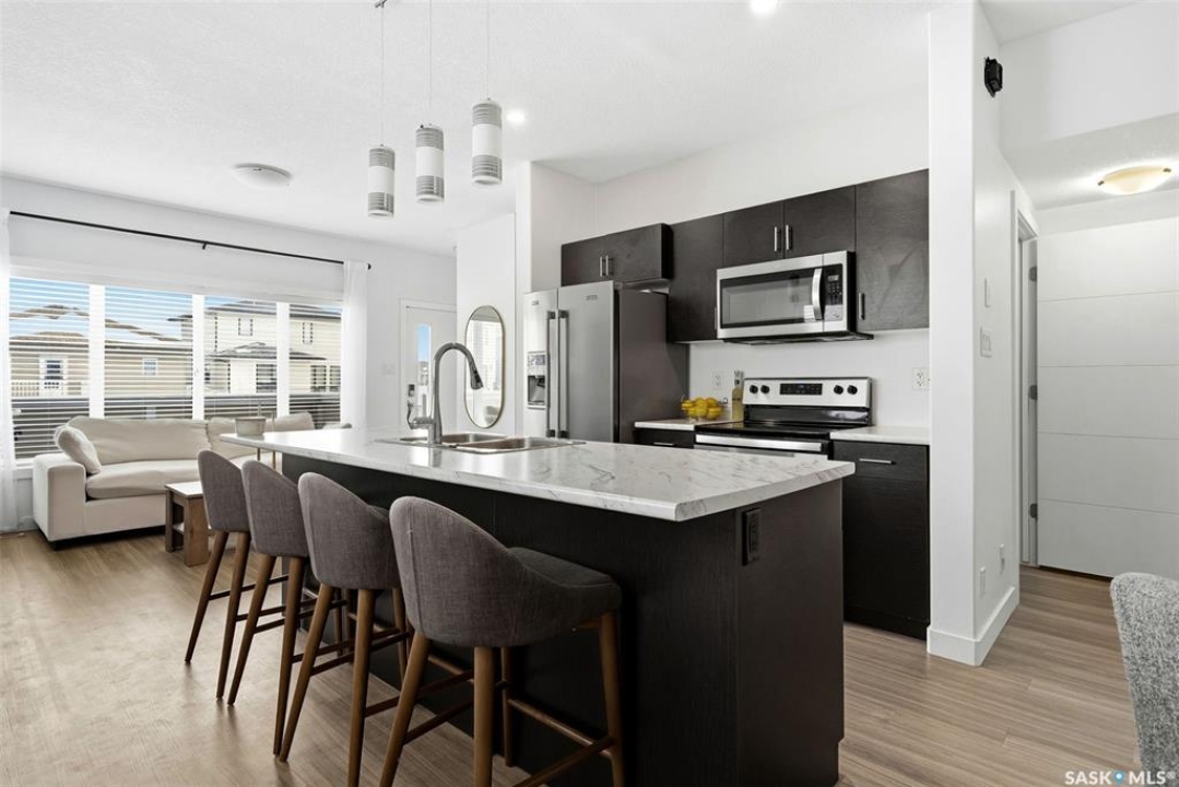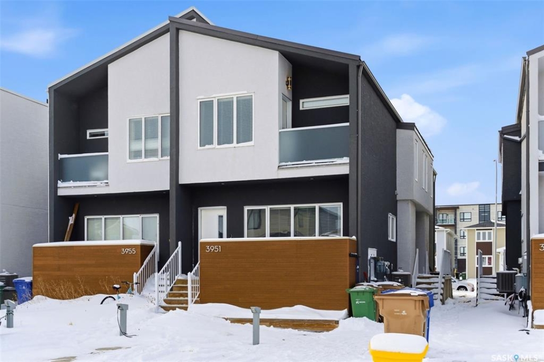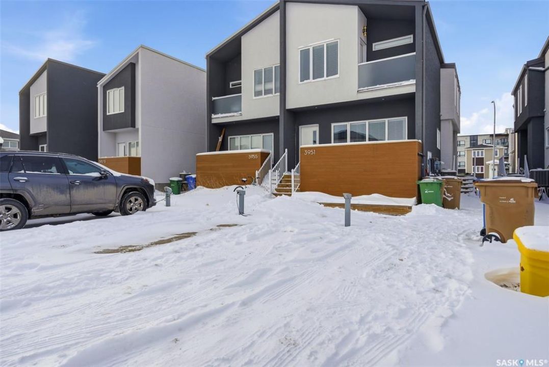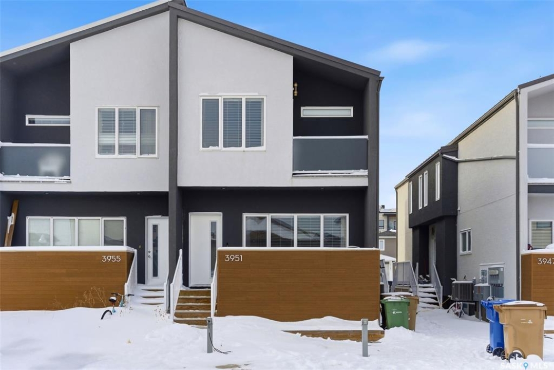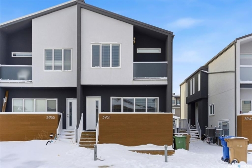 Welcome to 3951 James Hill Road, an exceptionally well-designed 1,072 sq. ft. townhouse condo that combines functionality, contemporary finishes, and low-maintenance condo living in Harbour Landing! The main floor features an open-concept layout filled with natural light from large picture and side windows. The kitchen is both stylish and practical, showcasing dark cabinetry, light countertops, soft-close drawers, and stainless steel appliances and a large sit up island. A spacious dining area seamlessly connects the kitchen and living space, making it ideal for everyday living and entertaining. A convenient two-piece bathroom completes the main level. Upstairs, the primary bedroom offers its own balcony, a walk-in closet, and a four-piece ensuite. A second spacious bedroom, an additional four-piece bathroom, and top-floor laundry complete the top floor and is a convenient layout for first time home buyers or young families! The basement is recently fully finished with new vinyl plank flooring and consists of a cozy recreation room with projector and screen, a nook area for your office desk or reading spot, as well as a brand new 3 piece bathroom. Also included is one parking pad spot, an outdoor deck for BBQing, and quick access to all the great amenities Harbour Landing offers! Book your showing on this immaculate, updated condo today!
