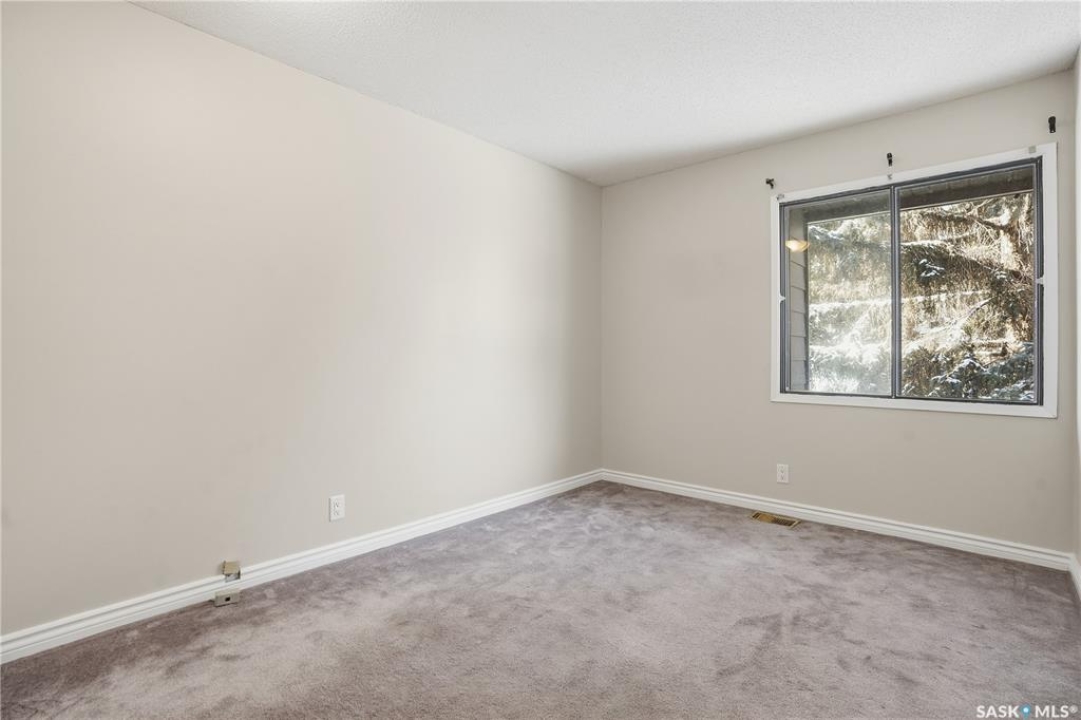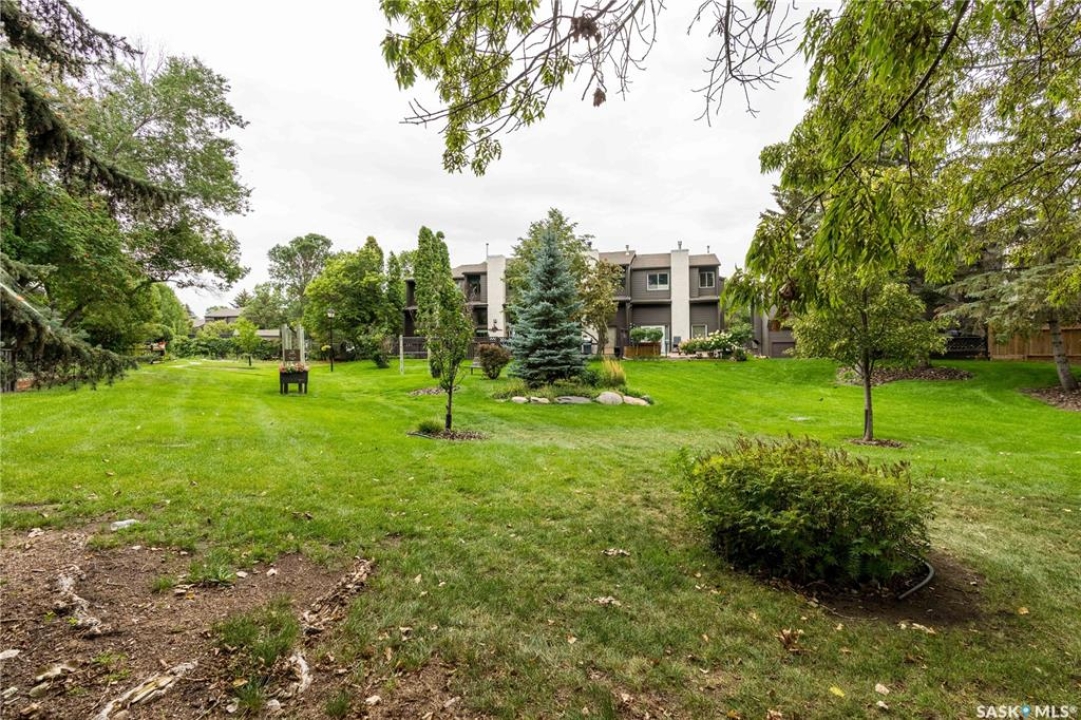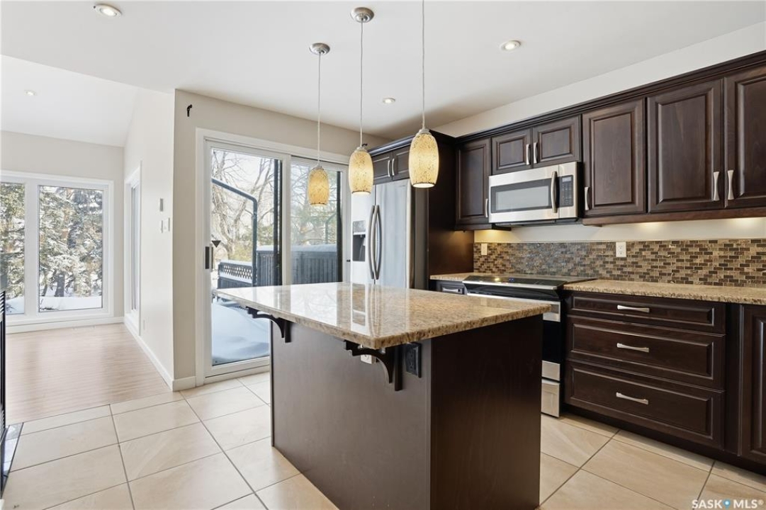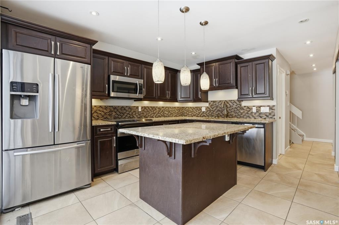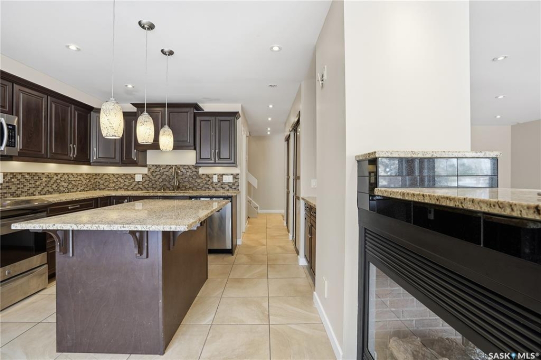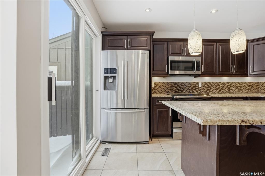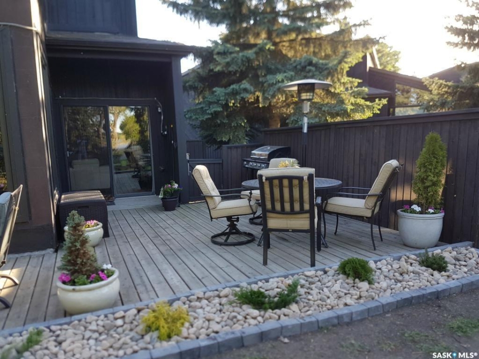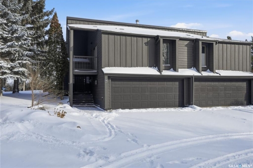 Welcome to 19 Martin Crescent. Rare opportunity to own an over 2,000 sq ft semi detached split level condo on a quiet crescent and backing directly onto park space with views toward Wascana Parkway and Wascana Lake. Enjoy privacy with no rear neighbours, while being within walking distance to the University of Regina and just a five minute drive to downtown, restaurants, and public transit. The main floor features a large foyer with French doors leading into a bright, open living space with 9 foot ceilings, large windows, and a three way natural gas fireplace. Patio doors open to a spacious deck and patio area with natural gas BBQ hookup. The dining area offers vaulted ceilings and heated floors, flowing into the kitchen complete with dark chocolate cabinetry, soft close drawers and doors, granite countertops, a large centre island, extra pantry and storage, phone nook, and heated flooring. Sliding doors off the kitchen lead to a second patio. A two piece bathroom and direct access to the rare heated double attached garage complete this level. The second level is dedicated to the primary retreat, featuring heated floors, a private deck, semi walk in closet with mirrored doors, and a spa like ensuite with heated floors, double glass shower, jet and soaker tub, and marble topped vanity with his and her sinks. The third level offers a cozy den, three additional good sized bedrooms, a full bathroom, and conveniently located laundry. The fully carpeted basement provides a large recreation area and an oversized storage room with extensive built in shelving. Freshly painted throughout with recently updated exterior siding. Additional features include central vacuum, included appliances, garage door opener with remotes, and access to condo amenities including a swimming pool, tennis court, and visitor parking. Condo fees are $687.67 per month and include exterior and common maintenance, water, sewer, snow removal, lawn care, reserve fund, and insurance.