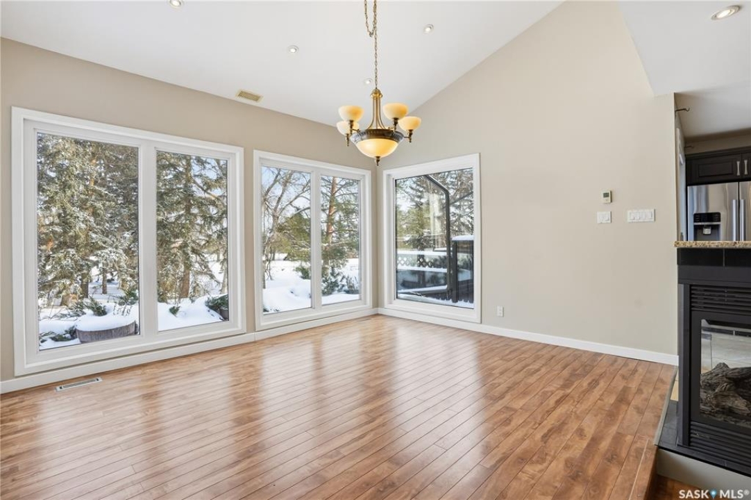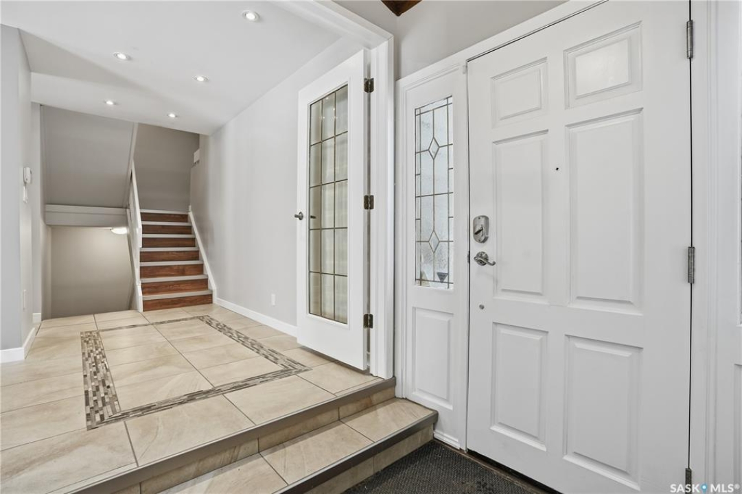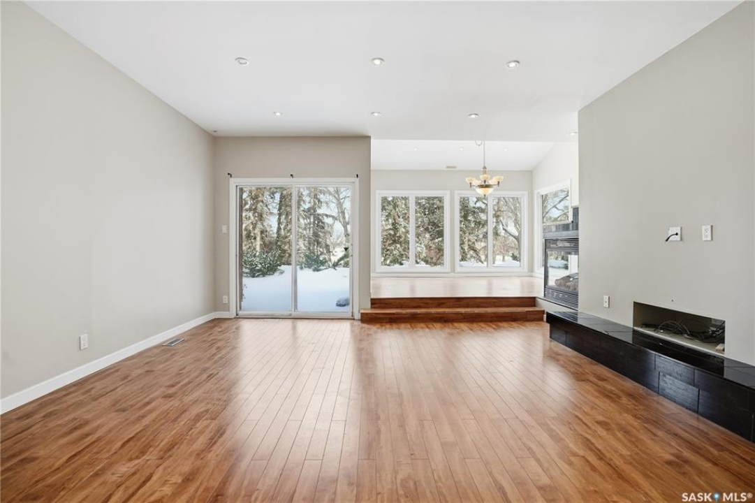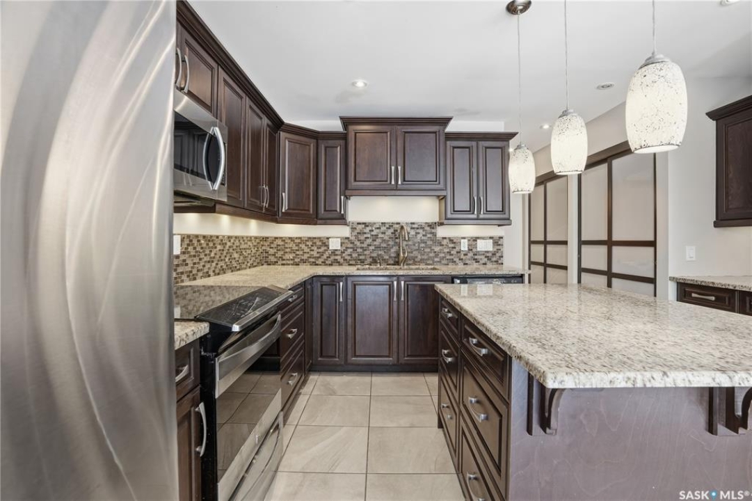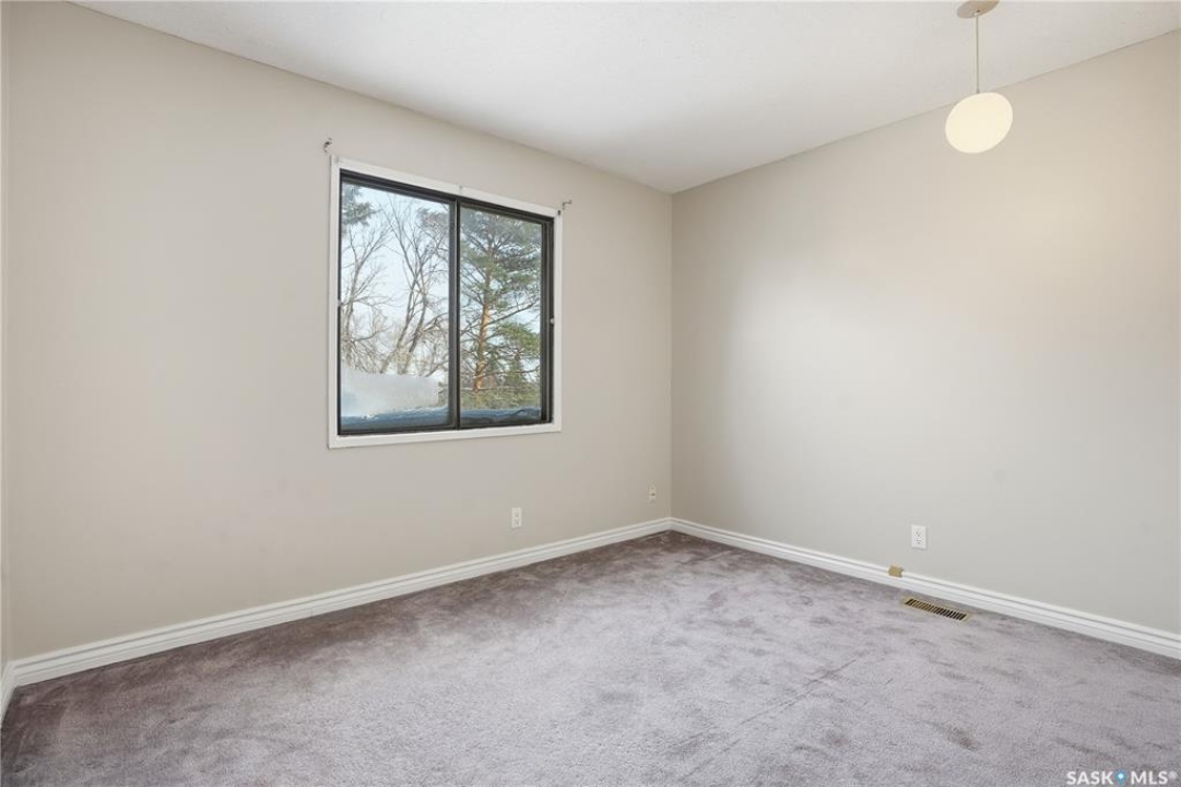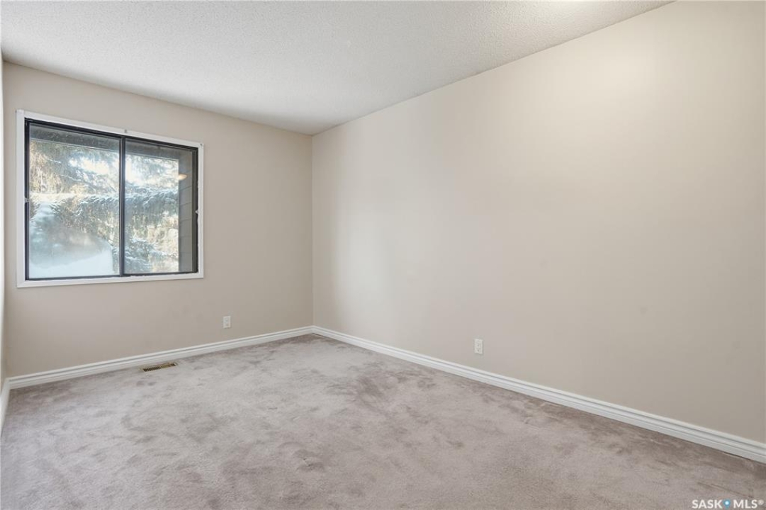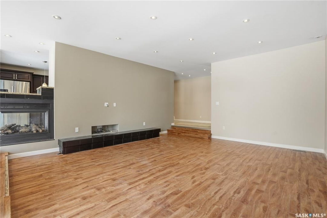 Welcome to 19 Martin Crescent. Rare opportunity to own an over 2,000 sq ft semi detached split level condo on a quiet crescent and backing directly onto park space with views toward Wascana Parkway and Wascana Lake. Enjoy privacy with no rear neighbours, while being within walking distance to the University of Regina and just a five minute drive to downtown, restaurants, and public transit. The main floor features a large foyer with French doors leading into a bright, open living space with 9 foot ceilings, large windows, and a three way natural gas fireplace. Patio doors open to a spacious deck and patio area with natural gas BBQ hookup. The dining area offers vaulted ceilings and heated floors, flowing into the kitchen complete with dark chocolate cabinetry, soft close drawers and doors, granite countertops, a large centre island, extra pantry and storage, phone nook, and heated flooring. Sliding doors off the kitchen lead to a second patio. A two piece bathroom and direct access to the rare heated double attached garage complete this level. The second level is dedicated to the primary retreat, featuring heated floors, a private deck, semi walk in closet with mirrored doors, and a spa like ensuite with heated floors, double glass shower, jet and soaker tub, and marble topped vanity with his and her sinks. The third level offers a cozy den, three additional good sized bedrooms, a full bathroom, and conveniently located laundry. The fully carpeted basement provides a large recreation area and an oversized storage room with extensive built in shelving. Freshly painted throughout with recently updated exterior siding. Additional features include central vacuum, included appliances, garage door opener with remotes, and access to condo amenities including a swimming pool, tennis court, and visitor parking. Condo fees are $687.67 per month and include exterior and common maintenance, water, sewer, snow removal, lawn care, reserve fund, and insurance.