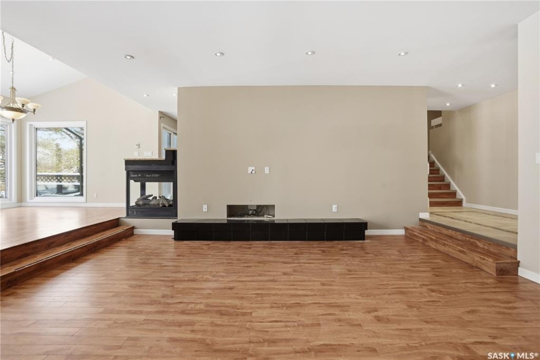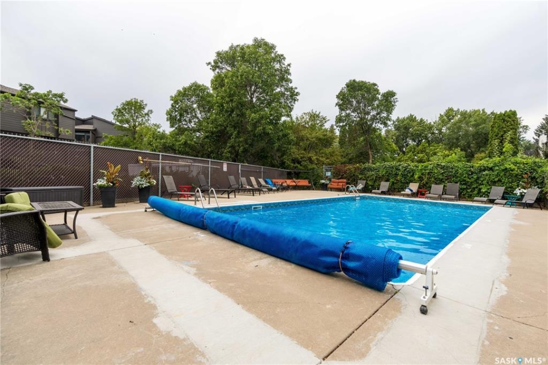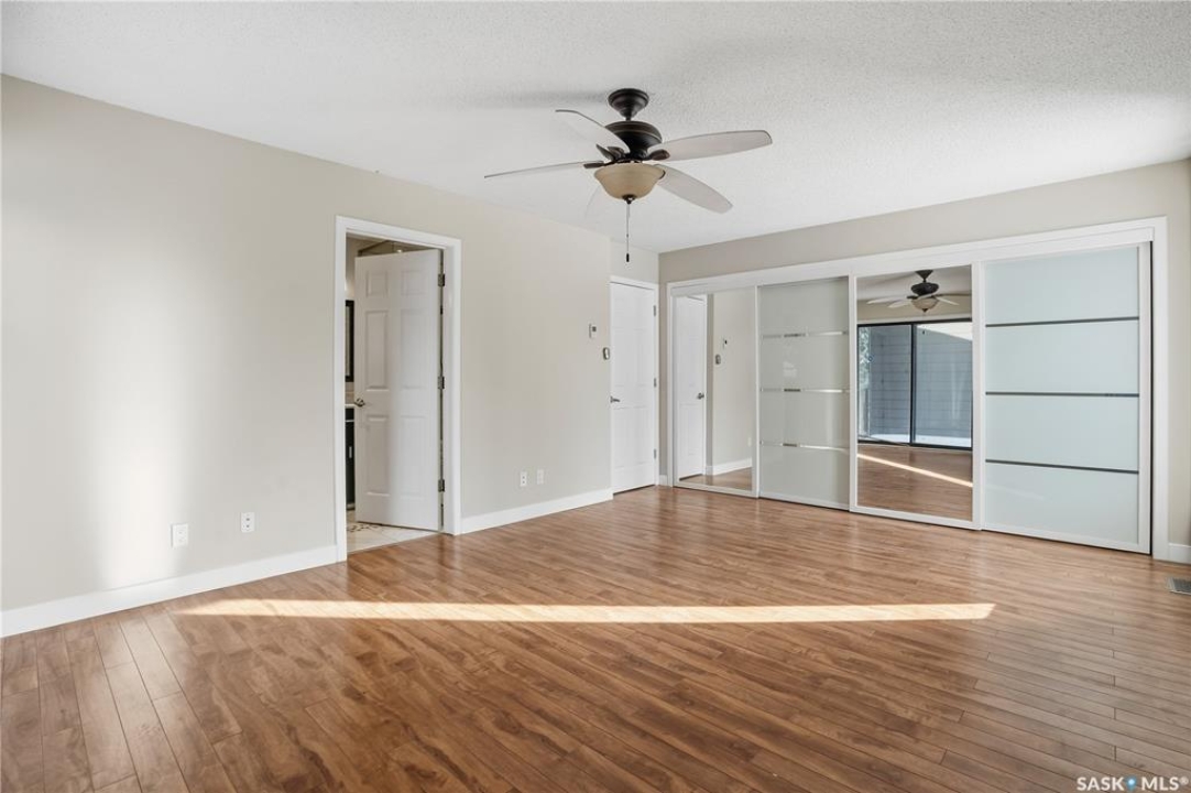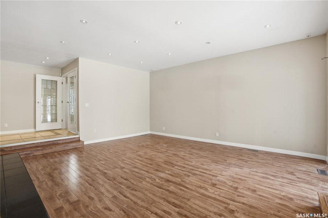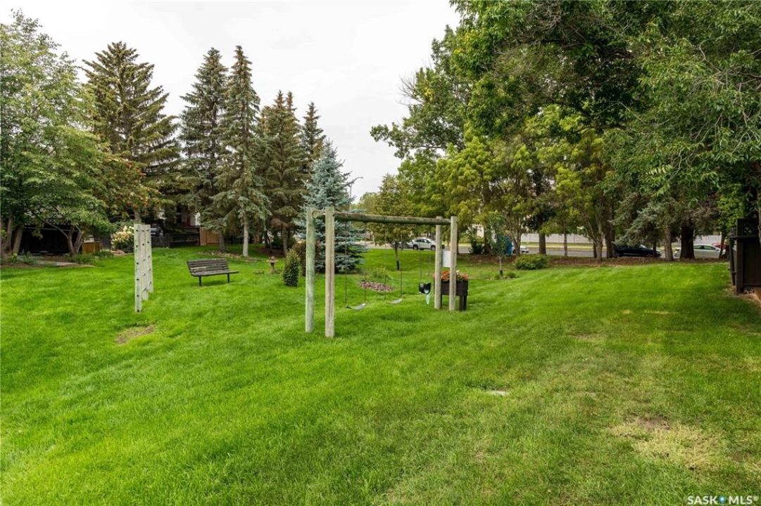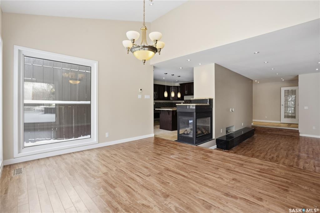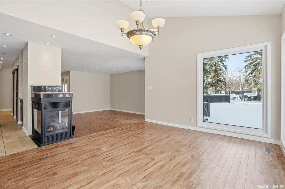 Welcome to 19 Martin Crescent. Rare opportunity to own an over 2,000 sq ft semi detached split level condo on a quiet crescent and backing directly onto park space with views toward Wascana Parkway and Wascana Lake. Enjoy privacy with no rear neighbours, while being within walking distance to the University of Regina and just a five minute drive to downtown, restaurants, and public transit. The main floor features a large foyer with French doors leading into a bright, open living space with 9 foot ceilings, large windows, and a three way natural gas fireplace. Patio doors open to a spacious deck and patio area with natural gas BBQ hookup. The dining area offers vaulted ceilings and heated floors, flowing into the kitchen complete with dark chocolate cabinetry, soft close drawers and doors, granite countertops, a large centre island, extra pantry and storage, phone nook, and heated flooring. Sliding doors off the kitchen lead to a second patio. A two piece bathroom and direct access to the rare heated double attached garage complete this level. The second level is dedicated to the primary retreat, featuring heated floors, a private deck, semi walk in closet with mirrored doors, and a spa like ensuite with heated floors, double glass shower, jet and soaker tub, and marble topped vanity with his and her sinks. The third level offers a cozy den, three additional good sized bedrooms, a full bathroom, and conveniently located laundry. The fully carpeted basement provides a large recreation area and an oversized storage room with extensive built in shelving. Freshly painted throughout with recently updated exterior siding. Additional features include central vacuum, included appliances, garage door opener with remotes, and access to condo amenities including a swimming pool, tennis court, and visitor parking. Condo fees are $687.67 per month and include exterior and common maintenance, water, sewer, snow removal, lawn care, reserve fund, and insurance.