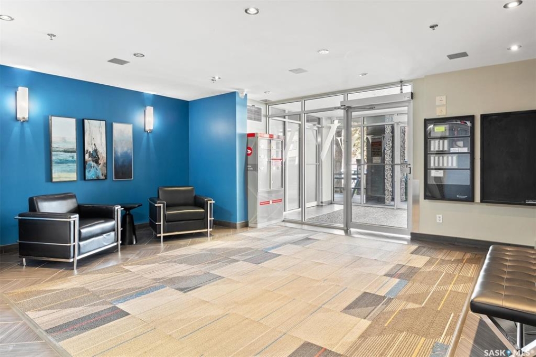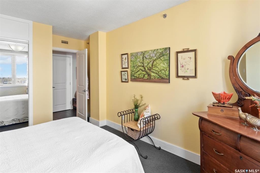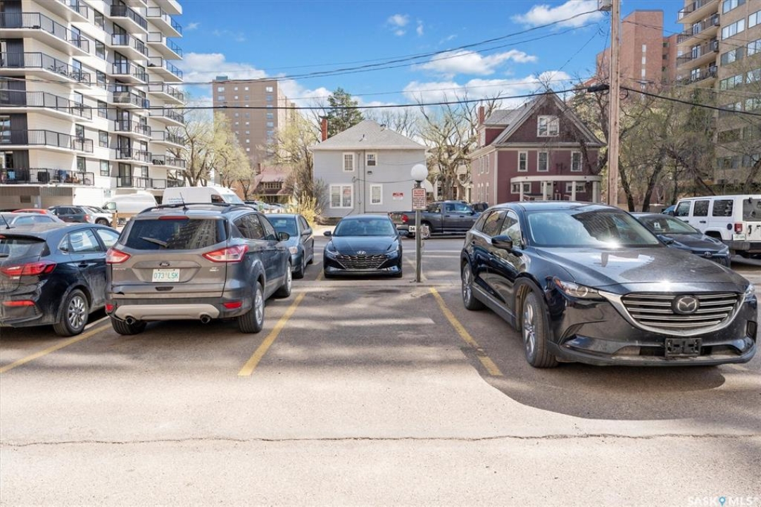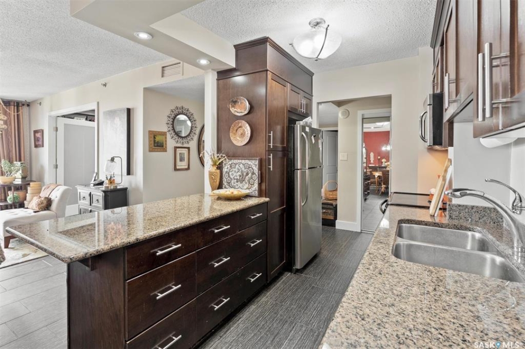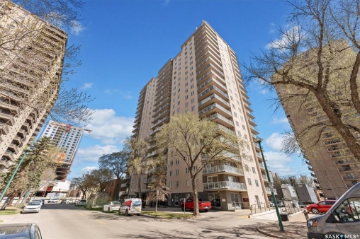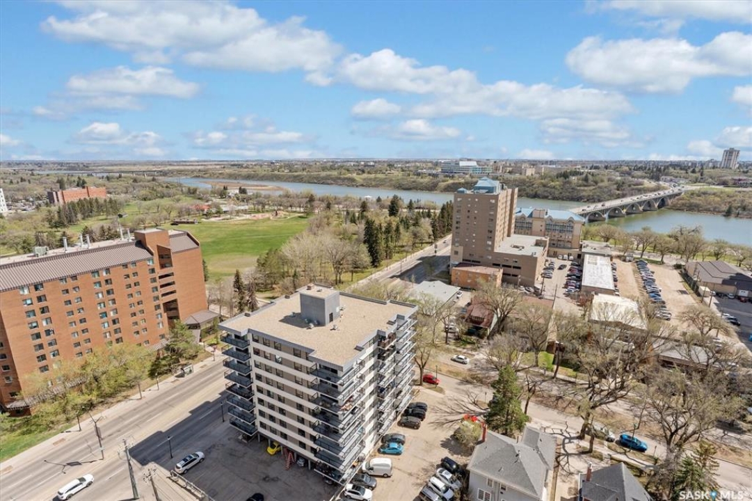 Fantastic 2 bedroom condo in the heart of downtown Saskatoon. Enjoy some of the city's nicest sunsets from this west facing suite. Quiet concrete building, open floor plan, with high end finishes. Porcelain tile flooring, granite countertops, maple cabinets, stainless steel appliances, 4 piece bath with tiled backsplash, customized built in maple cabinetry and bookshelf, french doors to office space/bedroom, and more! Unit comes with central air, in-suite laundry & storage space with bonus shelving, balcony off the large living space, and an exclusive electrified surface parking stall. Condo fees include water, heat, & power! Building common areas include shared laundry on each floor, amenities room, gym area, east & west facing rooftop terraces. Walking distance to the University, River walking trails, Kinsmen Park, Shakespeare on the Saskatchewan, Hospitals, public transit, and all amenities!