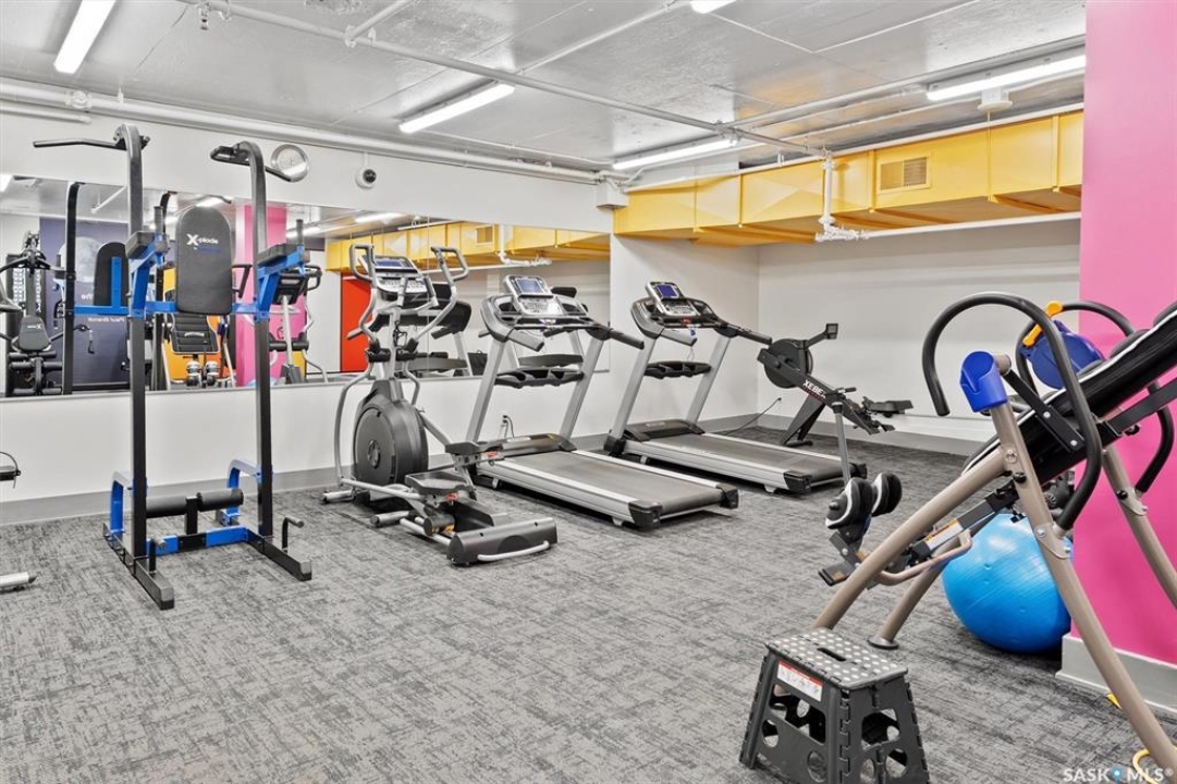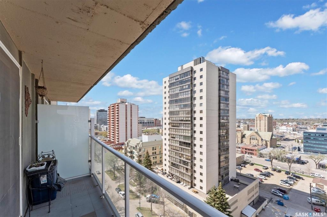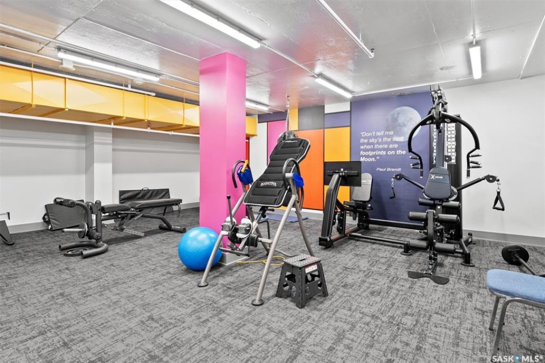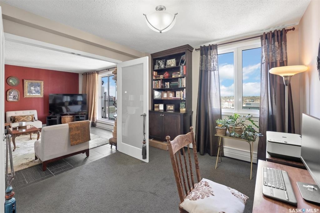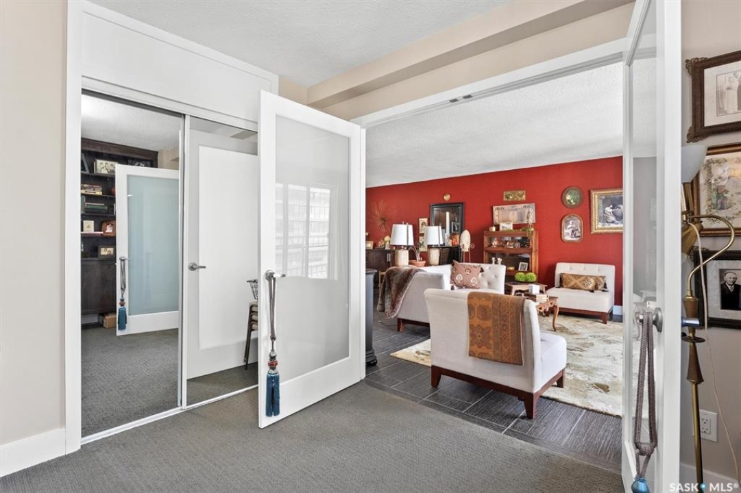 Fantastic 2 bedroom condo in the heart of downtown Saskatoon. Enjoy some of the city's nicest sunsets from this west facing suite. Quiet concrete building, open floor plan, with high end finishes. Porcelain tile flooring, granite countertops, maple cabinets, stainless steel appliances, 4 piece bath with tiled backsplash, customized built in maple cabinetry and bookshelf, french doors to office space/bedroom, and more! Unit comes with central air, in-suite laundry & storage space with bonus shelving, balcony off the large living space, and an exclusive electrified surface parking stall. Condo fees include water, heat, & power! Building common areas include shared laundry on each floor, amenities room, gym area, east & west facing rooftop terraces. Walking distance to the University, River walking trails, Kinsmen Park, Shakespeare on the Saskatchewan, Hospitals, public transit, and all amenities!