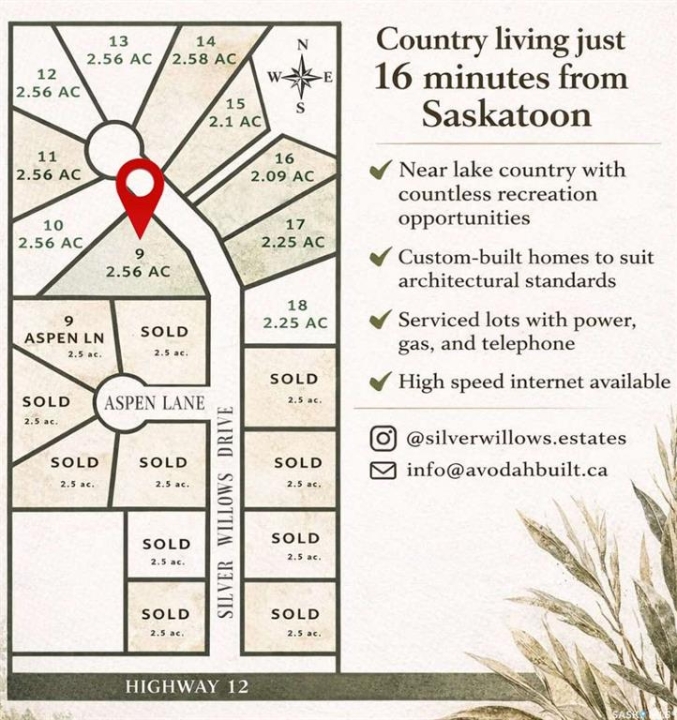 Looking for an acreage community with a short commute to the city? Welcome to Silver Willows Estates, a picturesque country living development just 16 minutes from Saskatoon, currently offering Phase 3, with Phase 1 complete and Phase 2 nearly completed, and architectural controls in place to ensure a beautiful, cohesive community. This community-style development features 7 fully serviced 2.5-acre lots with power, gas, and phone to the property, high-speed internet available, and many homeowners choosing to dig private wells. Build your dream home or choose a build-to-suit option, all within architectural standards that promote individuality while maintaining a stunning neighborhood feel. Enjoy open skies, bonfires, and true country living along a paved road, with lake country just north on pavement, city amenities minutes away, and K–12 schools nearby with smaller class sizes. Experience the best of both worlds. Acreage living for less than the cost of a new city lot, with space, privacy, and a strong sense of community just minutes from Saskatoon's downtown and northern work hub.