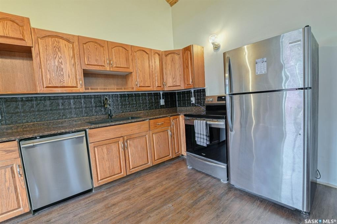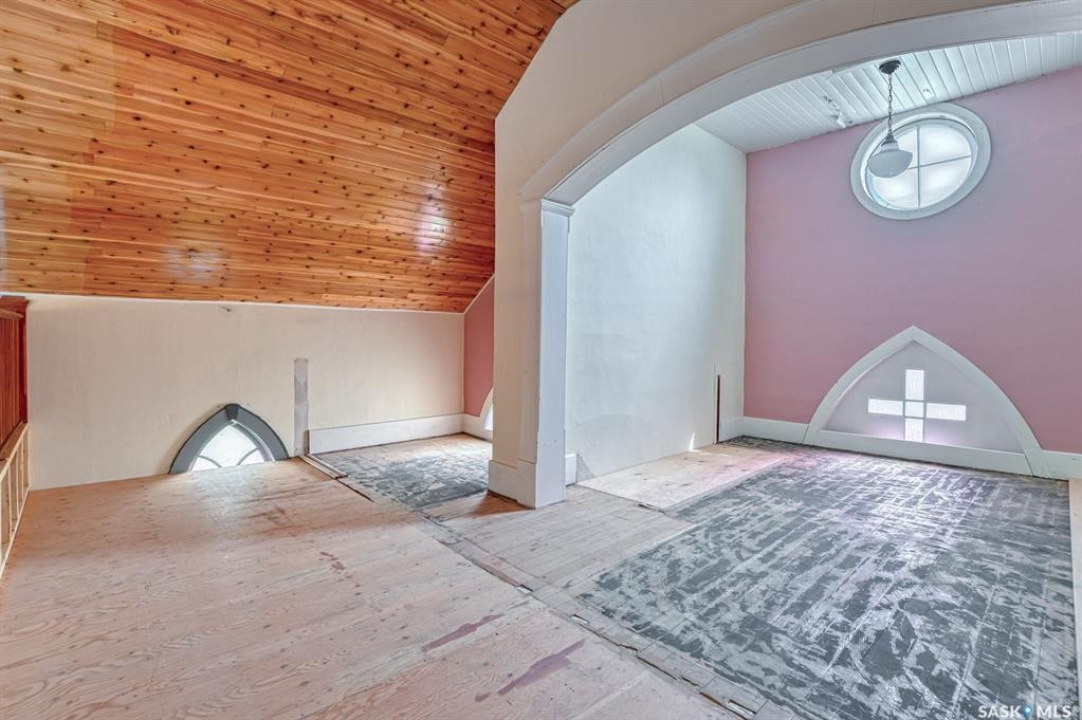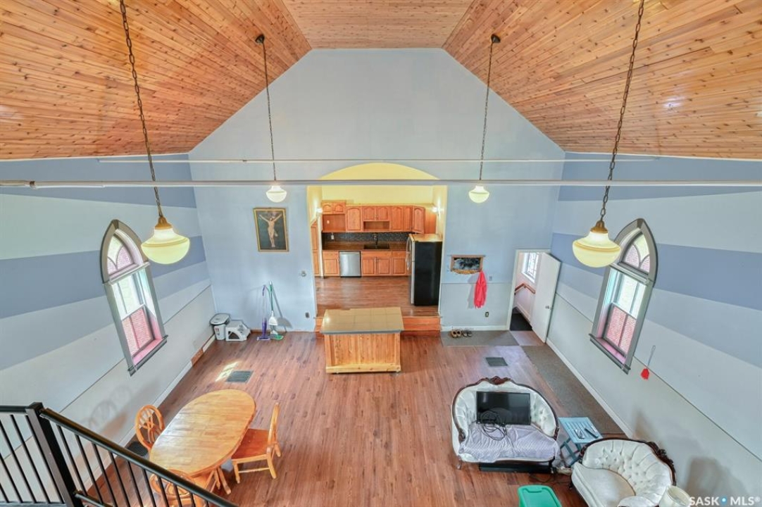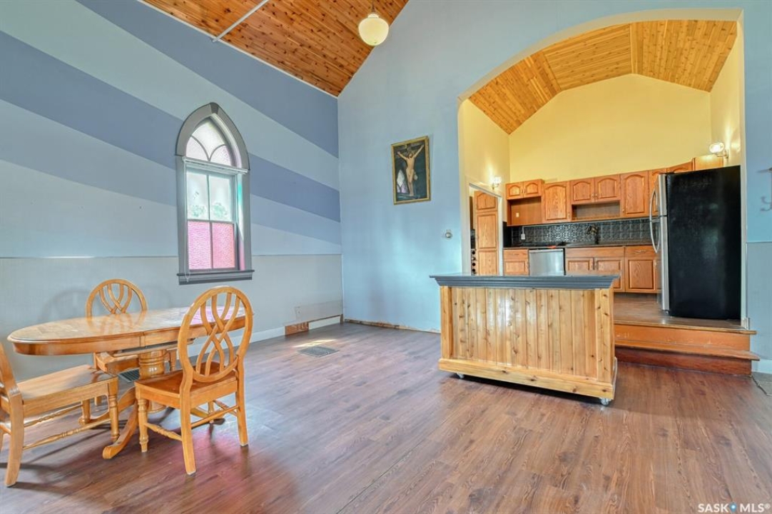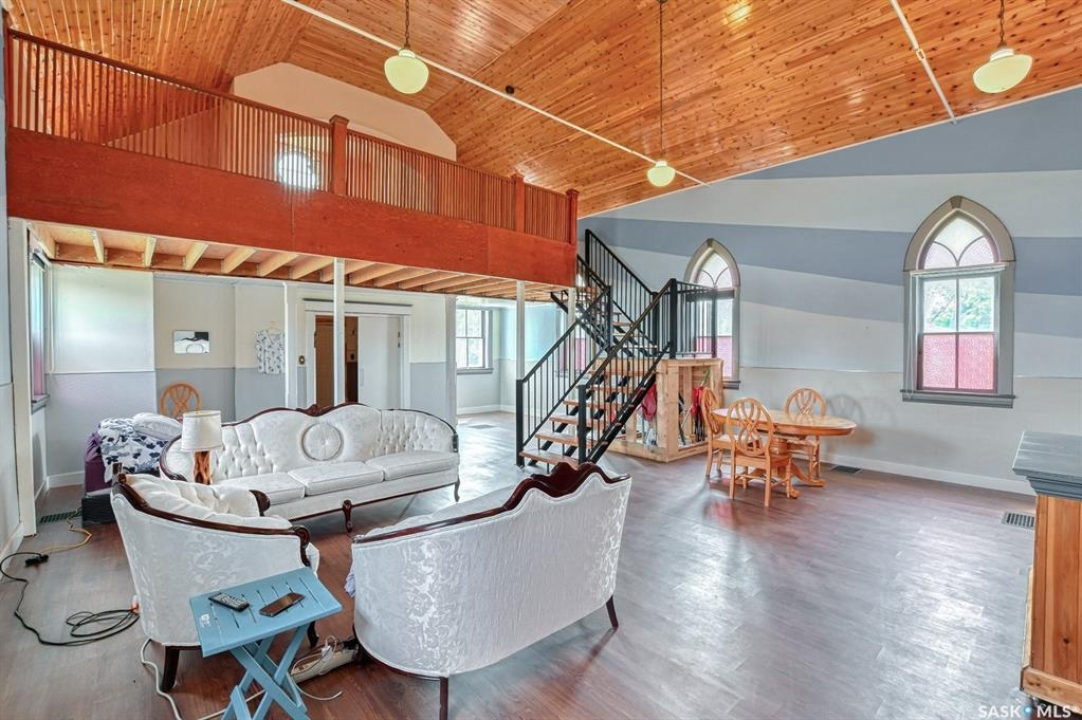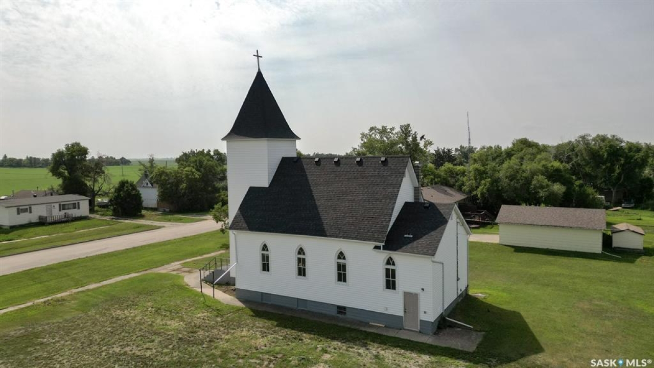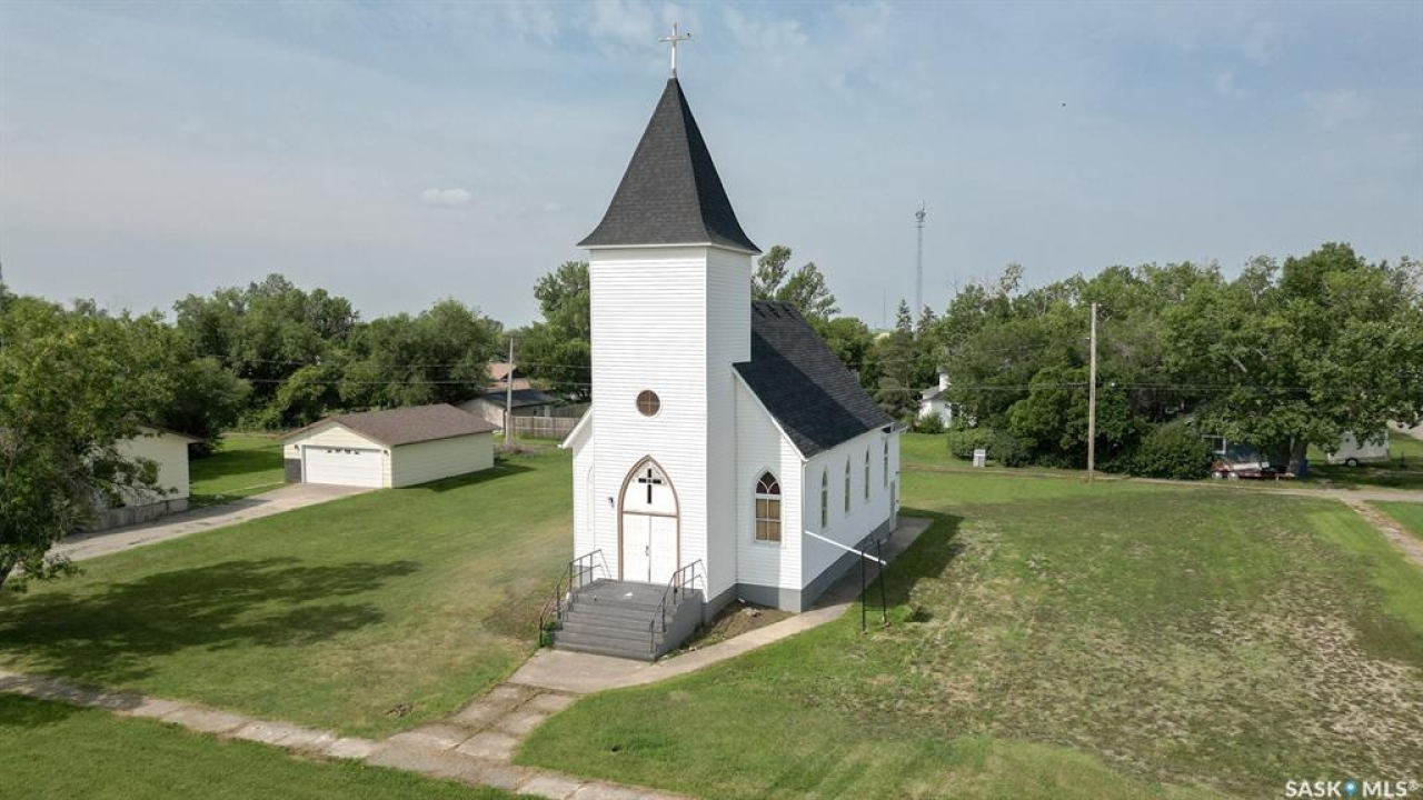 Discover a truly one-of-a-kind property in the peaceful community of Lang—just 40 minutes from Regina! Originally built in 1906, this former church has been thoughtfully converted into a warm and inviting 1,477 sq ft home that beautifully blends history with comfort. Step inside to find soaring vaulted ceilings, original stained glass windows, and timeless architectural details that add character to every corner. The main floor features a spacious oak kitchen, open-concept living and dining areas, and a cozy bedroom with a full bathroom. Upstairs, the loft offers space for a second bedroom, a roughed-in bathroom, and endless potential for a private retreat or studio space. Sitting on a massive lot of almost 1/2 acre, there's ample room for gardening, entertaining, or even expanding. Whether you're drawn to its unique charm or looking for something with space and history, this property is a rare opportunity. Don't miss your chance to own a piece of Saskatchewan history—schedule your private viewing today!