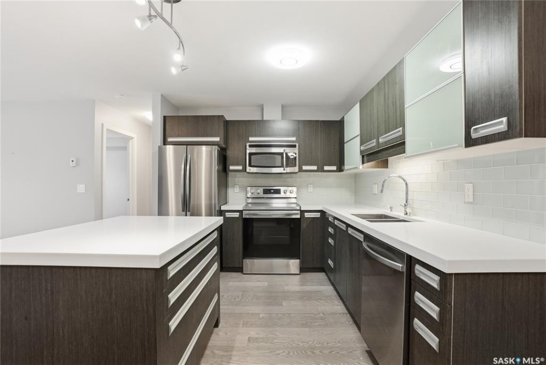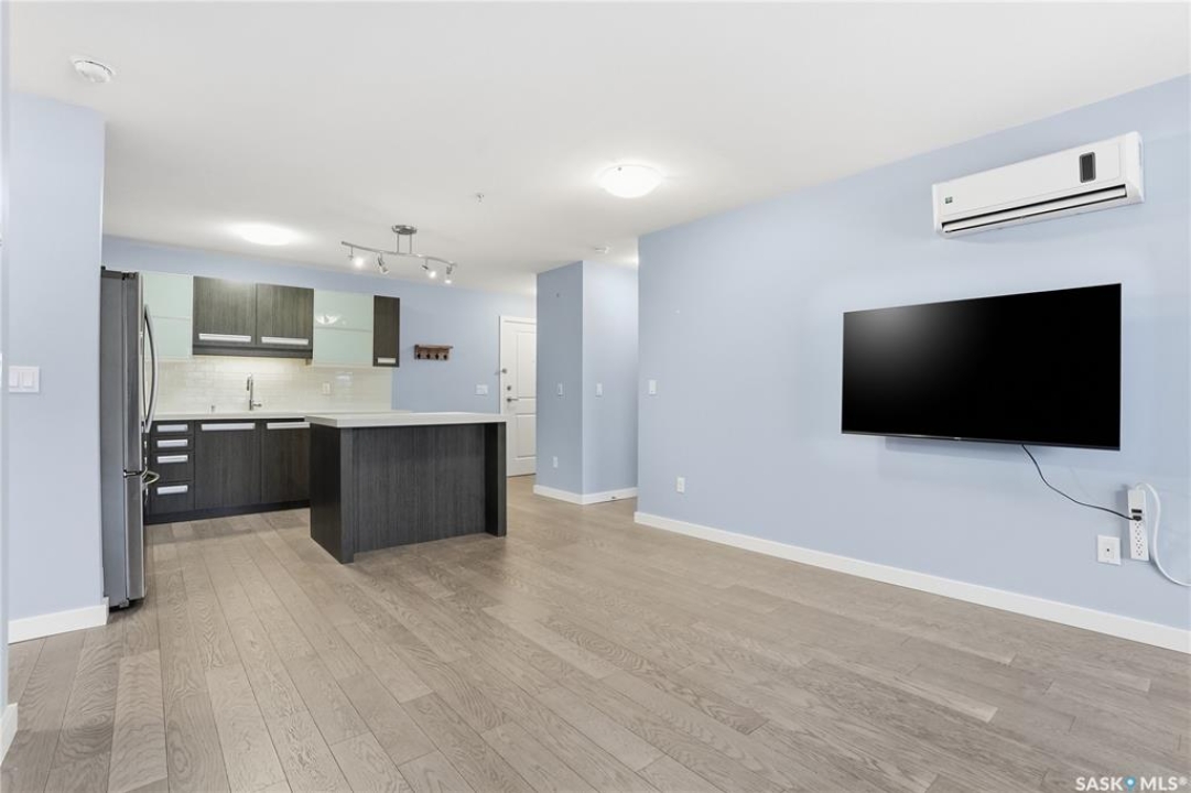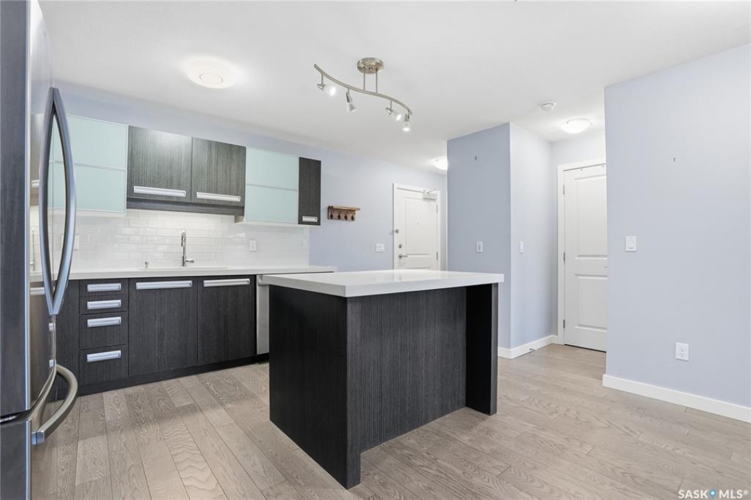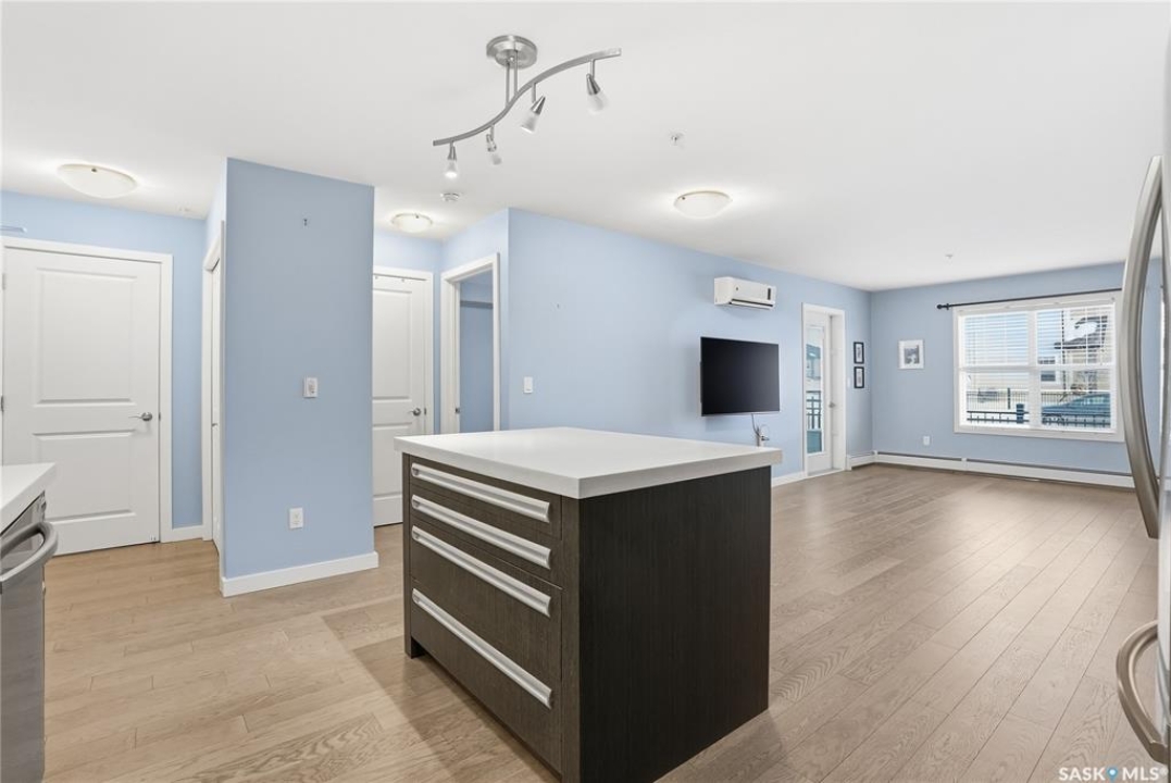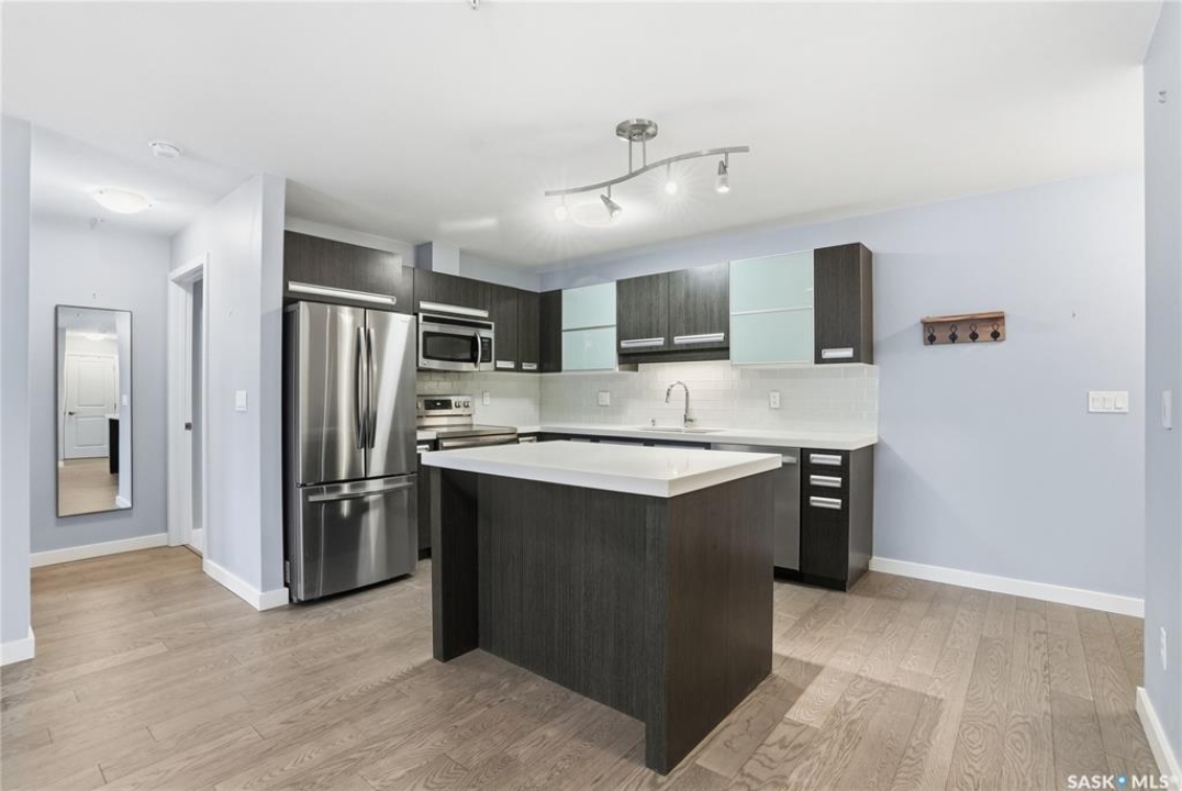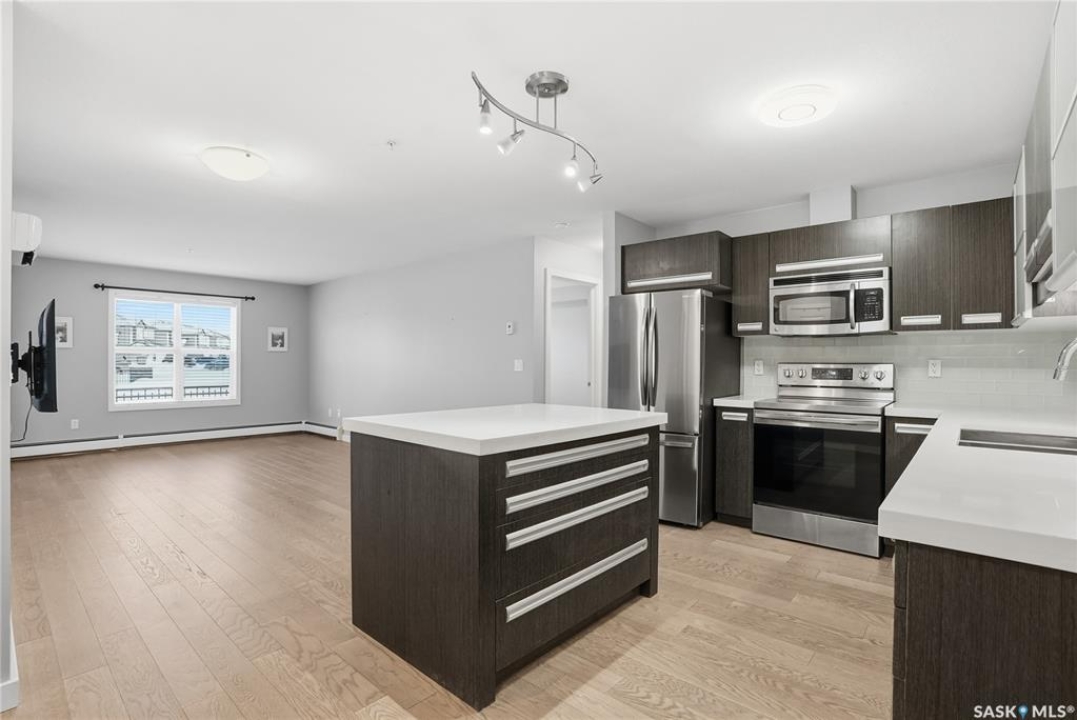 Welcome to this bright, east-facing 915 sq ft condo located in the highly sought-after Rosewood neighbourhood of Saskatoon. Perfectly positioned within walking distance to medical offices, Tim Hortons, and an excellent selection of shops and restaurants. The open-concept living area showcases brand new hardwood flooring and a kitchen featuring quartz countertops, a large island with pot drawers, stainless steel appliances, and glass tile backsplash. The thoughtful floor plan includes a spacious primary bedroom with a walk-in closet, a second bedroom with its own walk-in closet, and a convenient in-suite laundry/storage room with stacked washer and dryer. Additional features include air conditioning, a private balcony off the living room, and TWO electrified parking stalls. Stylish, modern, meticulously maintained and available for a quick possession! This move-in-ready condo is an outstanding opportunity in one of the city's most desirable communities!