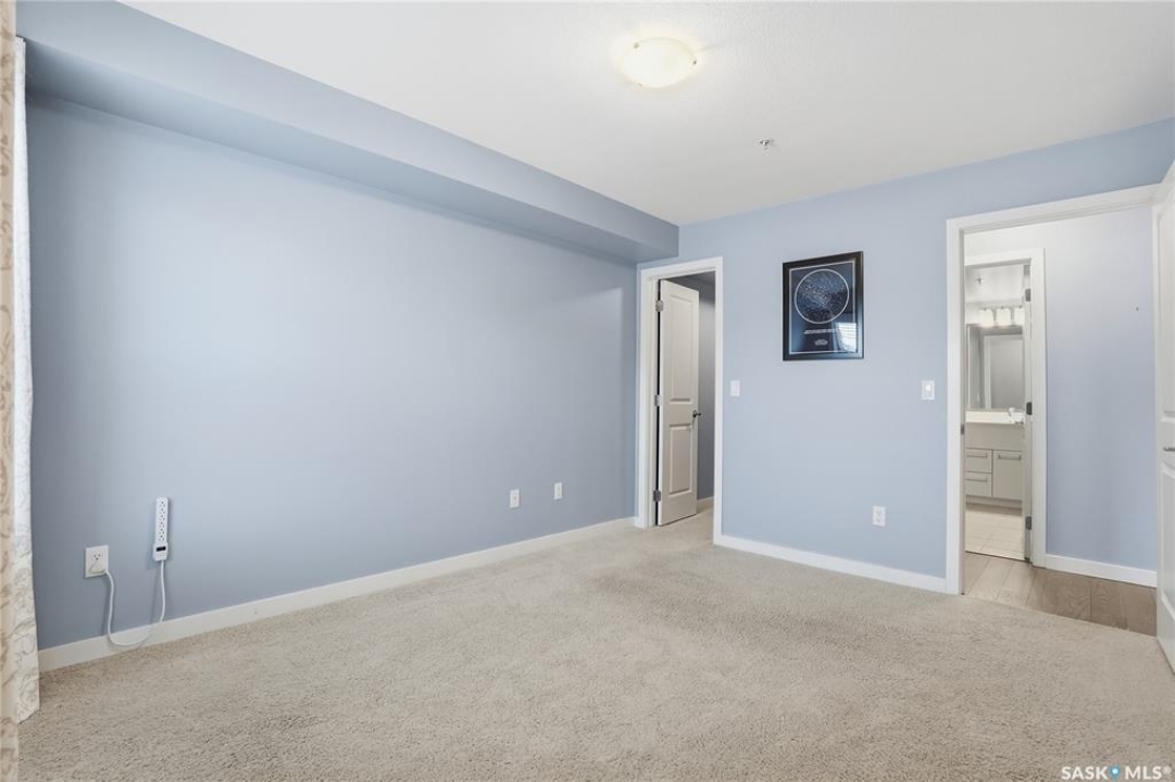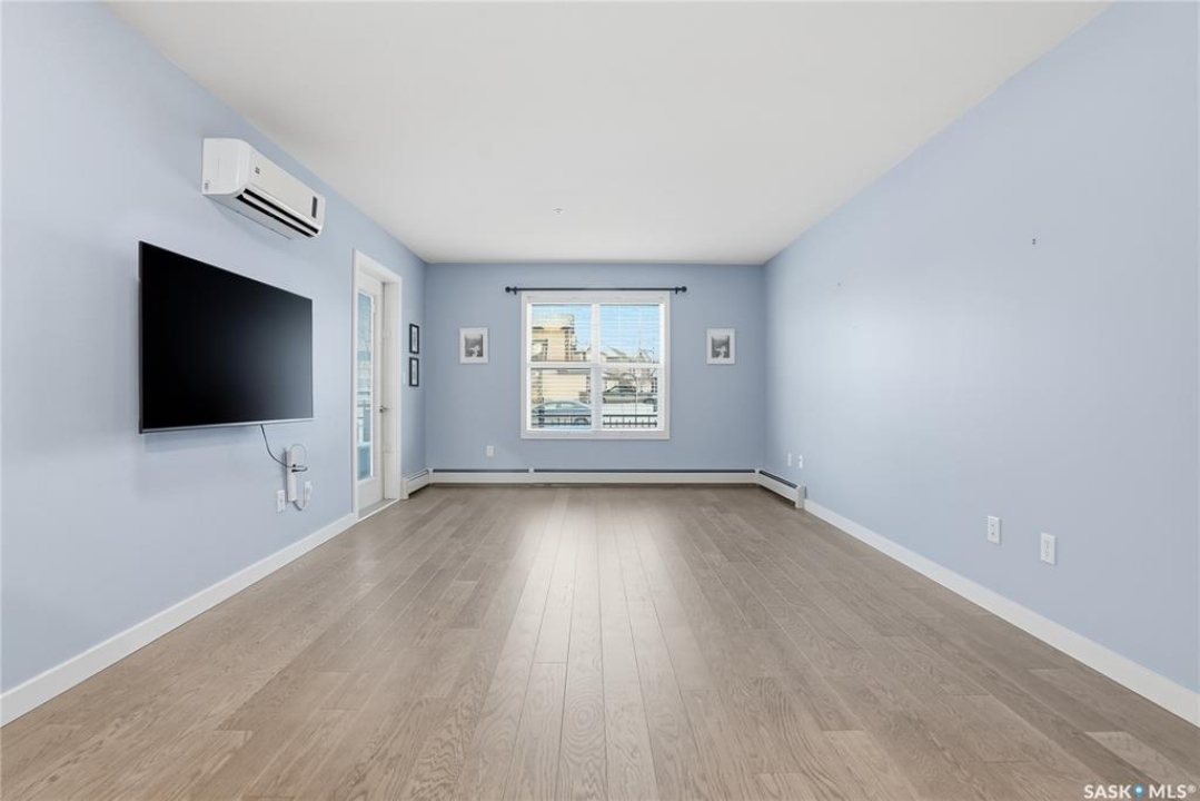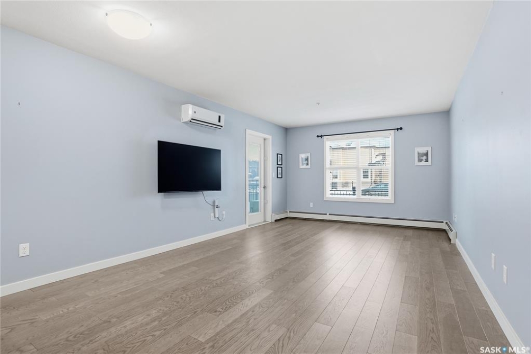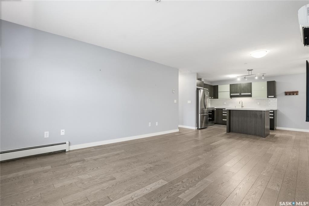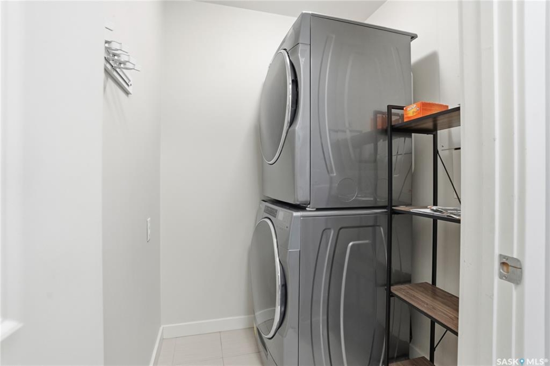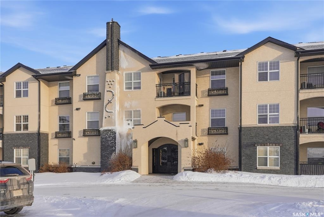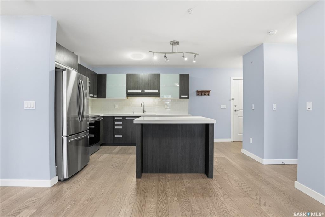 Welcome to this bright, east-facing 915 sq ft condo located in the highly sought-after Rosewood neighbourhood of Saskatoon. Perfectly positioned within walking distance to medical offices, Tim Hortons, and an excellent selection of shops and restaurants. The open-concept living area showcases brand new hardwood flooring and a kitchen featuring quartz countertops, a large island with pot drawers, stainless steel appliances, and glass tile backsplash. The thoughtful floor plan includes a spacious primary bedroom with a walk-in closet, a second bedroom with its own walk-in closet, and a convenient in-suite laundry/storage room with stacked washer and dryer. Additional features include air conditioning, a private balcony off the living room, and TWO electrified parking stalls. Stylish, modern, meticulously maintained and available for a quick possession! This move-in-ready condo is an outstanding opportunity in one of the city's most desirable communities!