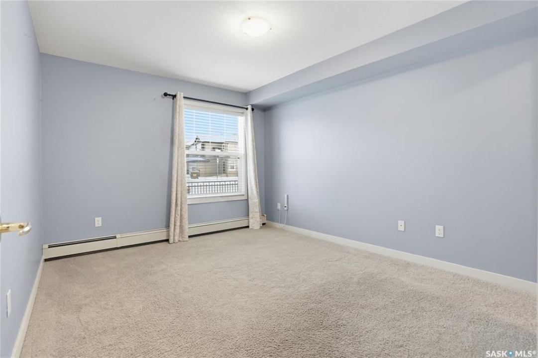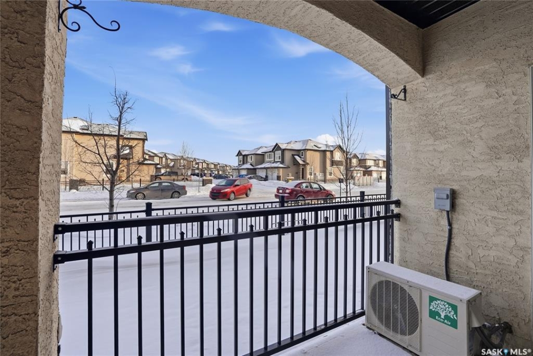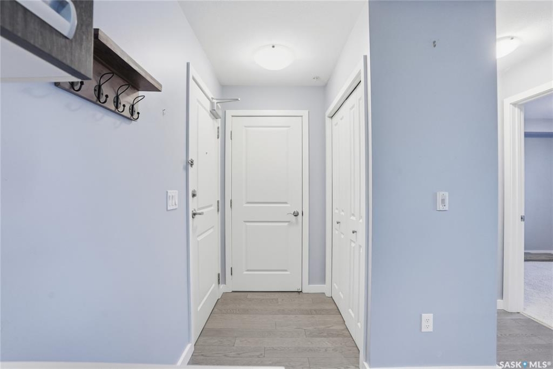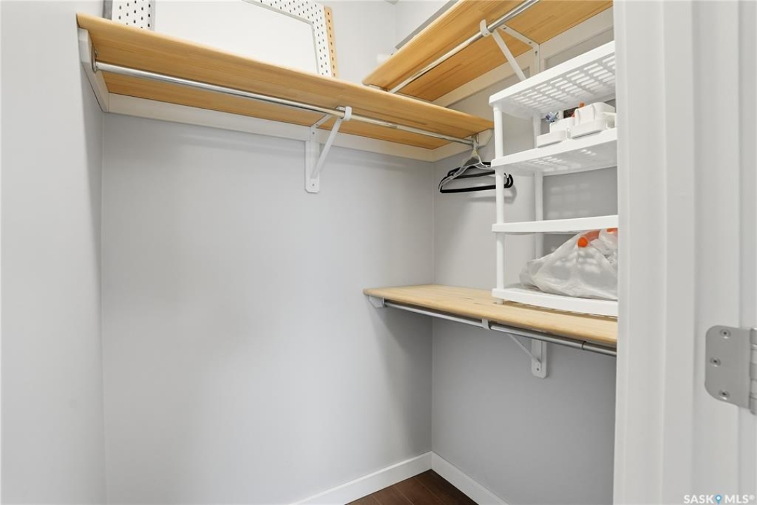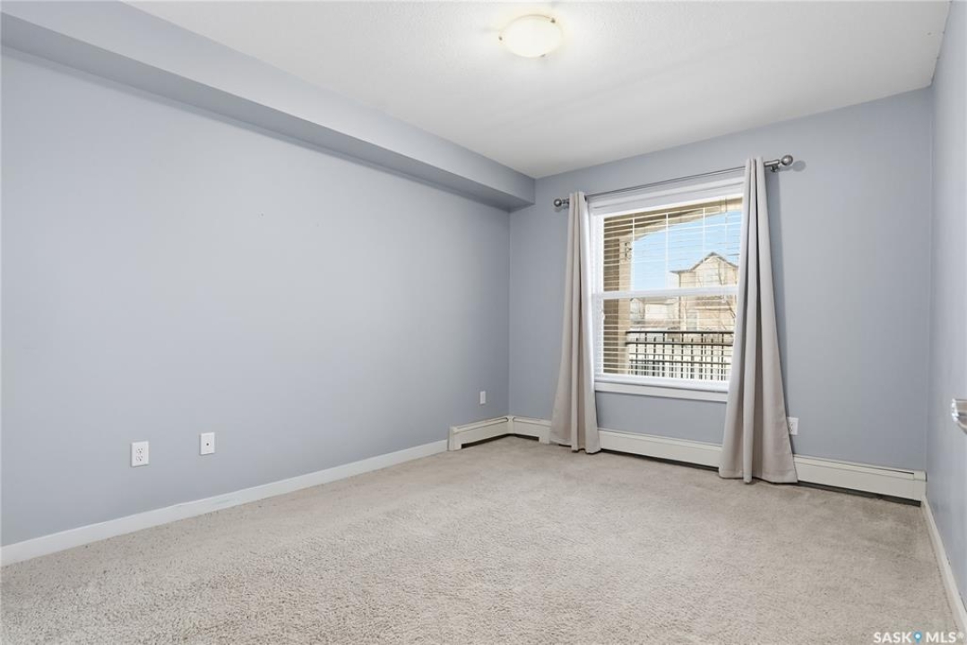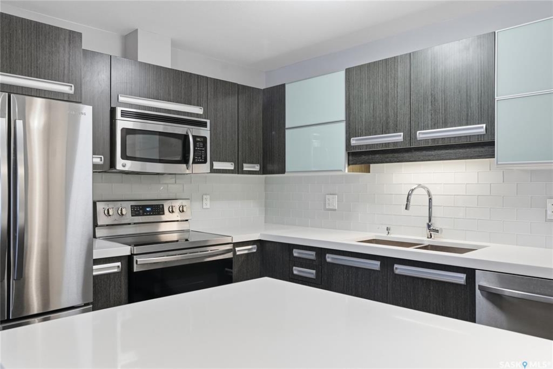 Welcome to this bright, east-facing 915 sq ft condo located in the highly sought-after Rosewood neighbourhood of Saskatoon. Perfectly positioned within walking distance to medical offices, Tim Hortons, and an excellent selection of shops and restaurants. The open-concept living area showcases brand new hardwood flooring and a kitchen featuring quartz countertops, a large island with pot drawers, stainless steel appliances, and glass tile backsplash. The thoughtful floor plan includes a spacious primary bedroom with a walk-in closet, a second bedroom with its own walk-in closet, and a convenient in-suite laundry/storage room with stacked washer and dryer. Additional features include air conditioning, a private balcony off the living room, and TWO electrified parking stalls. Stylish, modern, meticulously maintained and available for a quick possession! This move-in-ready condo is an outstanding opportunity in one of the city's most desirable communities!