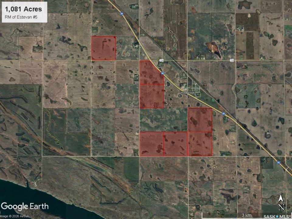 For Sale by Tender – 1,080.89 Acres of High-Quality Farmland in southern Saskatchewan located northwest of the city of Estevan near Hitchcock, SK in the RM of Estevan #5. The land features excellent access, including Highway #39 frontage, with the balance easily accessible just south of the highway. Farmed in three half sections and one single quarter all in close proximity. SAMA reports 1,006 cultivated acres* and a soil final rating weighted average of 51.24*. The soil type is predominantly Weyburn Loam with some Estevan Clay Loam. Sask Crop Insurance classifications include two “H” quarters, three “J” quarters, and two “K” quarters. The successful purchaser to begin farming the land in 2026. OFFER TENDERING PROCESS: Offers to purchase to be submitted/tendered in writing by 12:00PM on Thursday March 5, 2026 All offers to purchase will be presented at the same time to the Sellers for their consideration after 12:00PM on Thursday March 5, 2026. The Seller asks offers to be left open for five days. Offers to purchase will be considered on the entire parcel as well as parts thereof. This parcel could sell for above, at or below the asking price. Highest or any offer not necessarily accepted. ASKING PRICE BREAKDOWN: $4,100,000.00; $3,793.17/Titled Acre; $4,075/SAMA Cultivated Acre*; 2.13 X Assessed Value*. The Seller is in the process of removing a parcel tie from the NW 22-3-9 W2 Ext 1 as only the 127.16 acre parcel south of the highway is included in the sale, closing for this parcel will be after the parcel tie is removed. *SAMA Details are an approximation only as the NW 22-3-9 W2 assessment and cultivated acres have been approximated to remove the parcel north of the highway that is not included. Buyer to do their own due diligence. Property boundary outlines are an approximation.