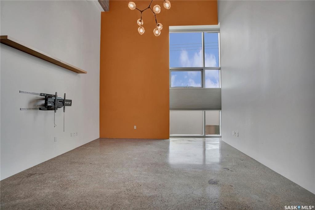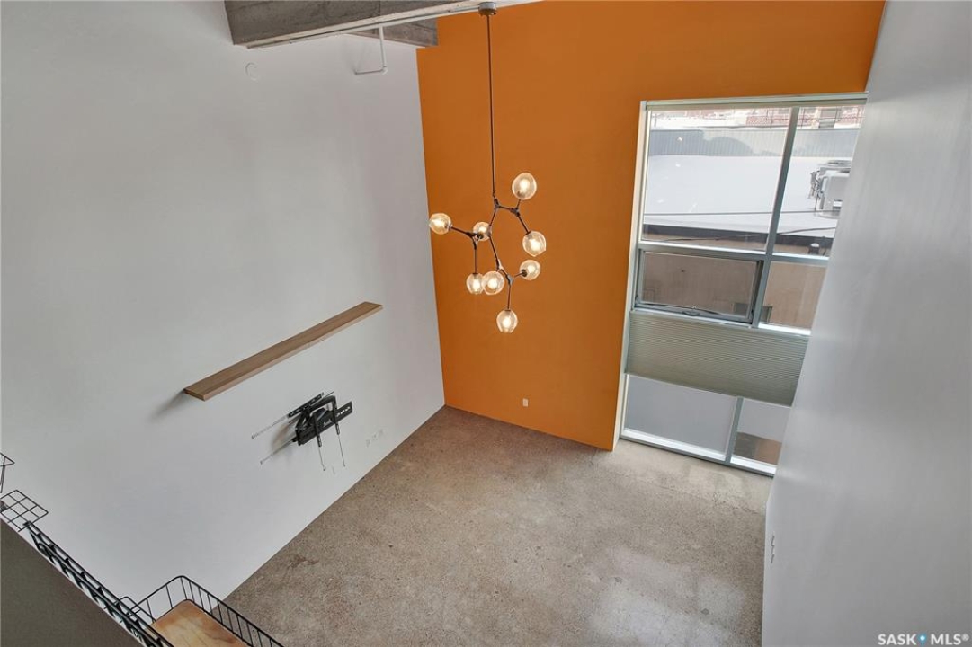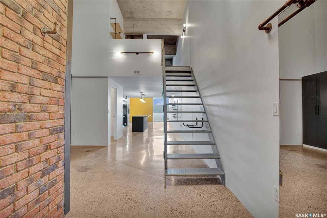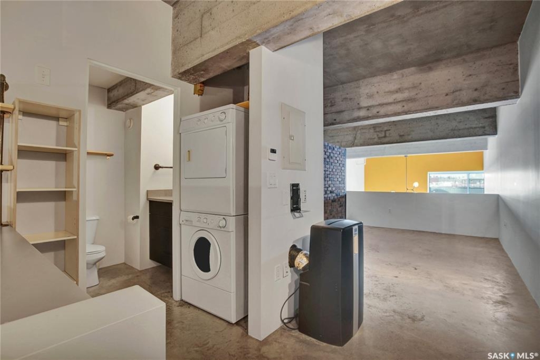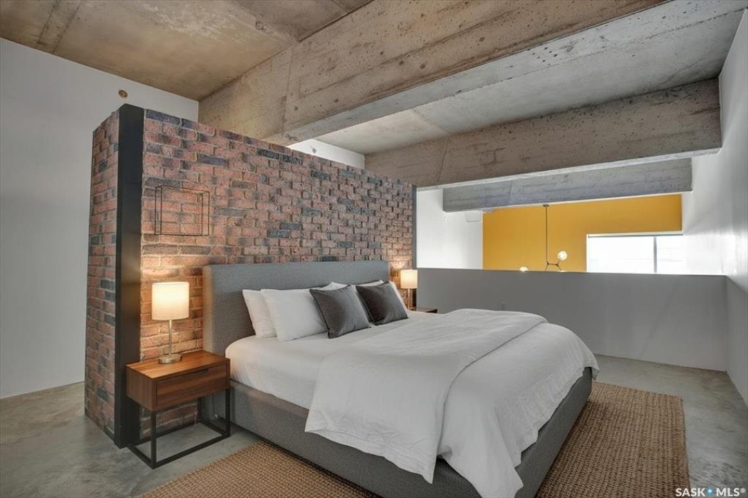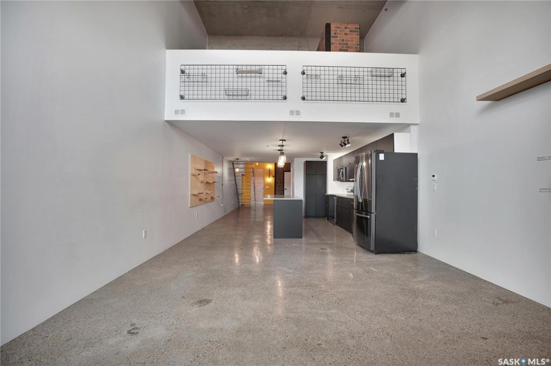 Welcome to #223–120 23rd Street East, located in the heart of downtown Saskatoon at the highly sought-after 2nd Avenue Lofts. This exceptional residence offers a truly distinctive urban living experience, blending industrial character with modern comfort. Polished concrete floors, exposed concrete beams, and an impressive 14-foot-tall by 9.5-foot-wide window create a striking sense of openness while flooding the space with natural light. The sleek matte-black kitchen is both stylish and functional, featuring an extensive bank of cabinetry, stainless steel appliances, and a substantial quartz island—ideal for both everyday living and entertaining. When you're not hosting at home, you'll appreciate being just steps from some of Saskatoon's best restaurants, cafés, Remai Modern Art Gallery, The Persephone Theatre and The Meewasin Valley River Trails. The spacious entry area provides an ideal work-from-home setup, while an additional constructed bedroom offers flexibility as a guest room, private office, or treatment space, complete with a conveniently located powder room. Upstairs, the generous primary bedroom overlooks the main living area, enhancing the loft-style ambiance. The four-piece bathroom has been tastefully renovated, and the unit includes all appliances as well as in-suite laundry for everyday convenience. One parking stall is included in the secure, heated underground parkade, which also provides dedicated bike storage. Condo fees include heat, water, and electricity. Residents enjoy an impressive array of amenities, including four dedicated rooms for fitness, cardio, ping pong, and a library or meeting space, along with an on-site building manager and 24-hour video security throughout common areas and exterior spaces. The rooftop patio, accessible from the third floor, is an ideal setting to barbecue, relax, and enjoy city views. Pets are permitted for owner-occupants with board approval, making this an exciting opportunity for downtown living.