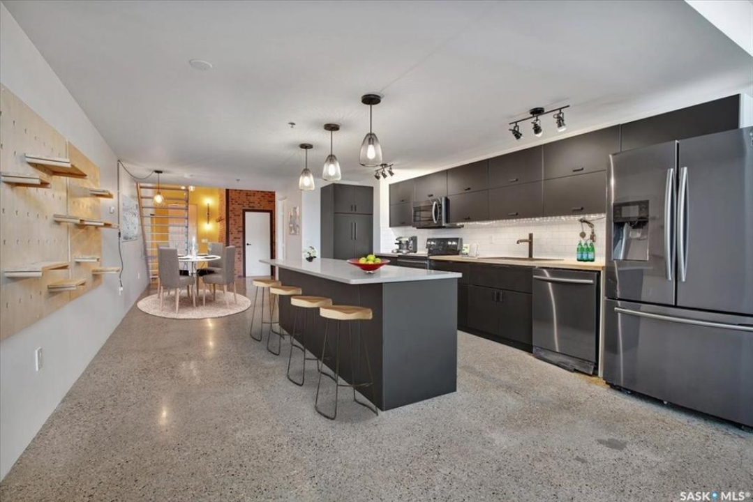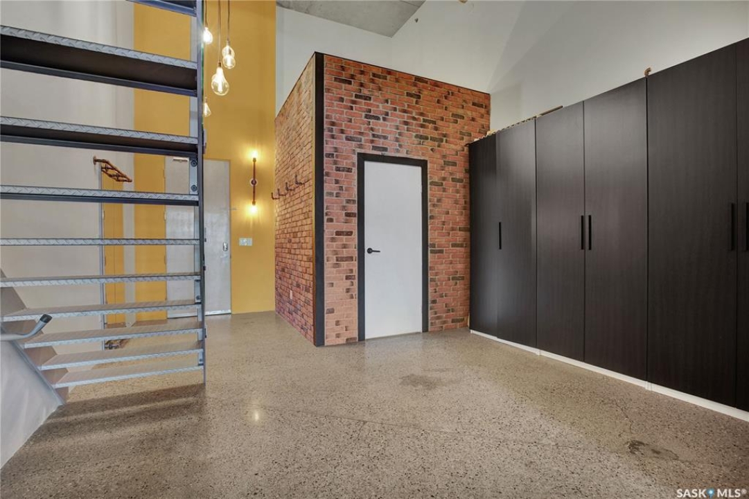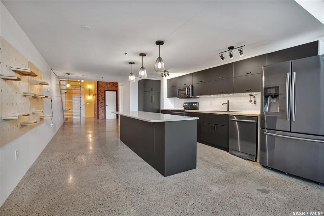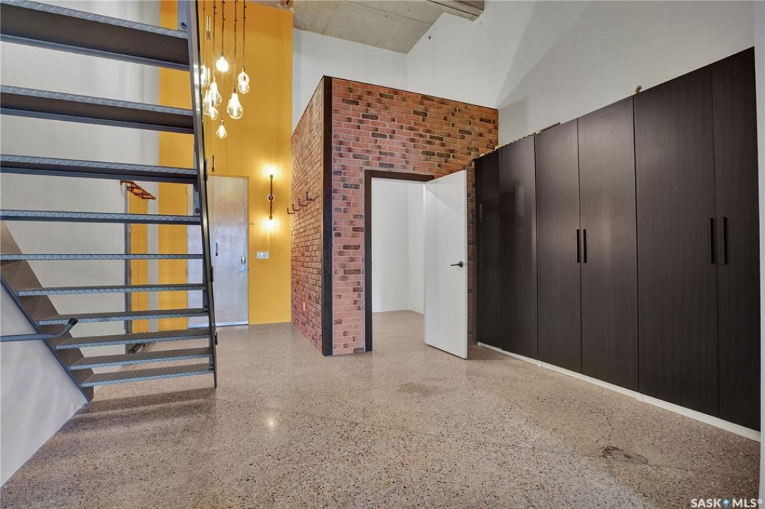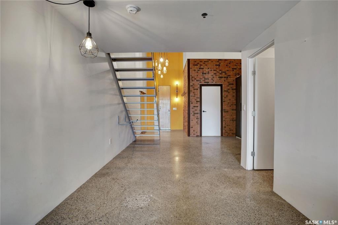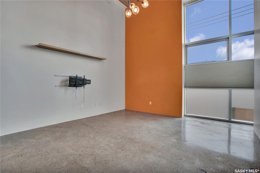 Welcome to #223–120 23rd Street East, located in the heart of downtown Saskatoon at the highly sought-after 2nd Avenue Lofts. This exceptional residence offers a truly distinctive urban living experience, blending industrial character with modern comfort. Polished concrete floors, exposed concrete beams, and an impressive 14-foot-tall by 9.5-foot-wide window create a striking sense of openness while flooding the space with natural light. The sleek matte-black kitchen is both stylish and functional, featuring an extensive bank of cabinetry, stainless steel appliances, and a substantial quartz island—ideal for both everyday living and entertaining. When you're not hosting at home, you'll appreciate being just steps from some of Saskatoon's best restaurants, cafés, Remai Modern Art Gallery, The Persephone Theatre and The Meewasin Valley River Trails. The spacious entry area provides an ideal work-from-home setup, while an additional constructed bedroom offers flexibility as a guest room, private office, or treatment space, complete with a conveniently located powder room. Upstairs, the generous primary bedroom overlooks the main living area, enhancing the loft-style ambiance. The four-piece bathroom has been tastefully renovated, and the unit includes all appliances as well as in-suite laundry for everyday convenience. One parking stall is included in the secure, heated underground parkade, which also provides dedicated bike storage. Condo fees include heat, water, and electricity. Residents enjoy an impressive array of amenities, including four dedicated rooms for fitness, cardio, ping pong, and a library or meeting space, along with an on-site building manager and 24-hour video security throughout common areas and exterior spaces. The rooftop patio, accessible from the third floor, is an ideal setting to barbecue, relax, and enjoy city views. Pets are permitted for owner-occupants with board approval, making this an exciting opportunity for downtown living.