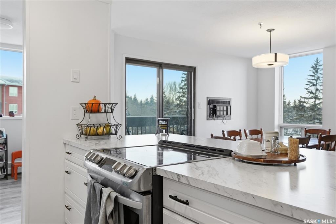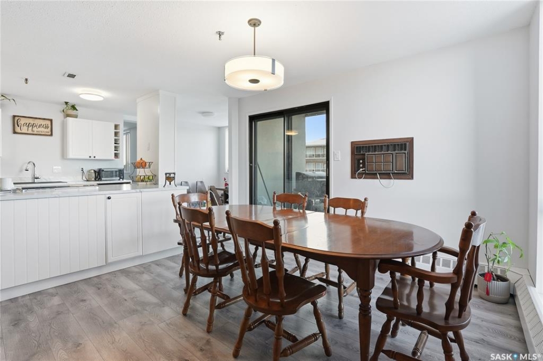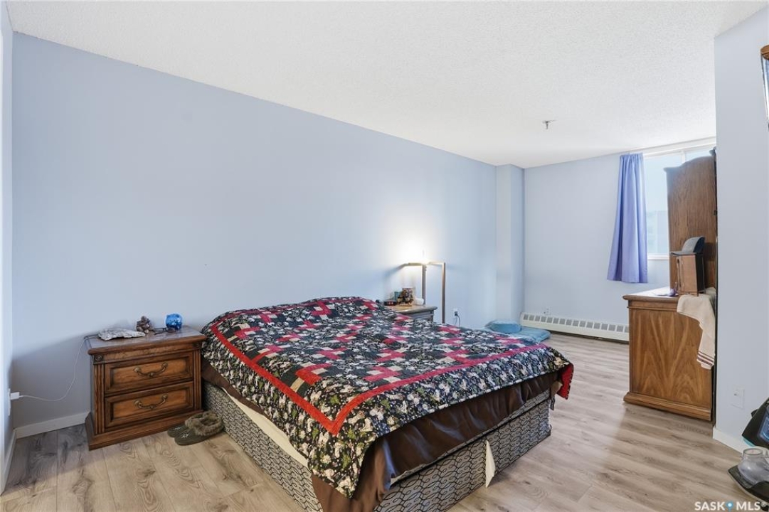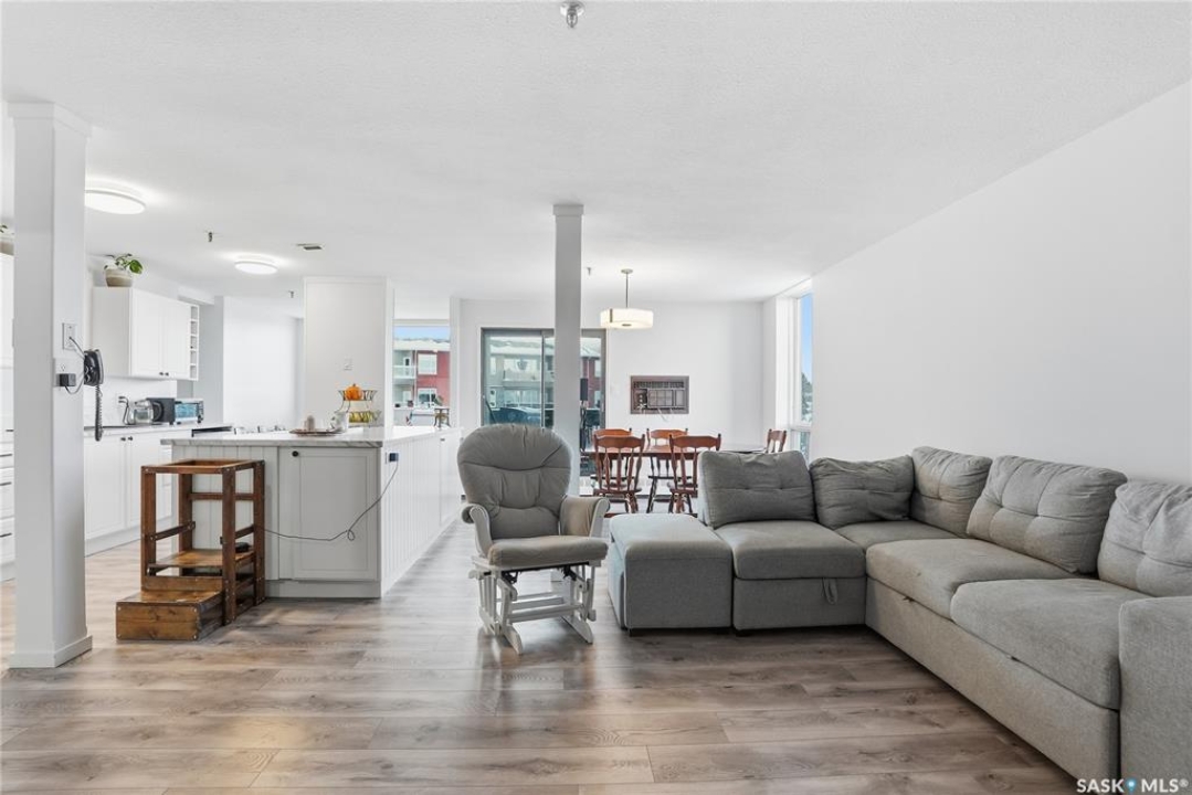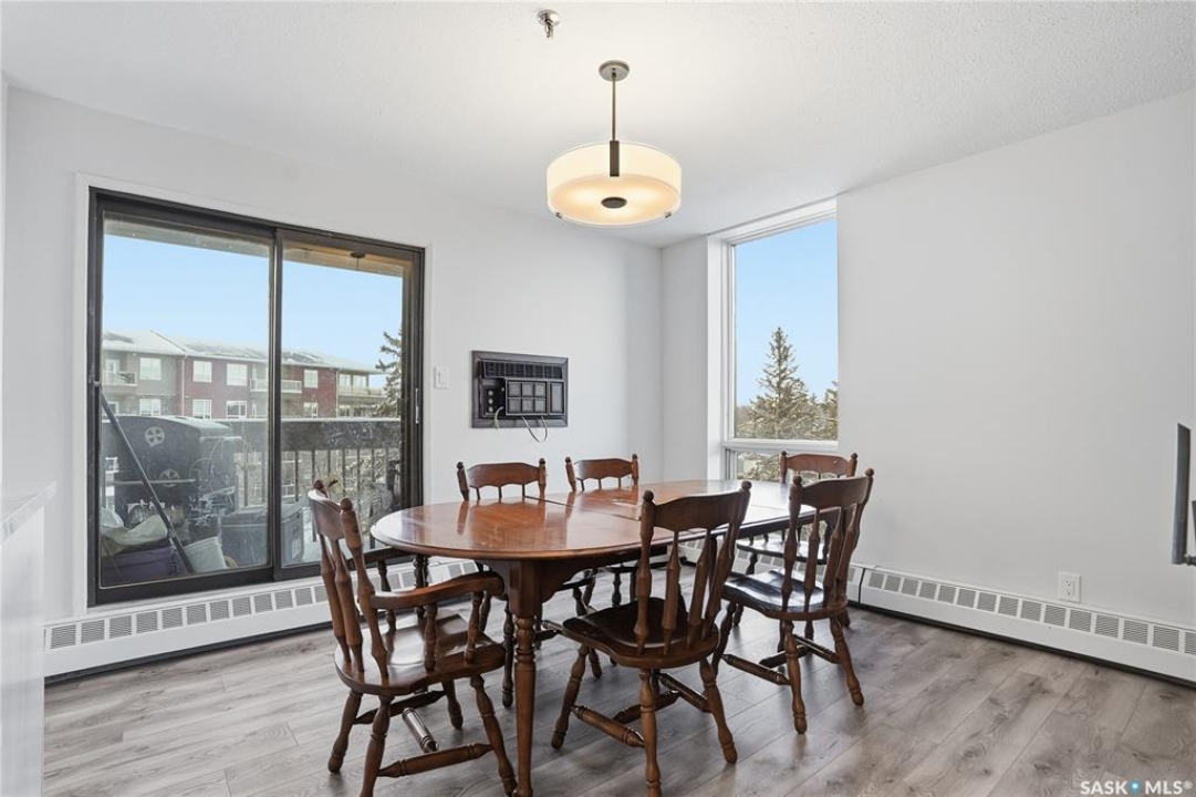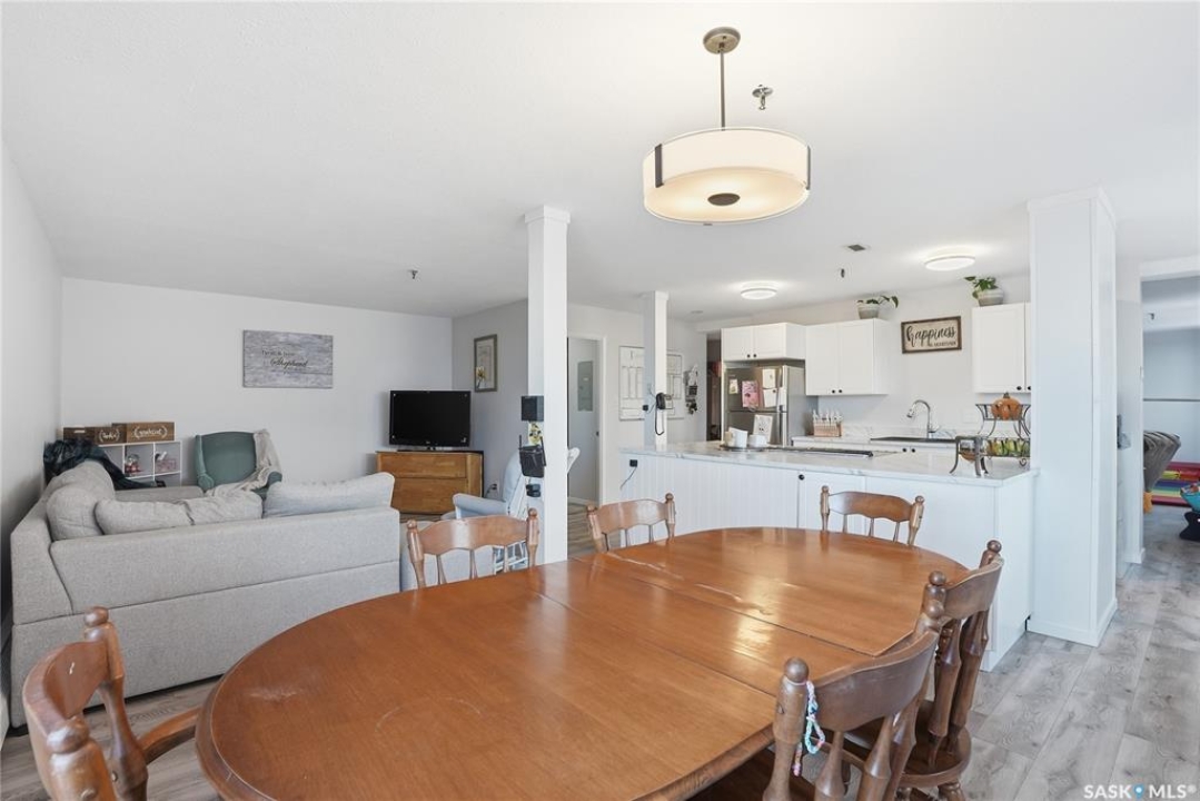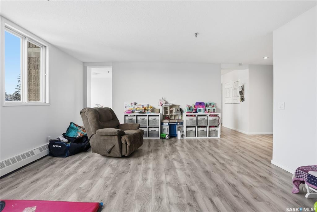 This beautifully renovated and exceptionally spacious corner unit in the sought-after Genesee View high-rise offers over 1600 sq ft of bright, open living in the desirable River Heights neighbourhood, featuring an updated layout with several walls removed to create a modern flow, new laminate flooring, fresh paint, an updated kitchen with newer appliances, and bathroom improvements, plus the fireplace has been removed in the family room to maximize flexibility,this unit could even be reconfigured to accommodate a third bedroom. Along with two bedrooms, two living areas, two dining spaces, a generous balcony perfect for BBQs, in-suite laundry, plenty of storage, and a primary suite with walk-in closet and deep soaker tub, you'll also enjoy your own private sauna, �dry or wet for cozy winter nights. The building itself has seen major upgrades, including new boilers, new exterior stucco, updated elevators, and a repaired hot tub last year, adding peace of mind for future owners. Residents enjoy fantastic amenities such as an indoor pool, hot tub, amenities room, two elevators, and a Canada Post parcel locker in the lobby. Suites of this size, condition, and value are incredibly rare, and the location,just moments from Meewasin Park, the river, bus stops, Lawson Heights Mall, and countless amenities,makes it even more appealing.