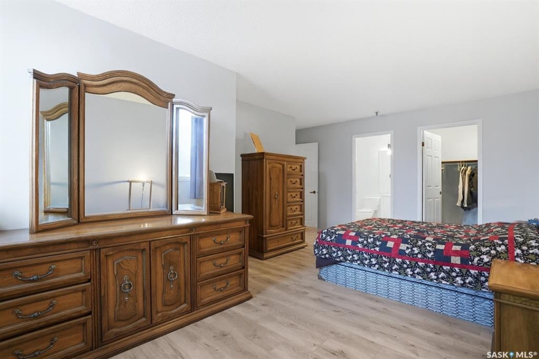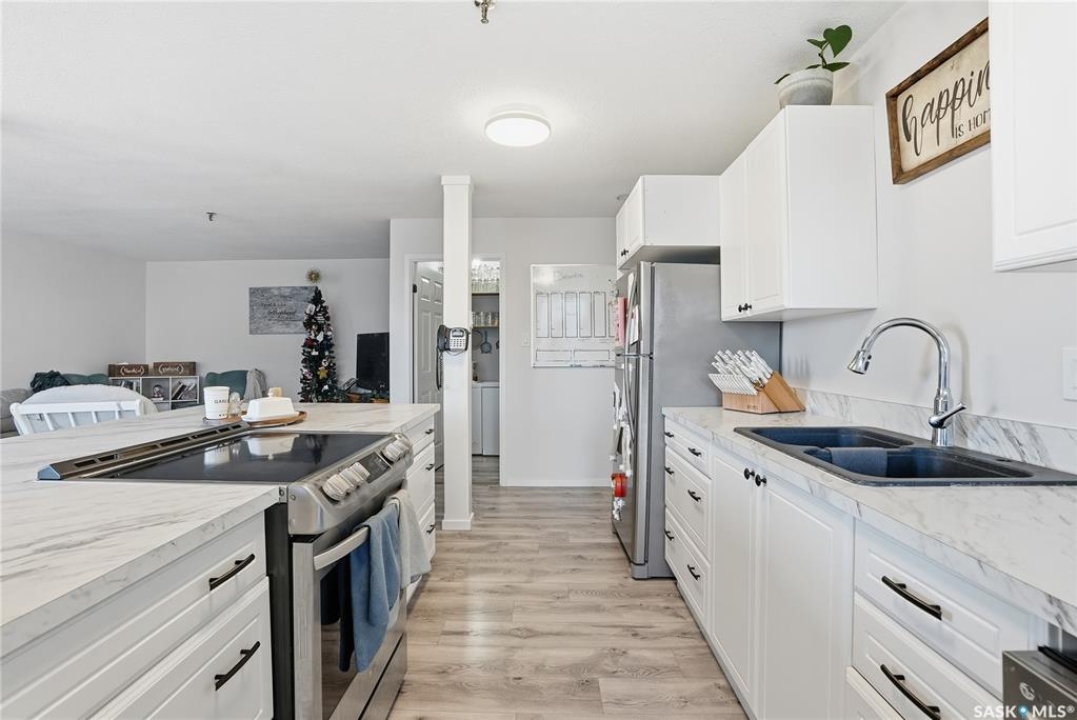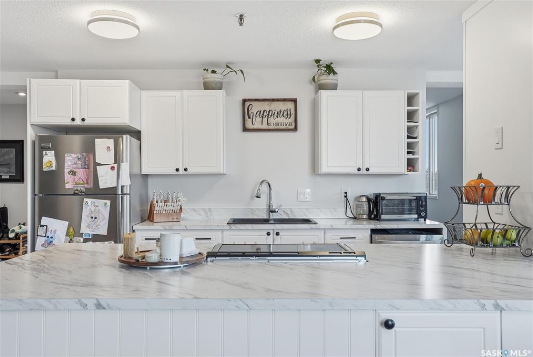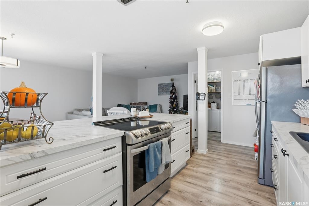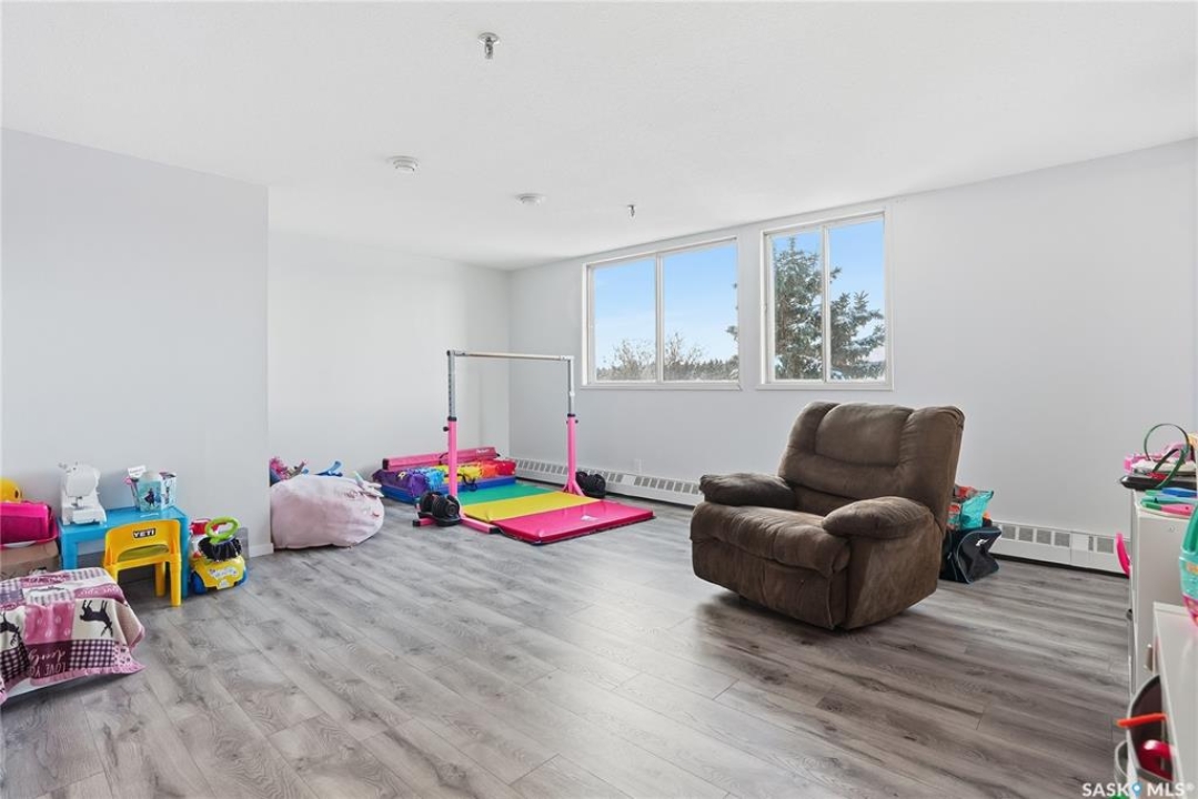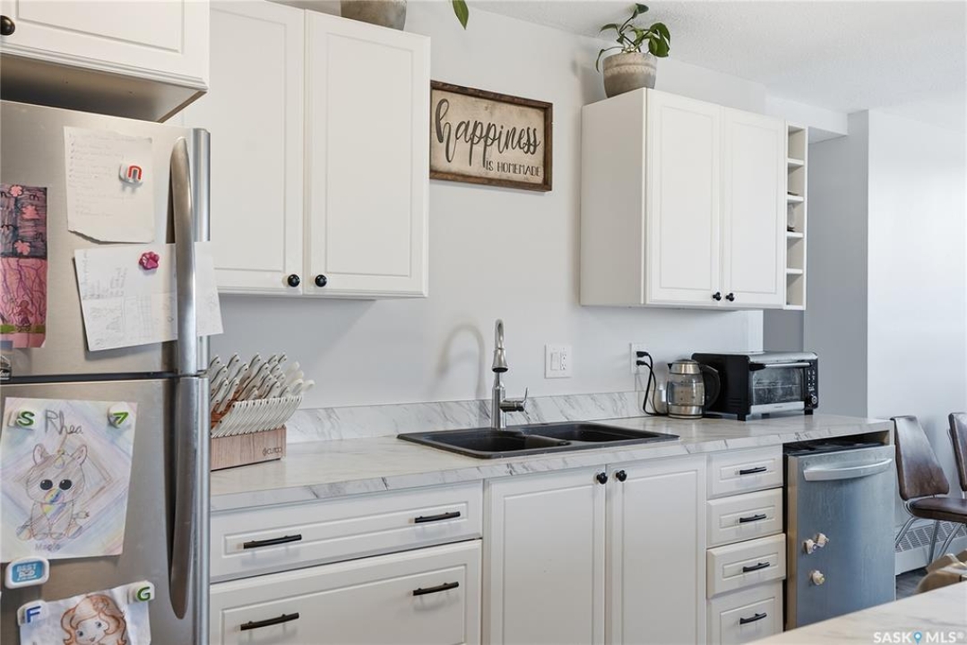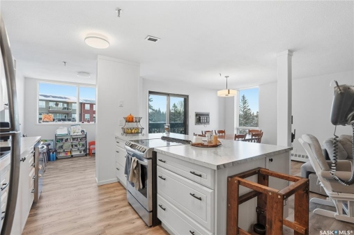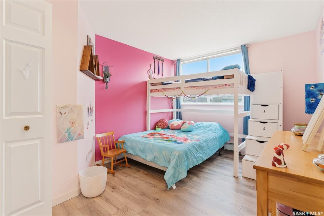 This beautifully renovated and exceptionally spacious corner unit in the sought-after Genesee View high-rise offers over 1600 sq ft of bright, open living in the desirable River Heights neighbourhood, featuring an updated layout with several walls removed to create a modern flow, new laminate flooring, fresh paint, an updated kitchen with newer appliances, and bathroom improvements, plus the fireplace has been removed in the family room to maximize flexibility,this unit could even be reconfigured to accommodate a third bedroom. Along with two bedrooms, two living areas, two dining spaces, a generous balcony perfect for BBQs, in-suite laundry, plenty of storage, and a primary suite with walk-in closet and deep soaker tub, you'll also enjoy your own private sauna, �dry or wet for cozy winter nights. The building itself has seen major upgrades, including new boilers, new exterior stucco, updated elevators, and a repaired hot tub last year, adding peace of mind for future owners. Residents enjoy fantastic amenities such as an indoor pool, hot tub, amenities room, two elevators, and a Canada Post parcel locker in the lobby. Suites of this size, condition, and value are incredibly rare, and the location,just moments from Meewasin Park, the river, bus stops, Lawson Heights Mall, and countless amenities,makes it even more appealing.