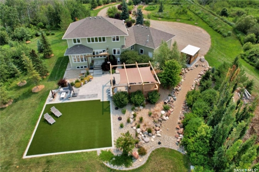 Welcome the perfect Saskatchewan paradise — an extraordinary 2-storey Westridge built home set on just over 5 beautifully landscaped acres, only 12 minutes from Saskatoon. This property offers the perfect blend of luxury, space, and outdoor lifestyle, with every detail thoughtfully designed for comfort and style. You'll be welcomed by the gorgeous East facing porch perfect for a morning coffee. Step through the grand front entrance into a bright, open interior filled with natural light. The open floor concept allows for the perfect family or entertaining setting. The kitchen's oversized island and gorgeous quartz countertop with a corner pantry make it the perfect space to cook and connect. The main floor features an office, large mudroom with laundry and a stunning primary bedroom retreat, complete with a spa-like ensuite and a spacious walk-in closet. Upstairs, you'll find three more bedrooms plus a large bonus room, offering plenty of space for family, guests and everything in between. Outside, the exquisite yard is an entertainer's paradise. Enjoy summer evenings with your very own outdoor kitchen, wood-fired pizza oven, and above-ground pool, all set against the backdrop of breathtaking Saskatchewan sunsets. A heated triple attached garage provides ample space for vehicles, toys, and tools, making this property as functional as it is beautiful.
